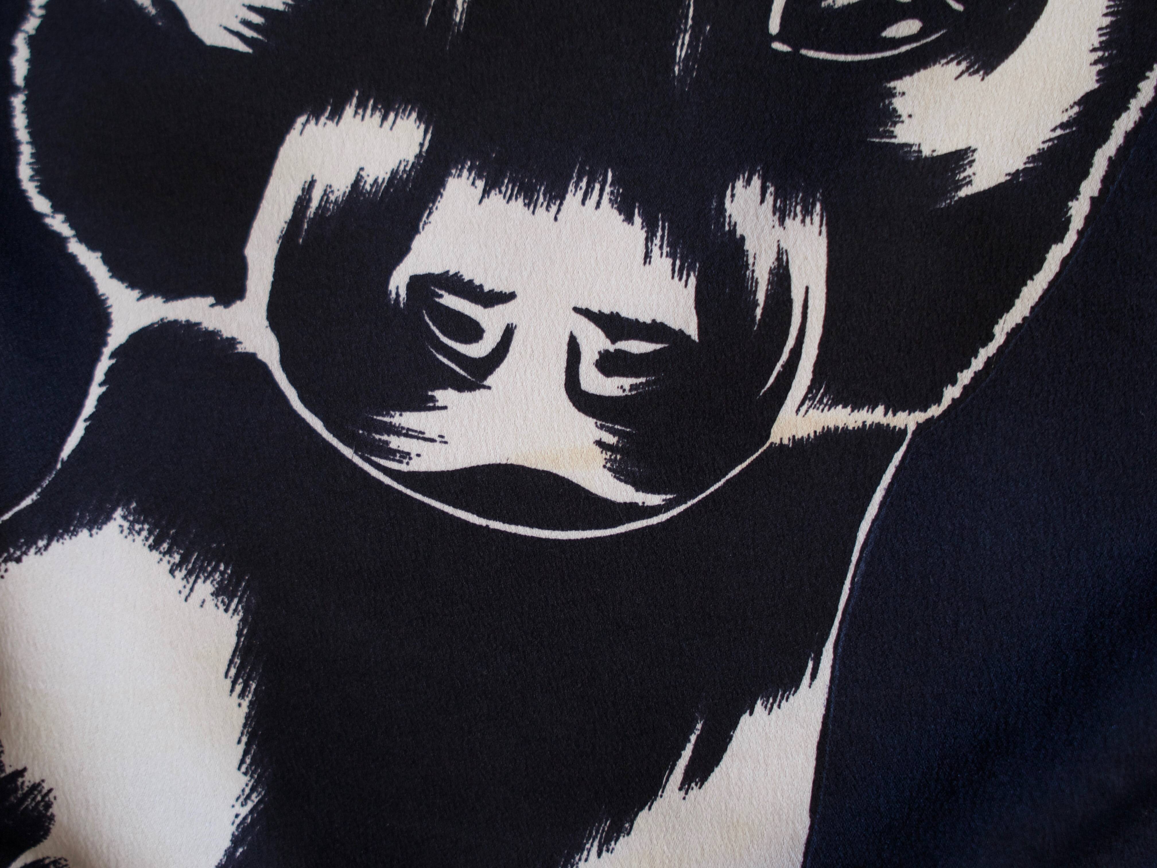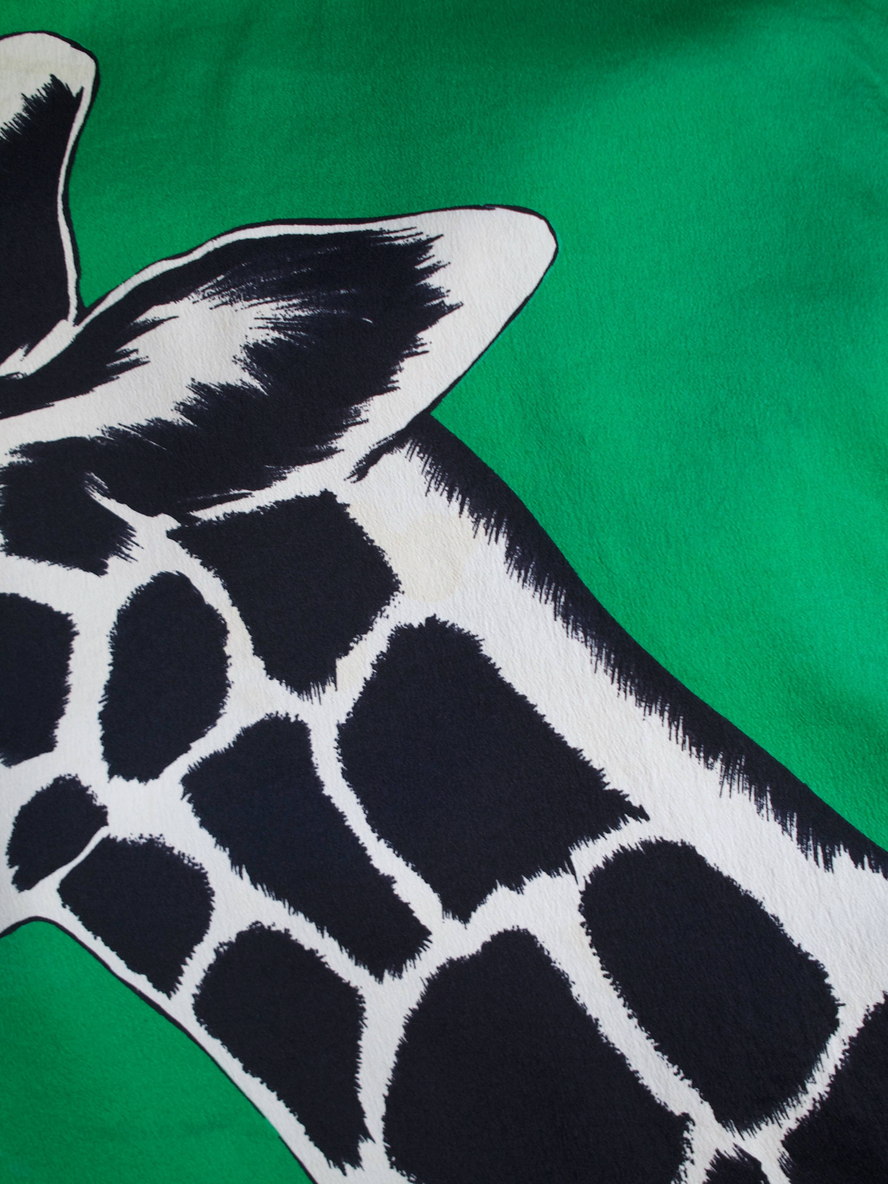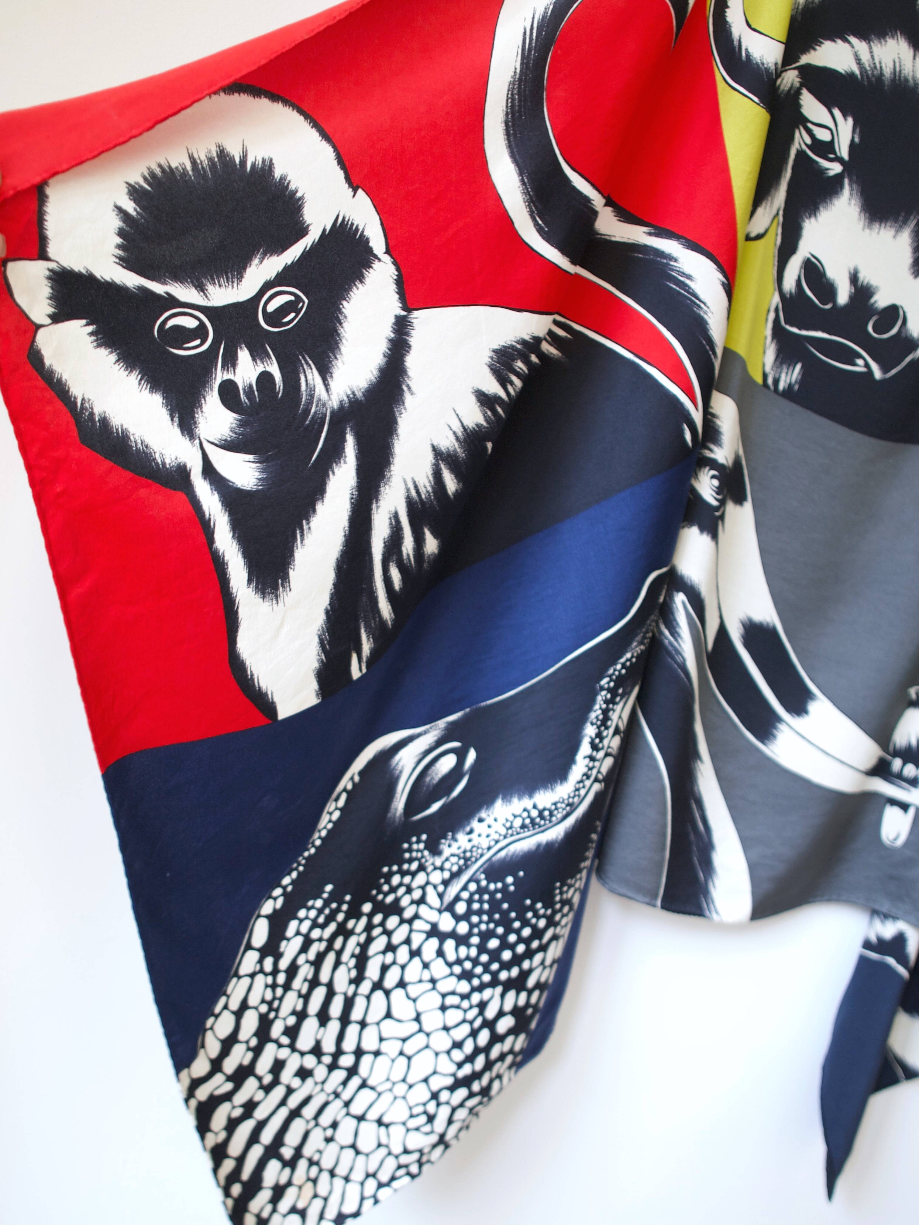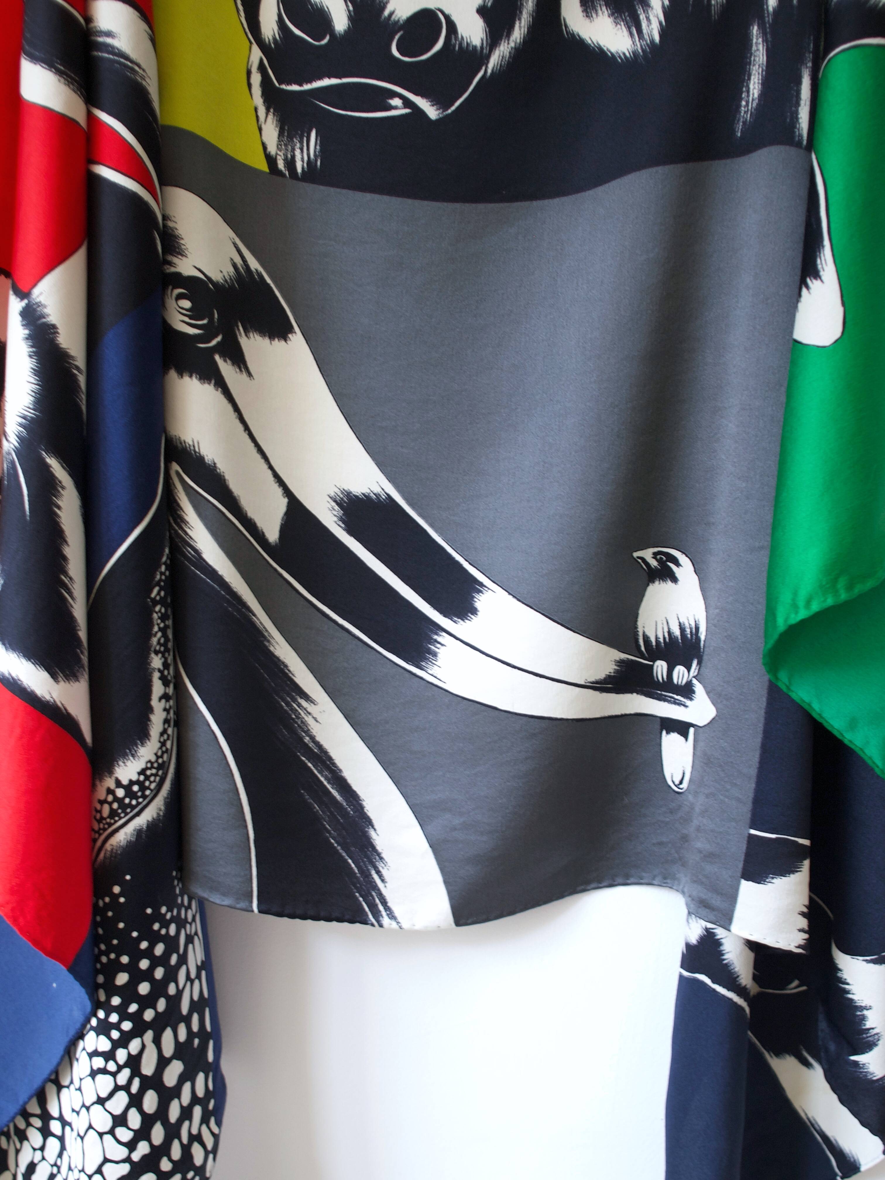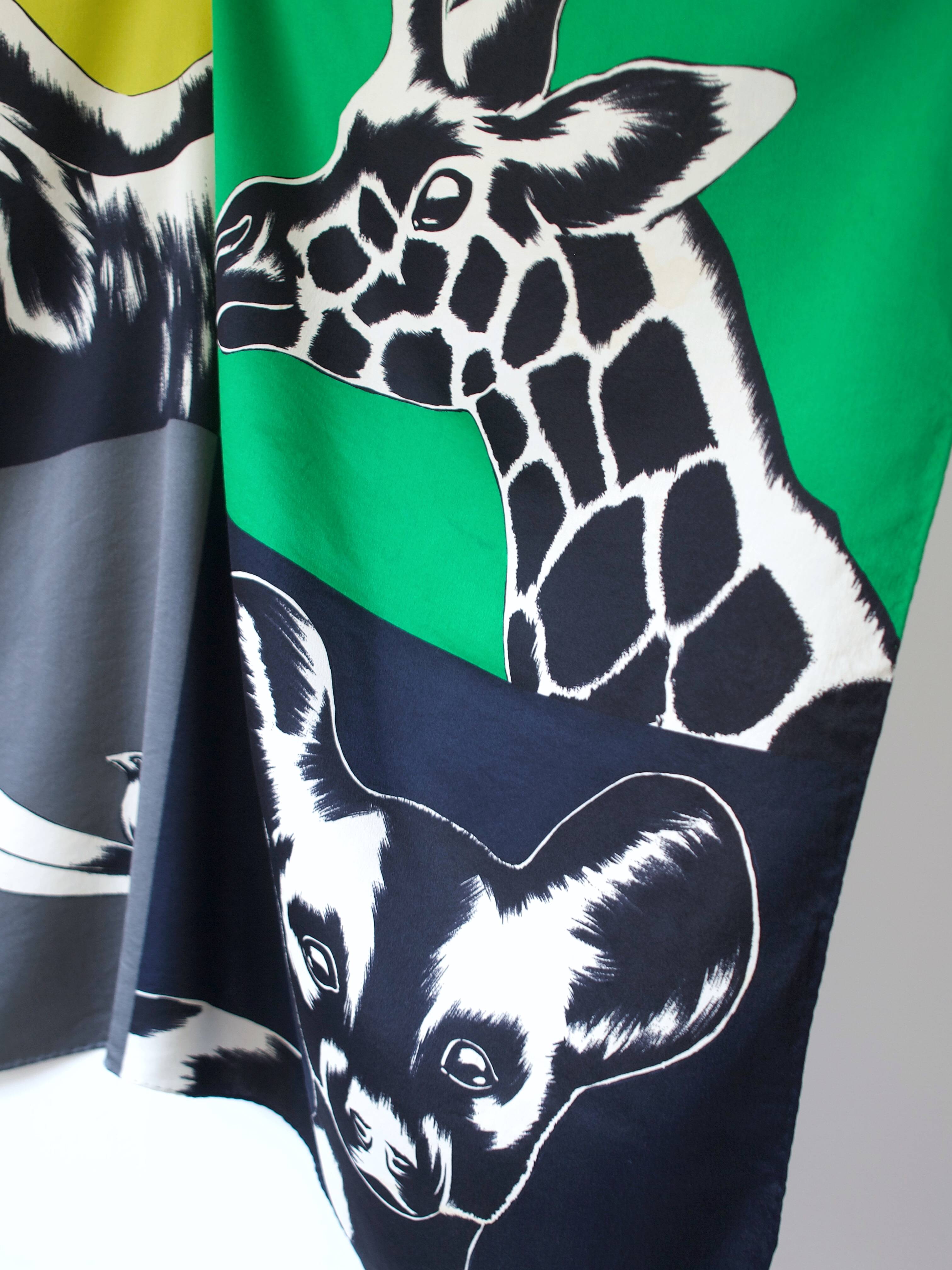 Bardzo duża jedwabna chusta we wzór afrykańskich zwierząt. Ręcznie rolowana. W niektórych miejscach ma plamy, pokazane na zdjęciach. Gubią się we wzorze i nie są widoczne.