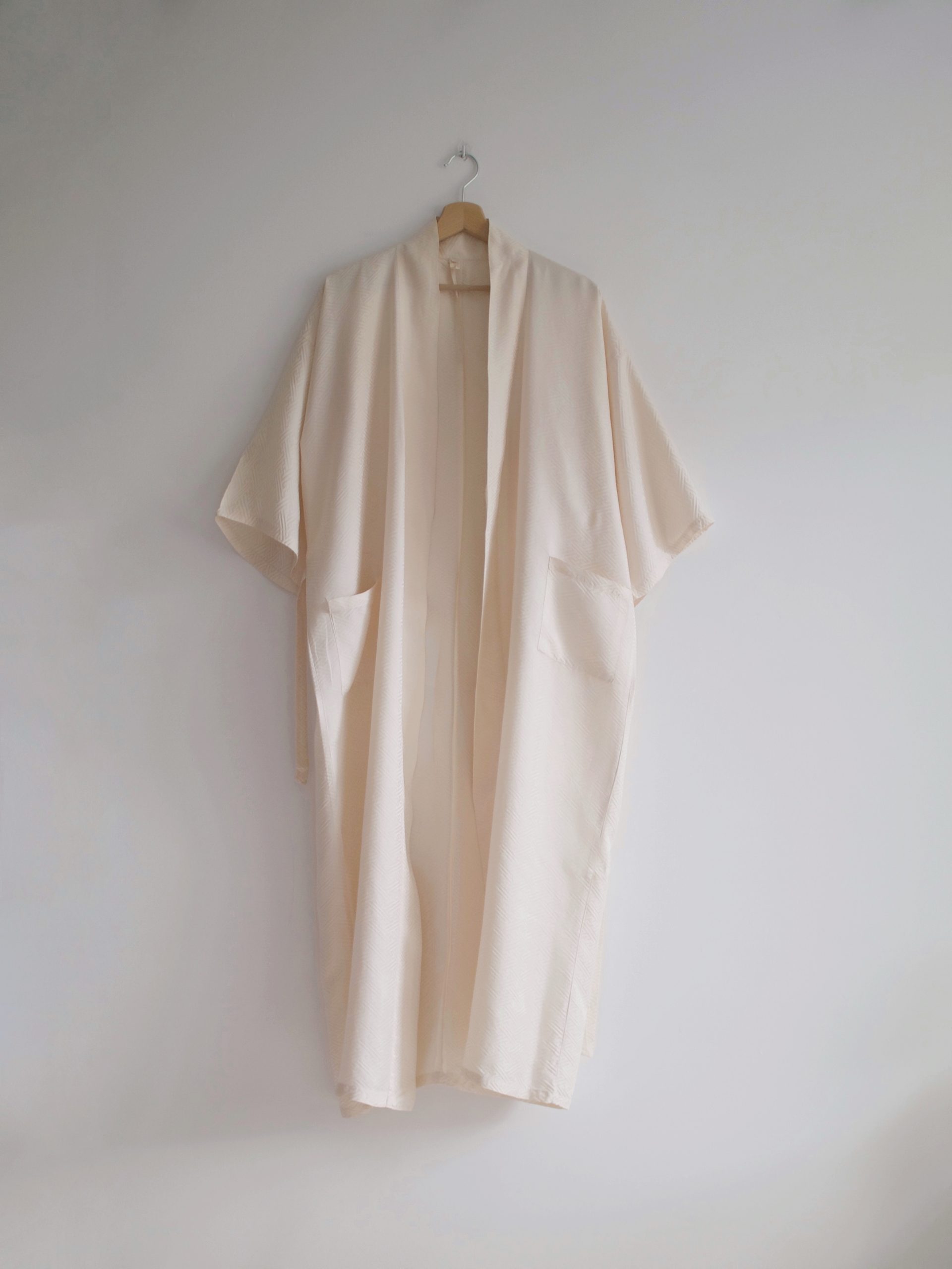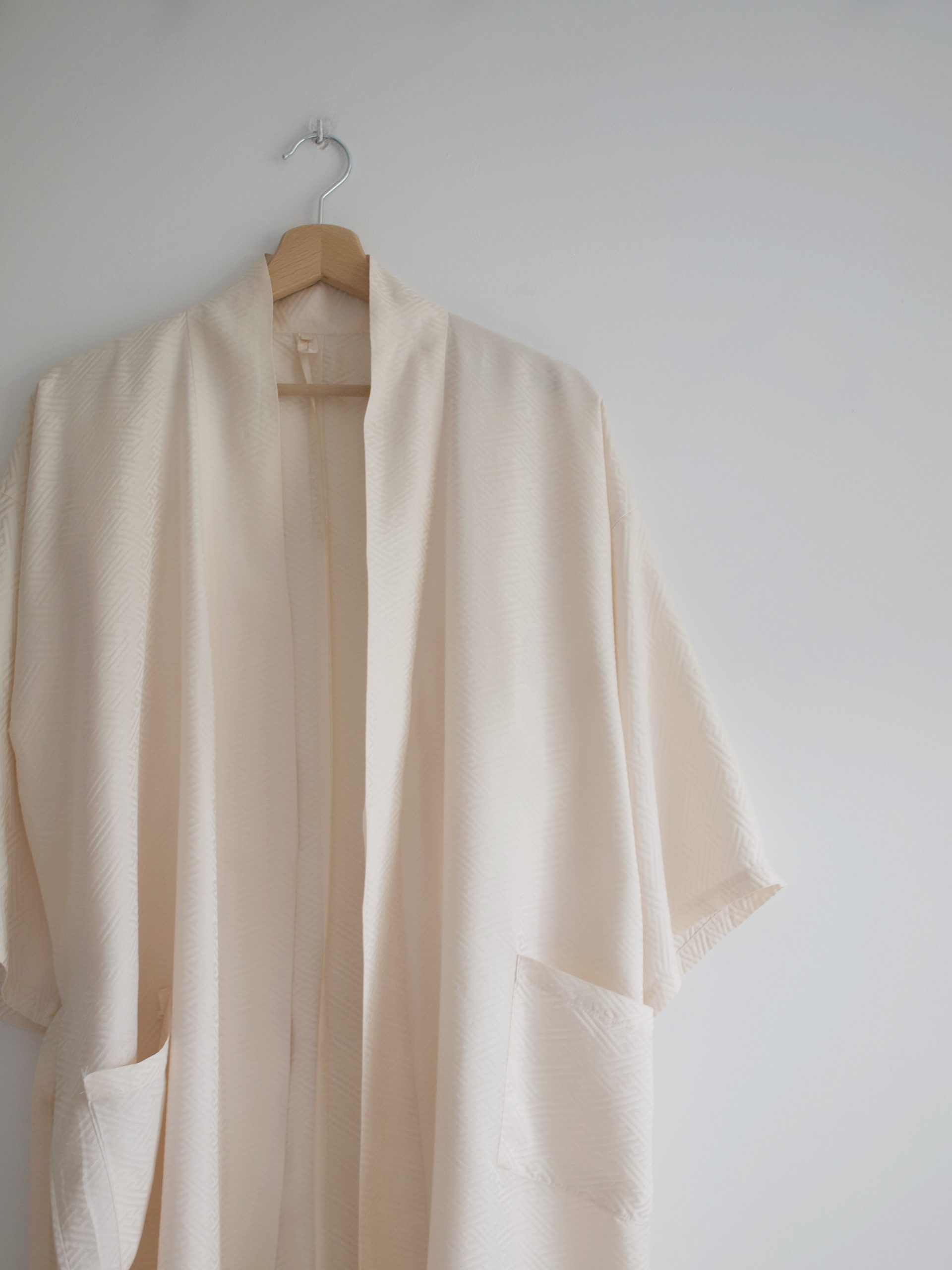 Szlafrok vintage o kimonowym kroju. Wykonany z porządnego jedwabiu w tłoczone wzory. Z kieszeniami oraz paskiem.