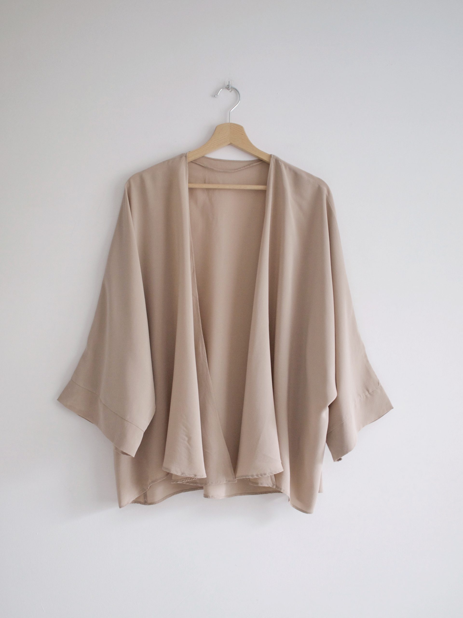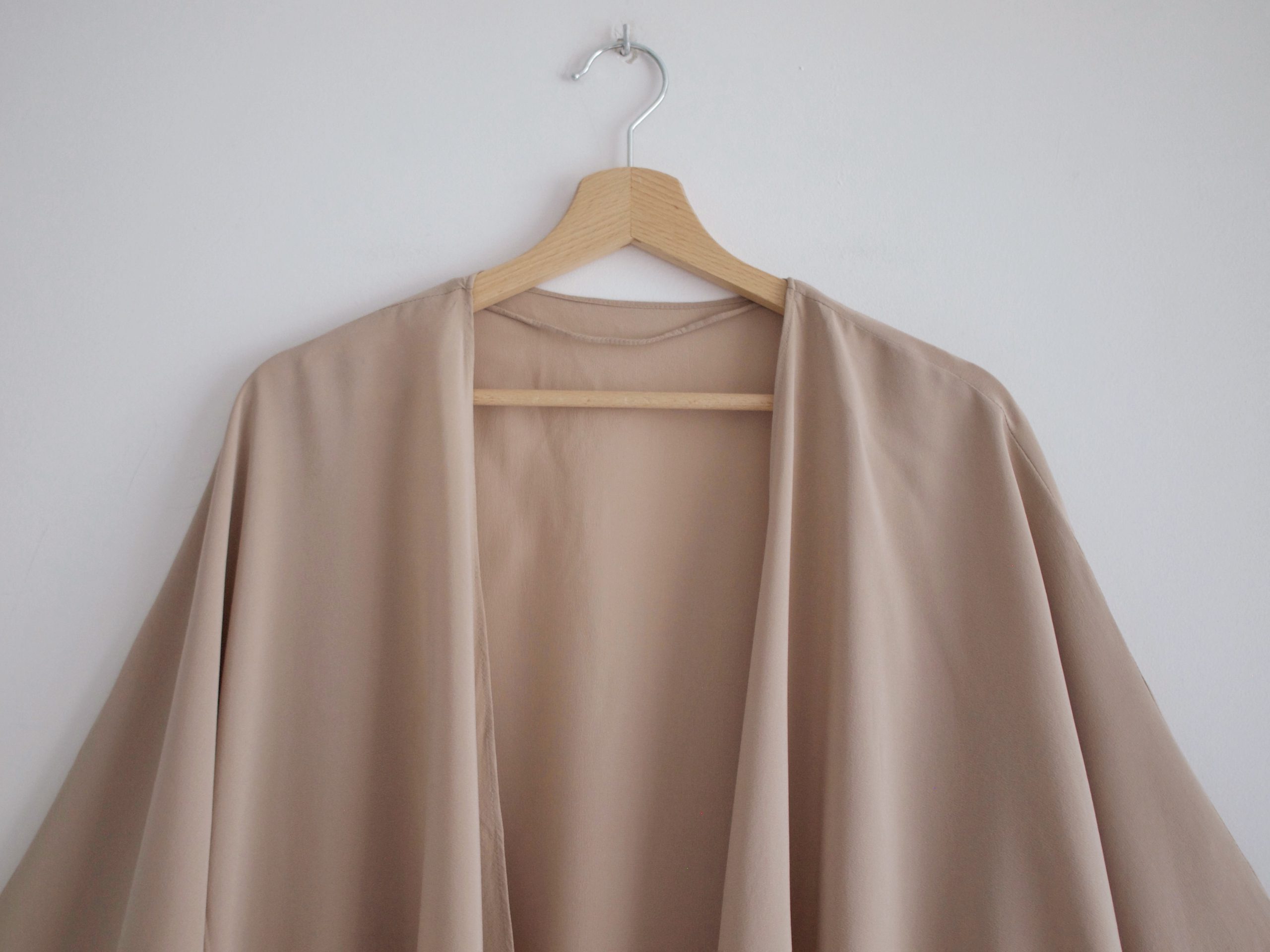 Narzutka o kimonowym fasonie, szyta według czyjegoś projektu. Brak metki ze składem, jest to na 100% jedwab, bardzo przyjemny w dotyku. Ze względu na fason polecam jako one size. Bez wad.