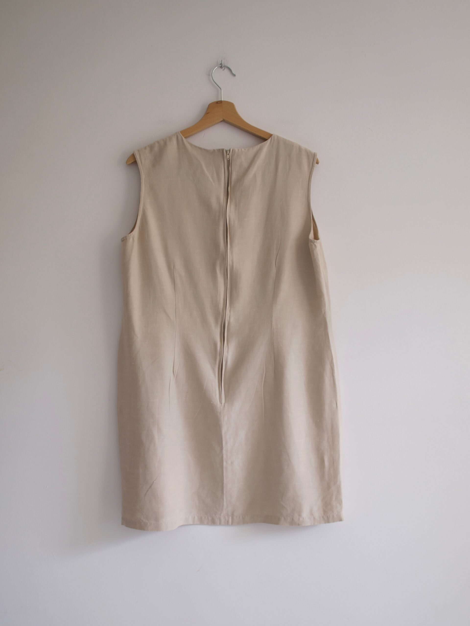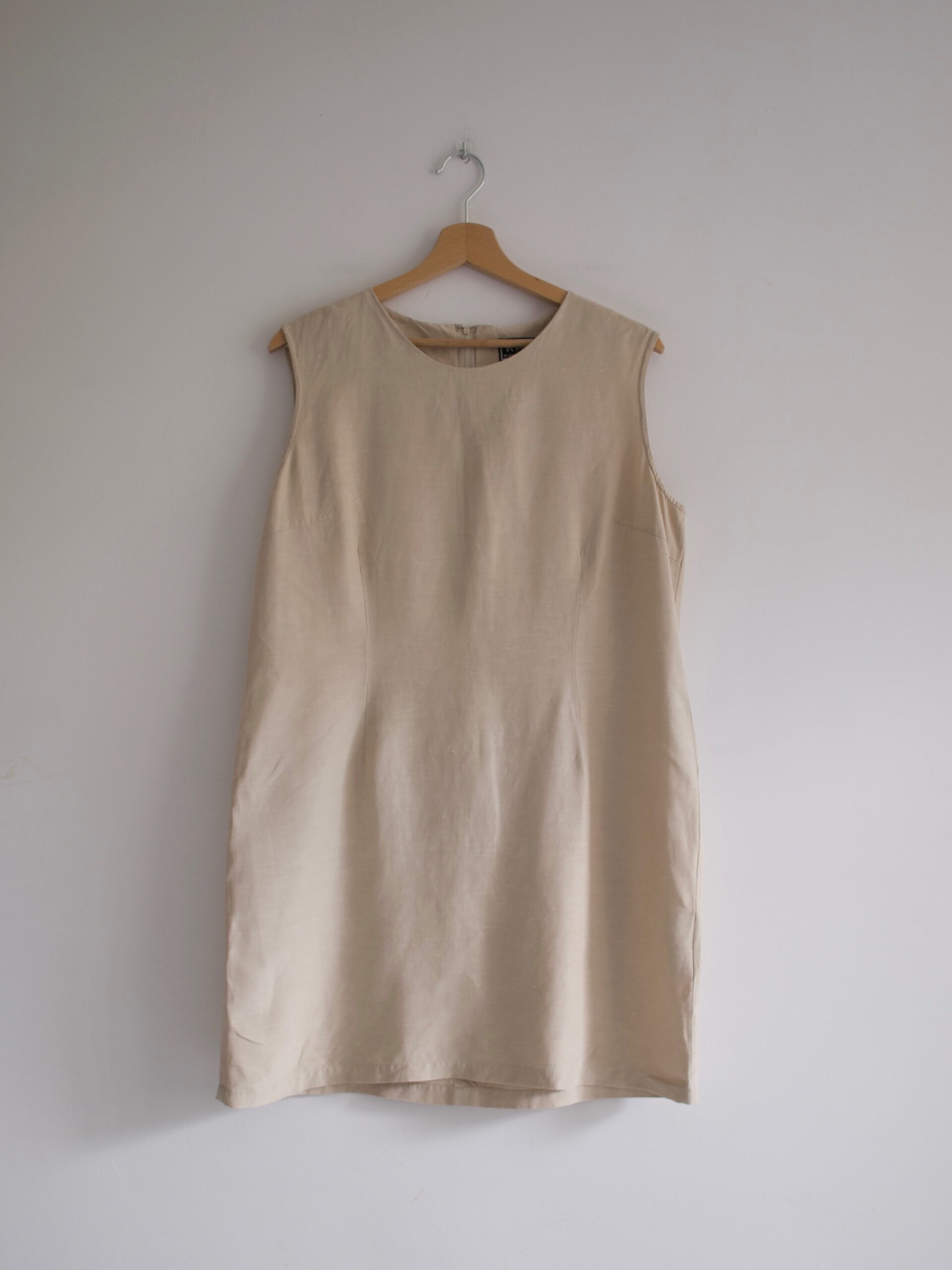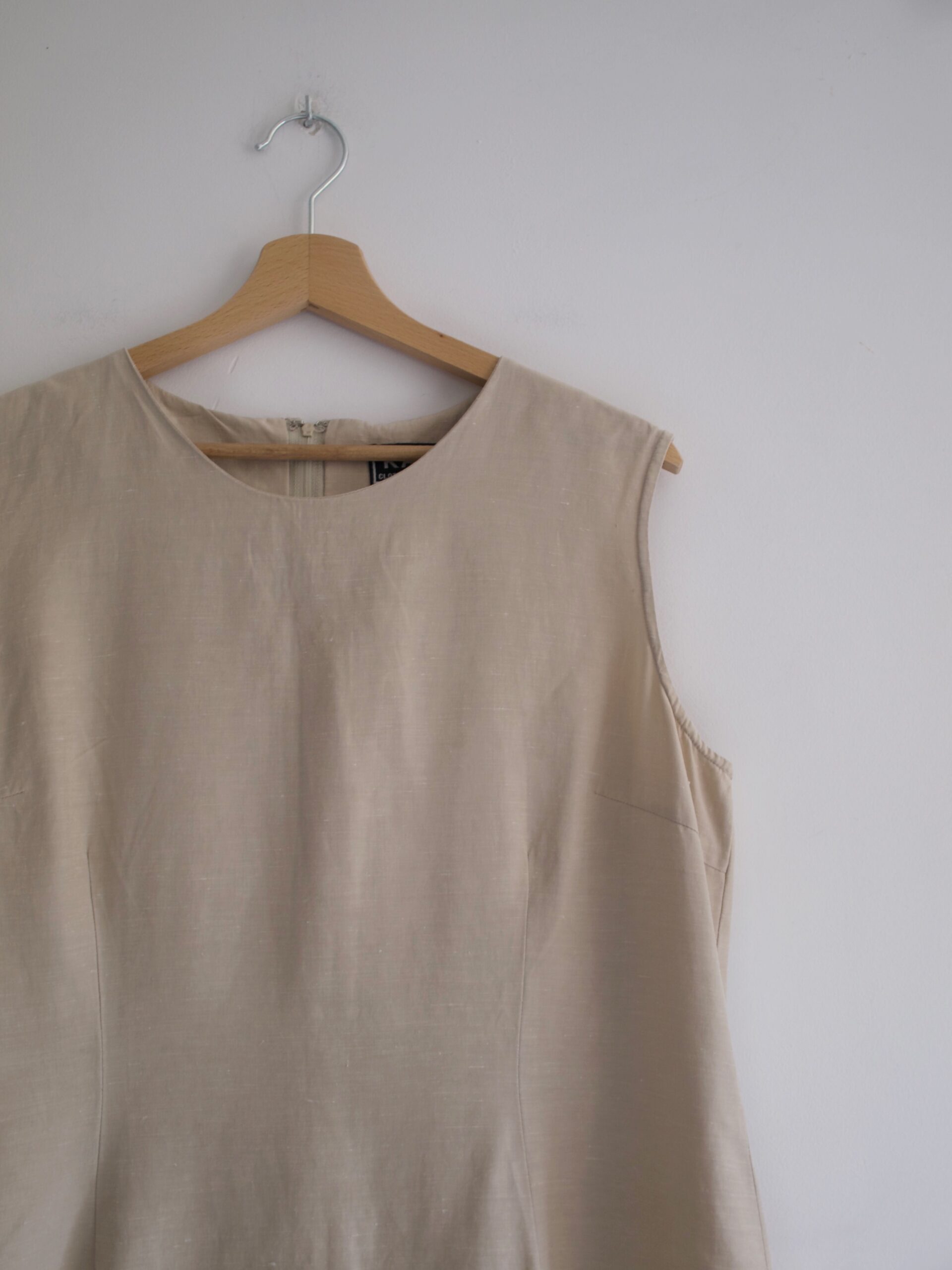 Minimalistyczna sukienka vintage. Wykonana z mieszanki jedwabiu oraz lnu, ma charakterystyczną strukturę materiału.