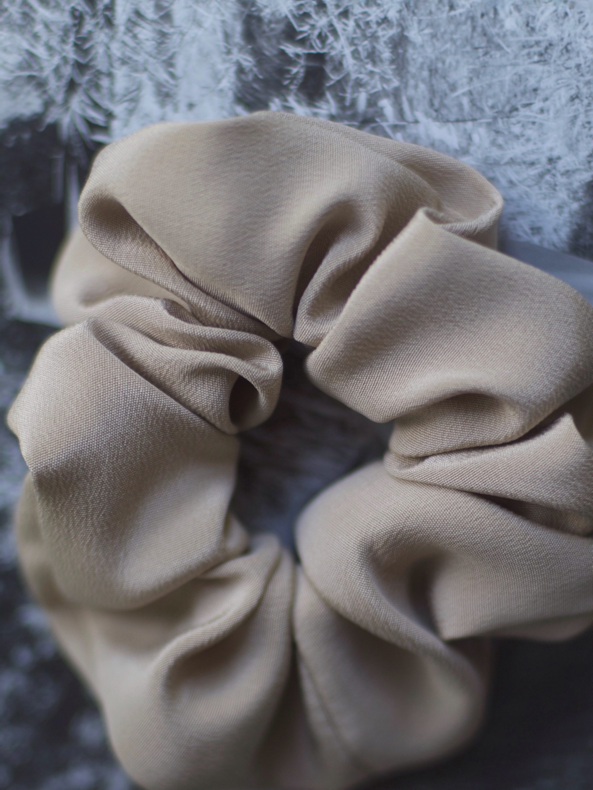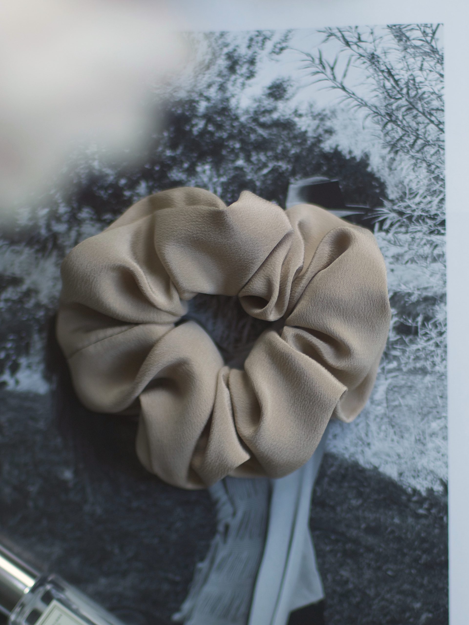 Jedwabna gumka do włosów szyta z materiału z recyklingu. 100% jedwab, średnica: około 10 cm.