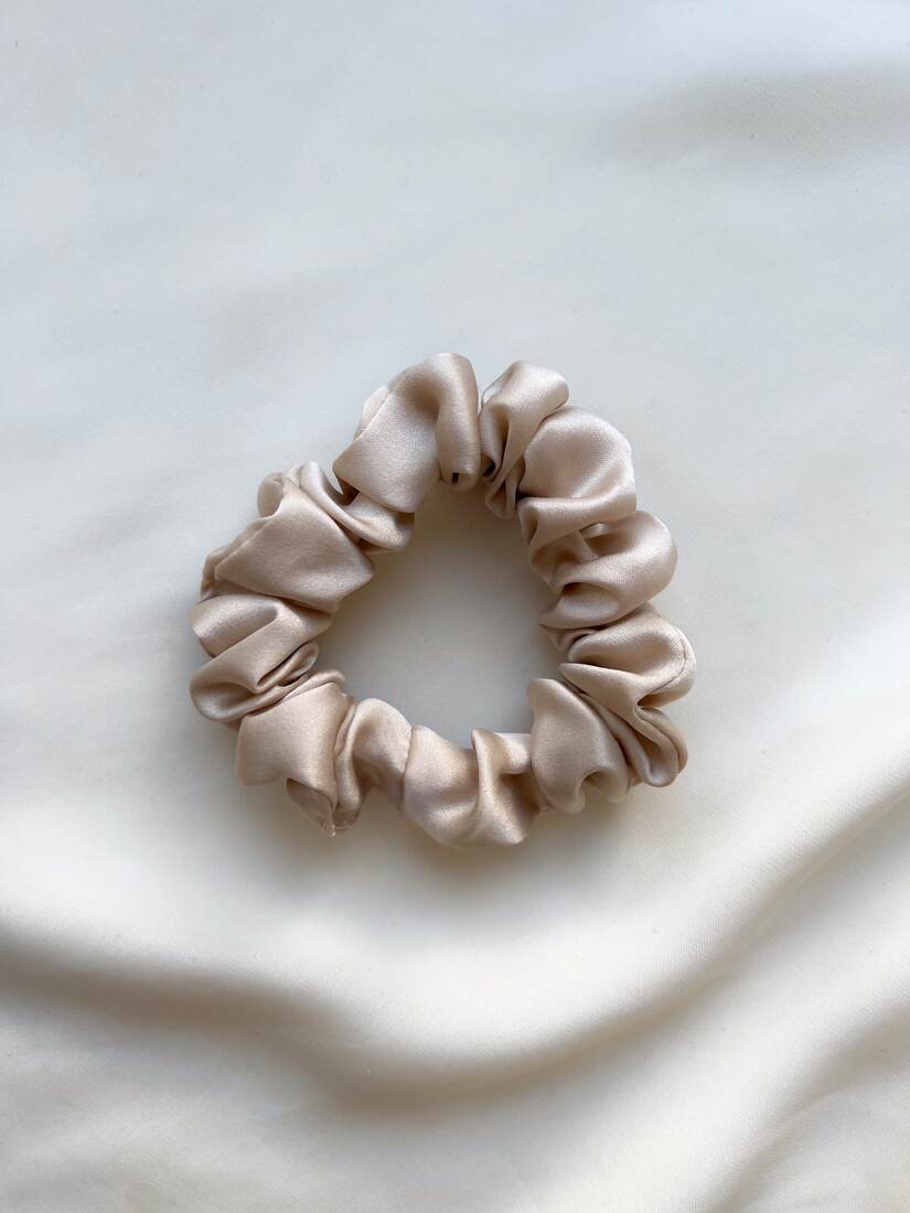 Jedwabna gumka do włosów szyta z materiału z recyklingu. 100% jedwab, średnica: około 10 cm.