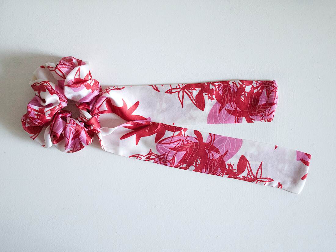 Jedwabna gumka do włosów szyta z materiału z recyklingu. 100% jedwab, średnica: około 10 cm, długość wiązania ok. 23*2 cm. Wstążkę można nosić oddzielnie.