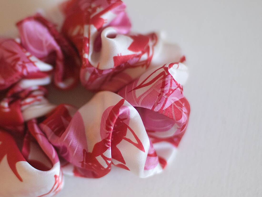 Jedwabna gumka do włosów szyta z materiału z recyklingu. 100% jedwab, średnica: około 10 cm.
