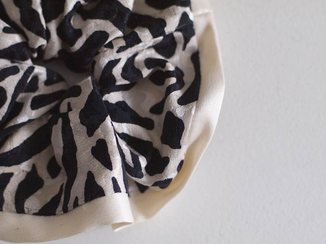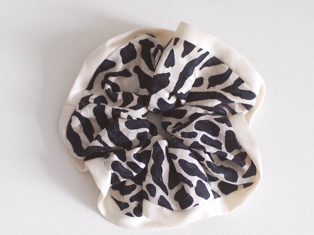 Duża jedwabna gumka do włosów szyta z materiału z recyklingu. 100% jedwab, średnica: około 13 cm.
