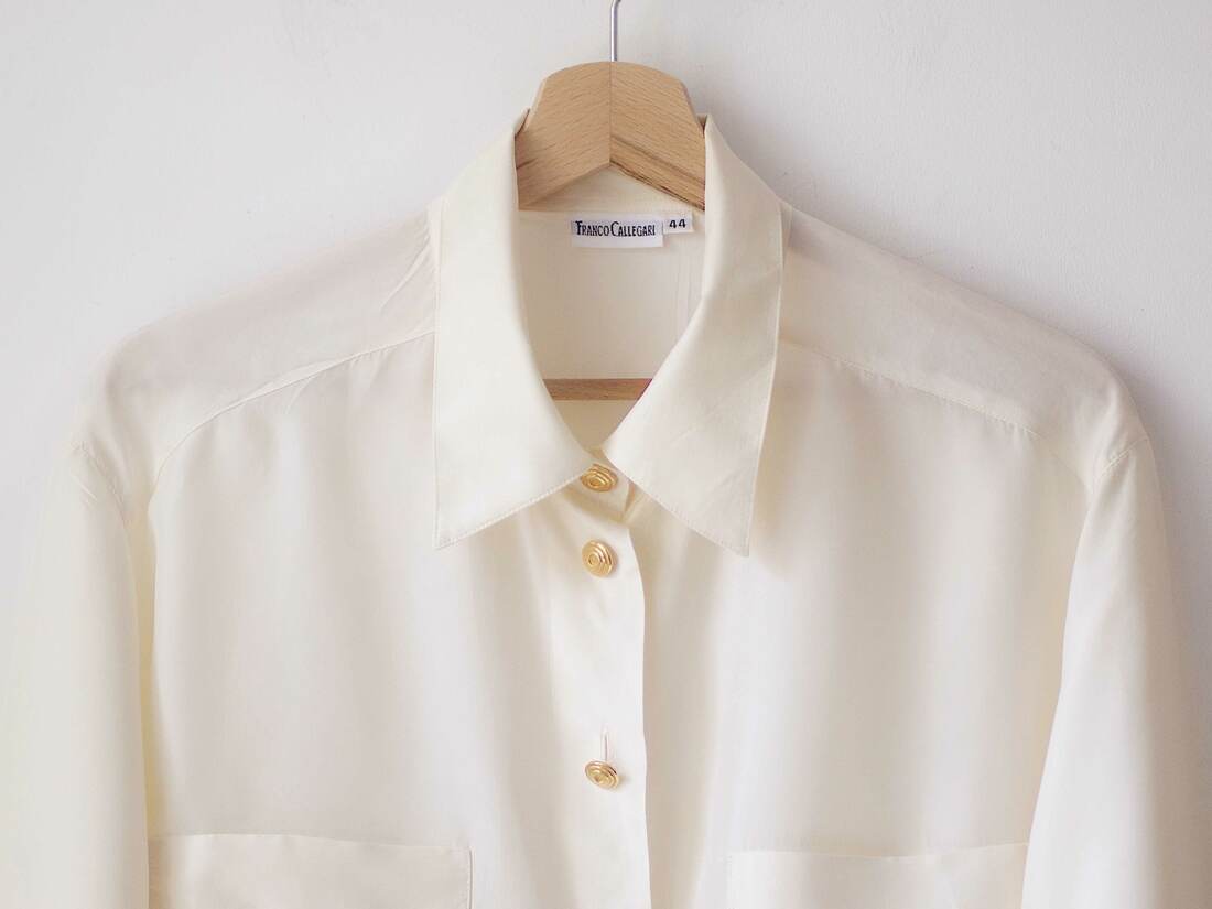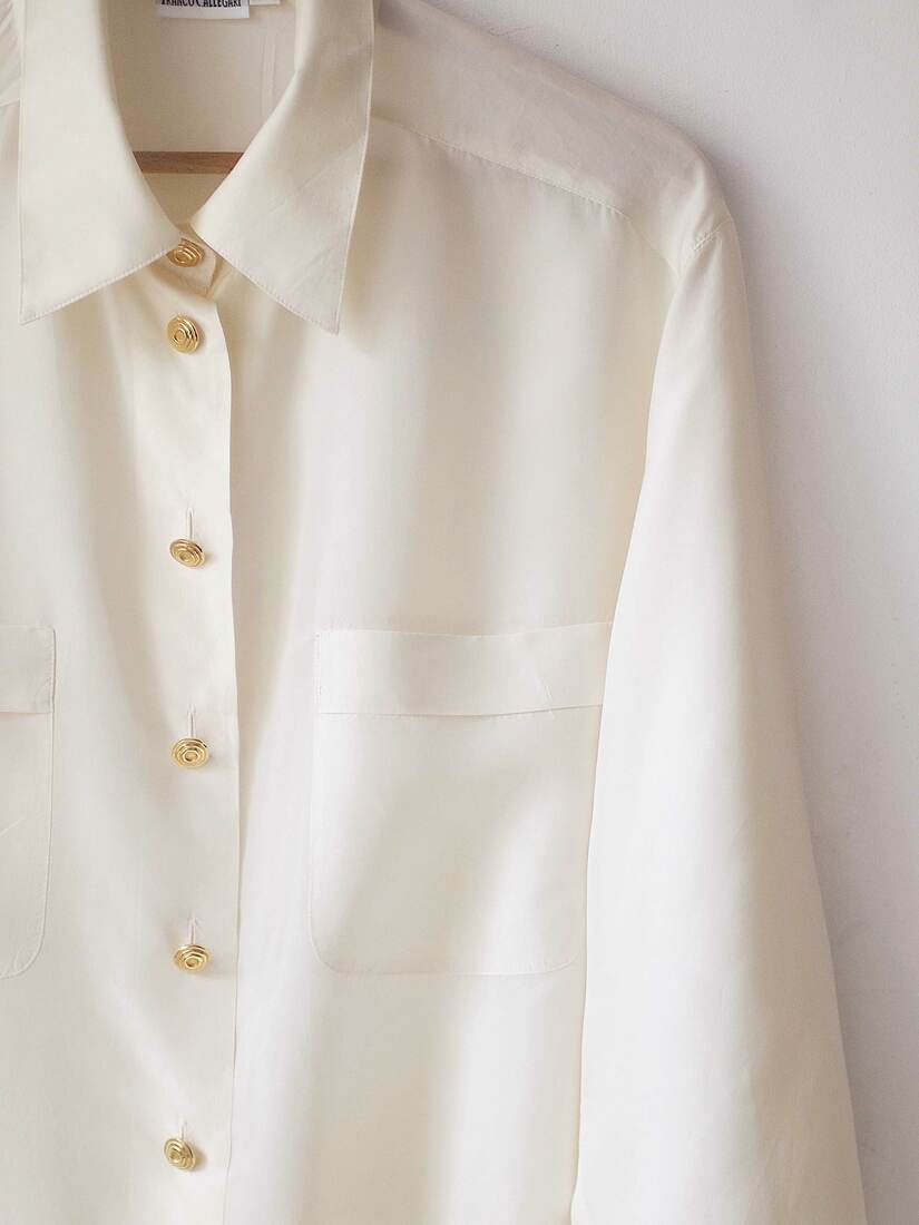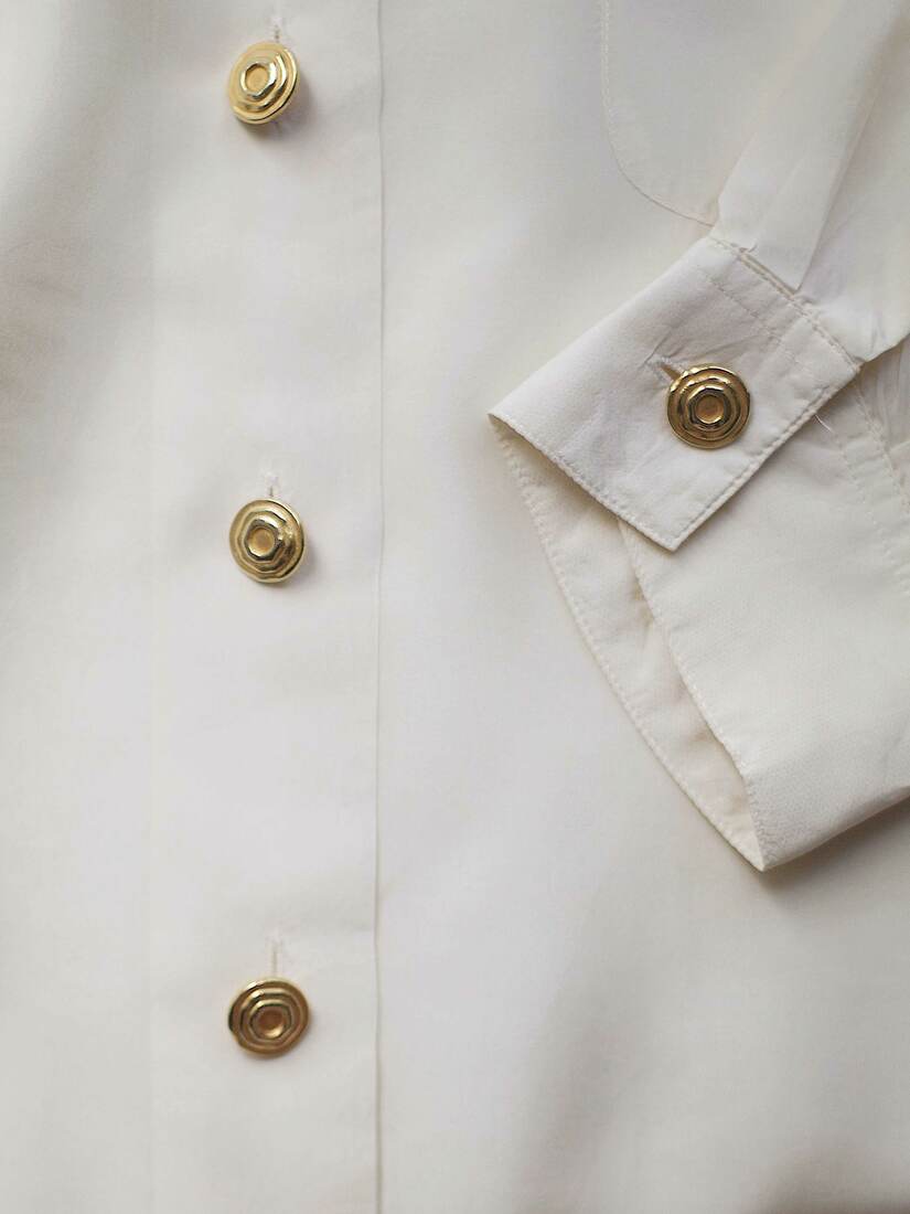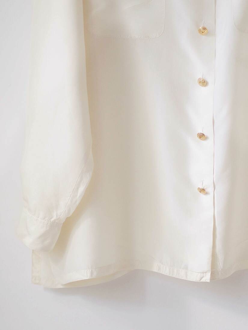 Kremowa koszula vintage, z pięknymi, pozłacanymi guzikami. 100% jedwab. Rozmiar z metki 44, będzie pasować na L-XL, lub na mniejsze jako oversize. Bardzo dobry stan.