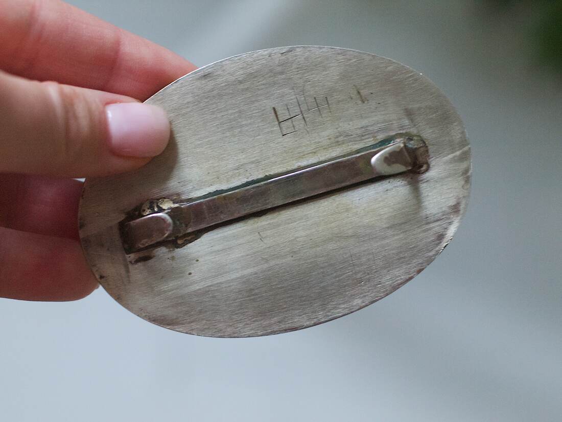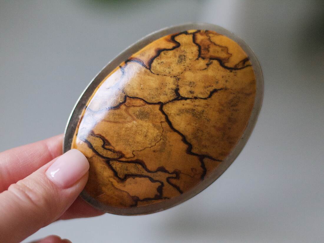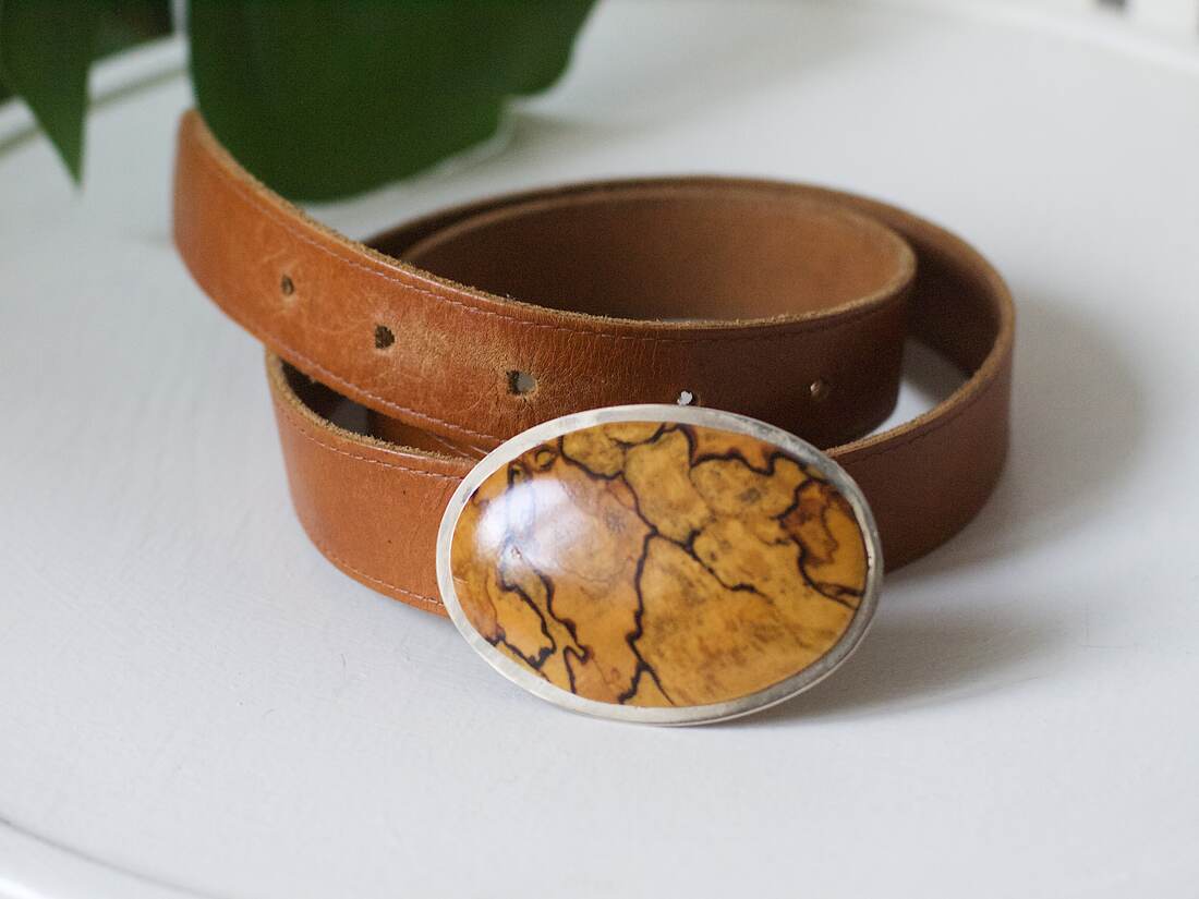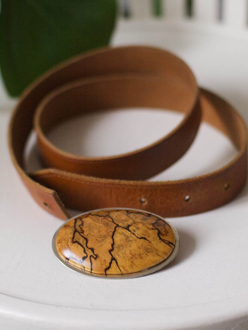 Skórzany pasek vintage z piękną klamrą imitującą bursztyn. Bardzo dobry stan.