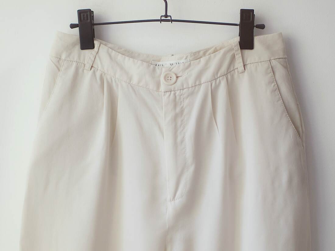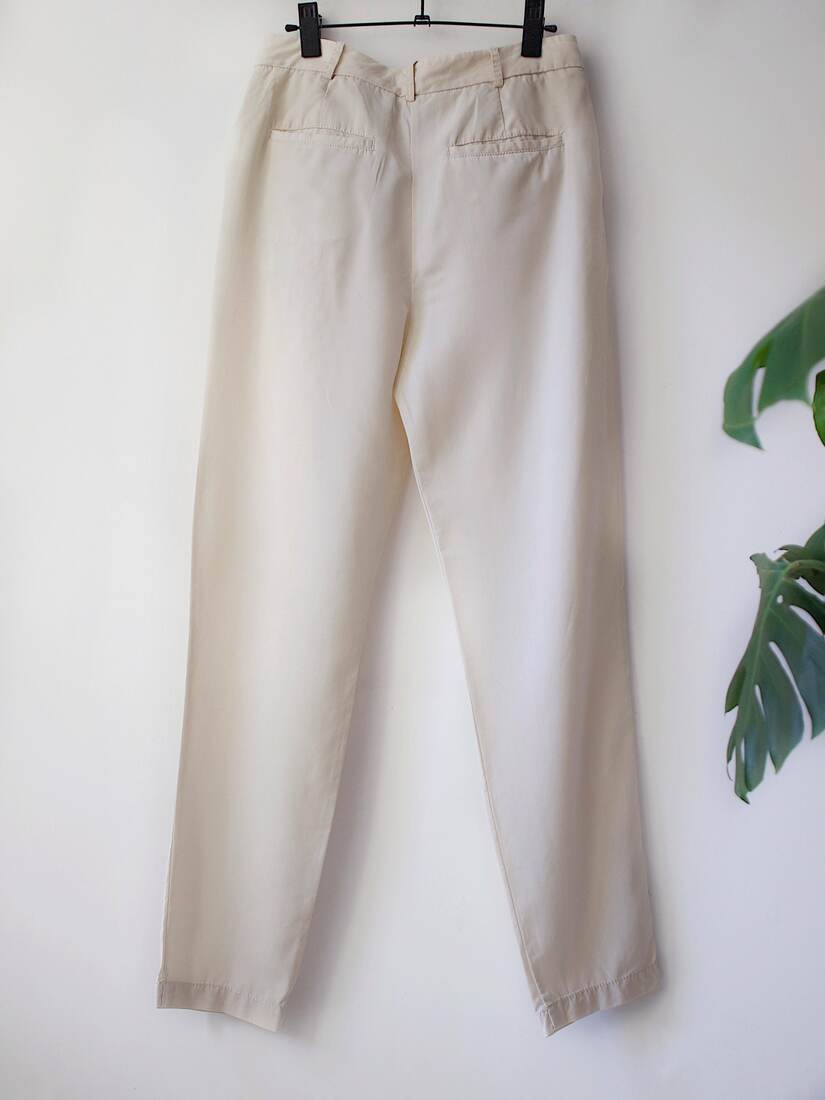 Minimalistyczne letnie chinosy w kremowym kolorze. Wykonane z lyocellu (forma sztucznego jedwabiu), lekkie i przyjemne w dotyku. Rozmiar z metki 36, bez wad.