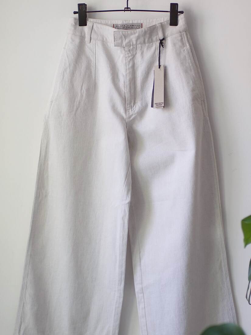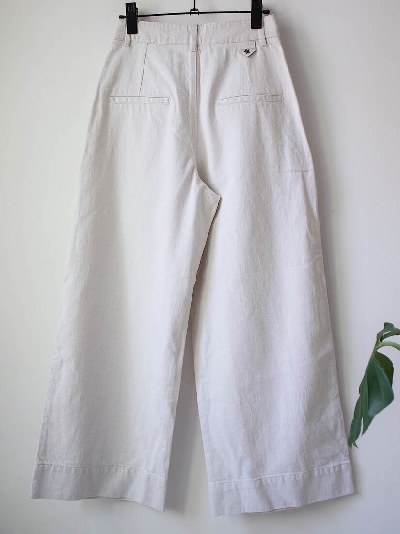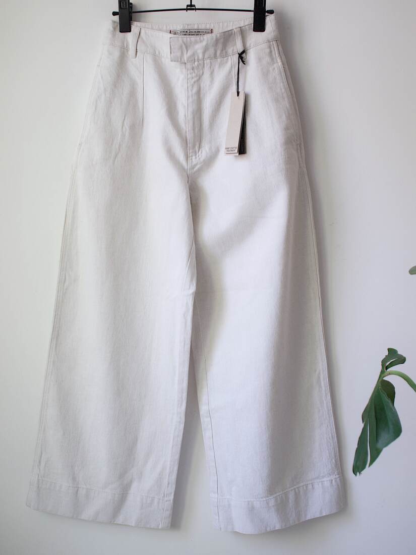 Spodnie z wysokim stanem i szerokimi nogawkami. Wykonane ze strukturalnej tkaniny, 85% bawełna i 15 % len. Rozmiar z metki 34, nowe, cena katalogowa 135 euro.
