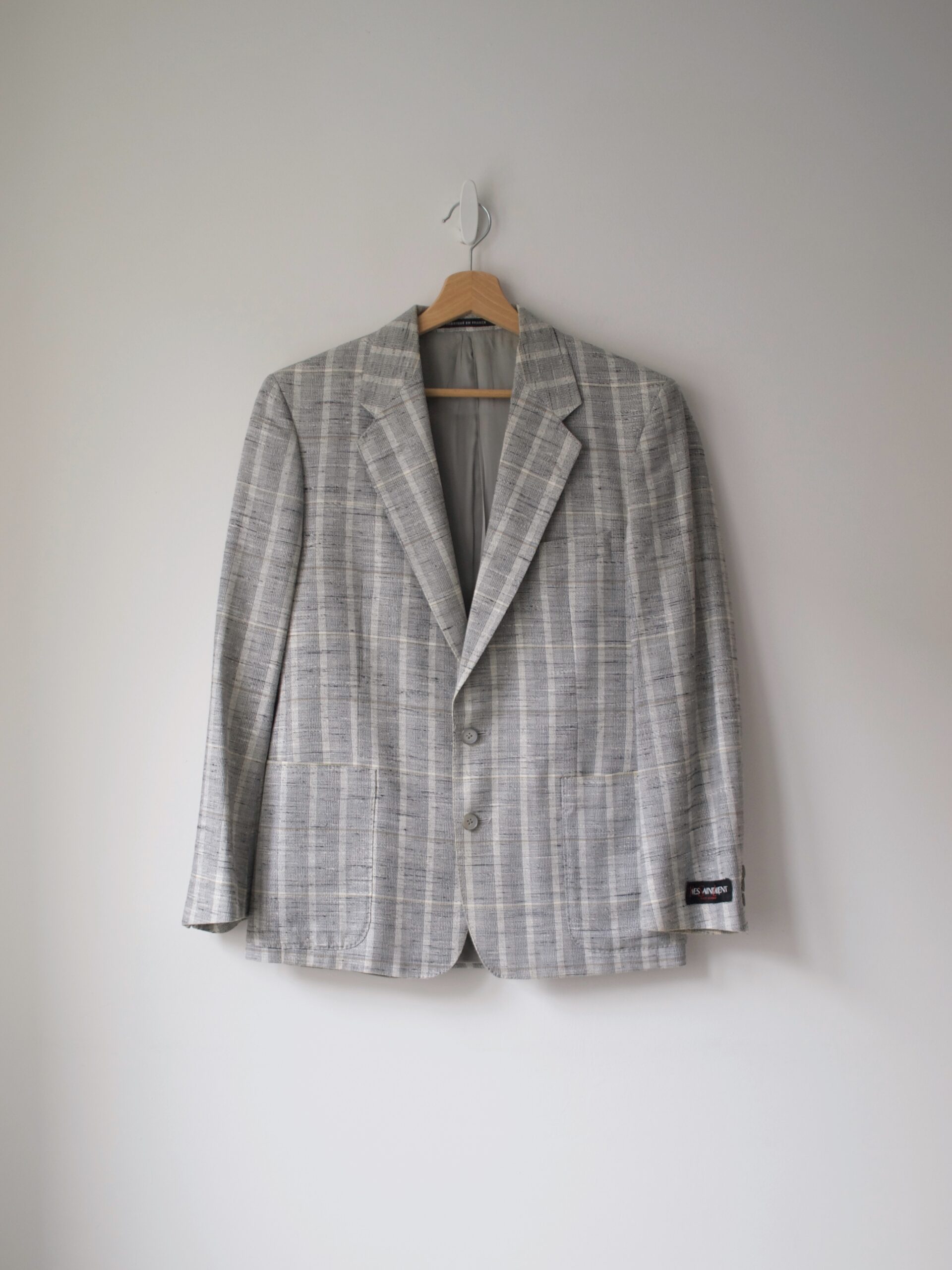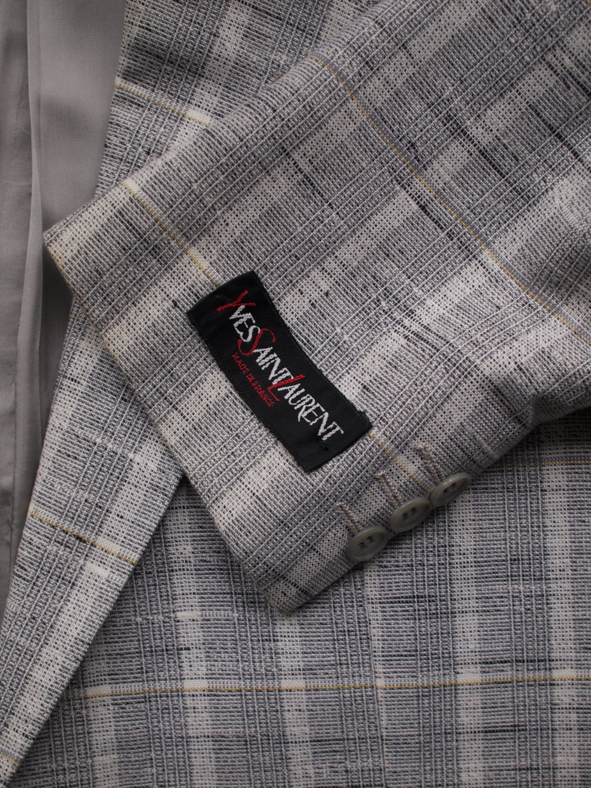 Marynarka vintage domu mody Yves Saint Laurent. Szyta na zamówienie, brak metki z rozmiarem oraz składem. Ogólnie bardzo dobry stan, po czyszczeniu chemicznym, jednak w środku na podszewce ma przebarwienia, które nie udało się usunąć. Nie są widoczne w noszeniu.