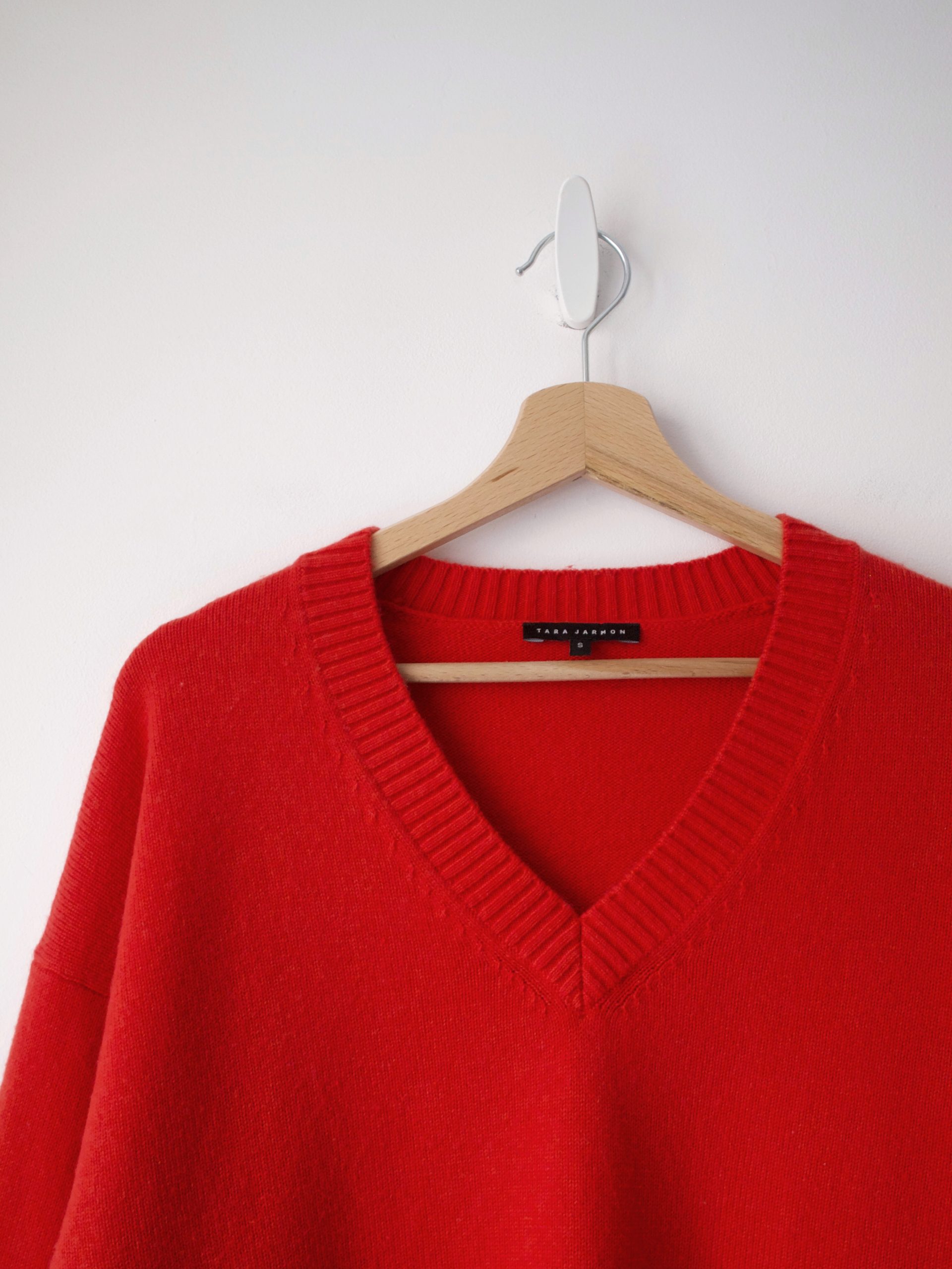 Sweter ekskluzywnej francuskiej marki Tara Jarmon, znanej z eleganckiego wzornictwa i wysokiej jakości materiałów, a ceny swetrów na stronie tej marki zaczynają się od 700 zł. Model o luźnym fasonie, z szerokimi rękawami i dekoltem w serek. Wykonany z mieszanki wełny z dodatkiem kaszmiru, miły w dotyku.