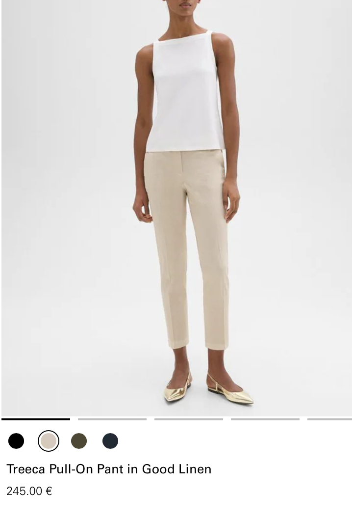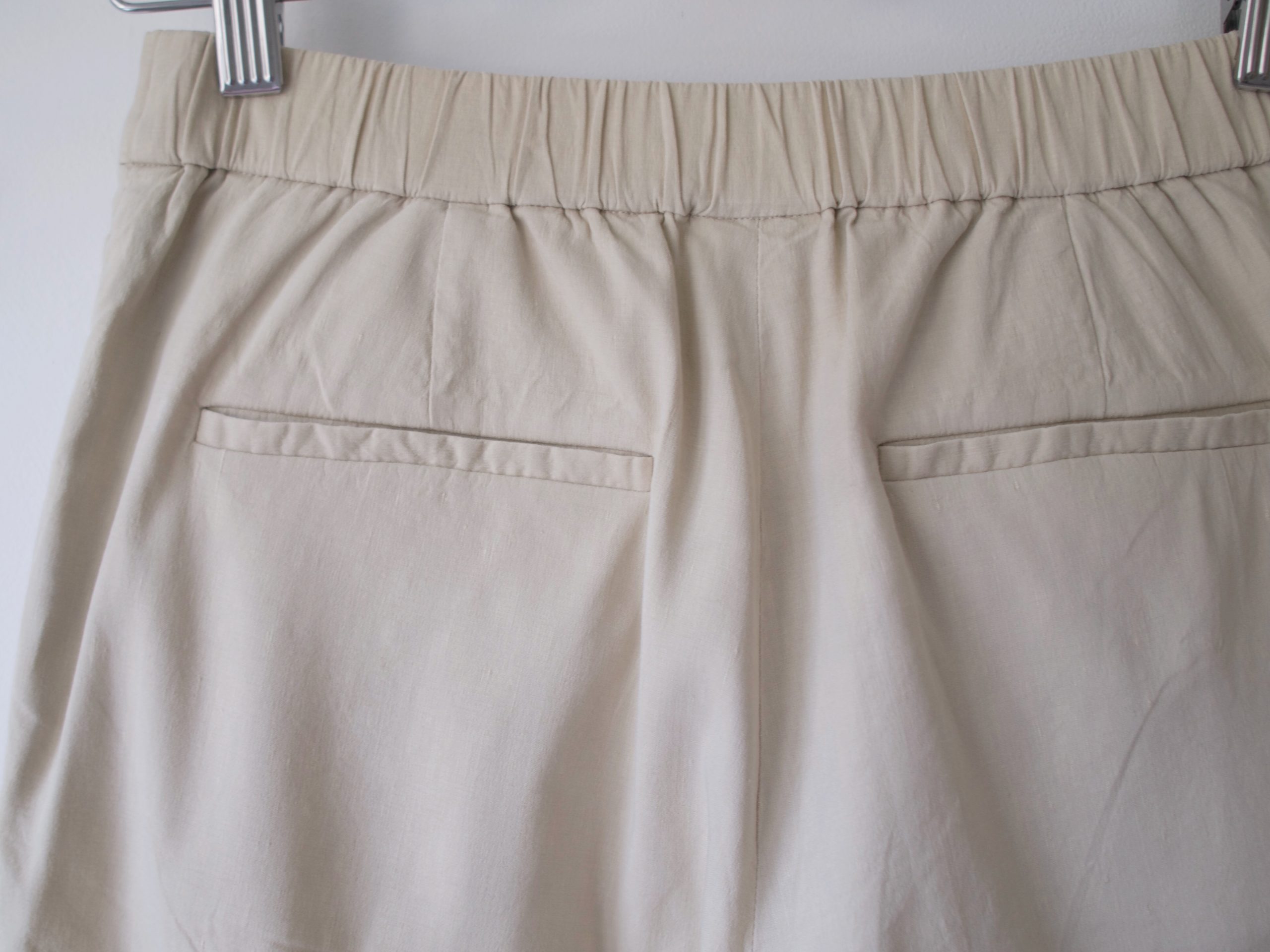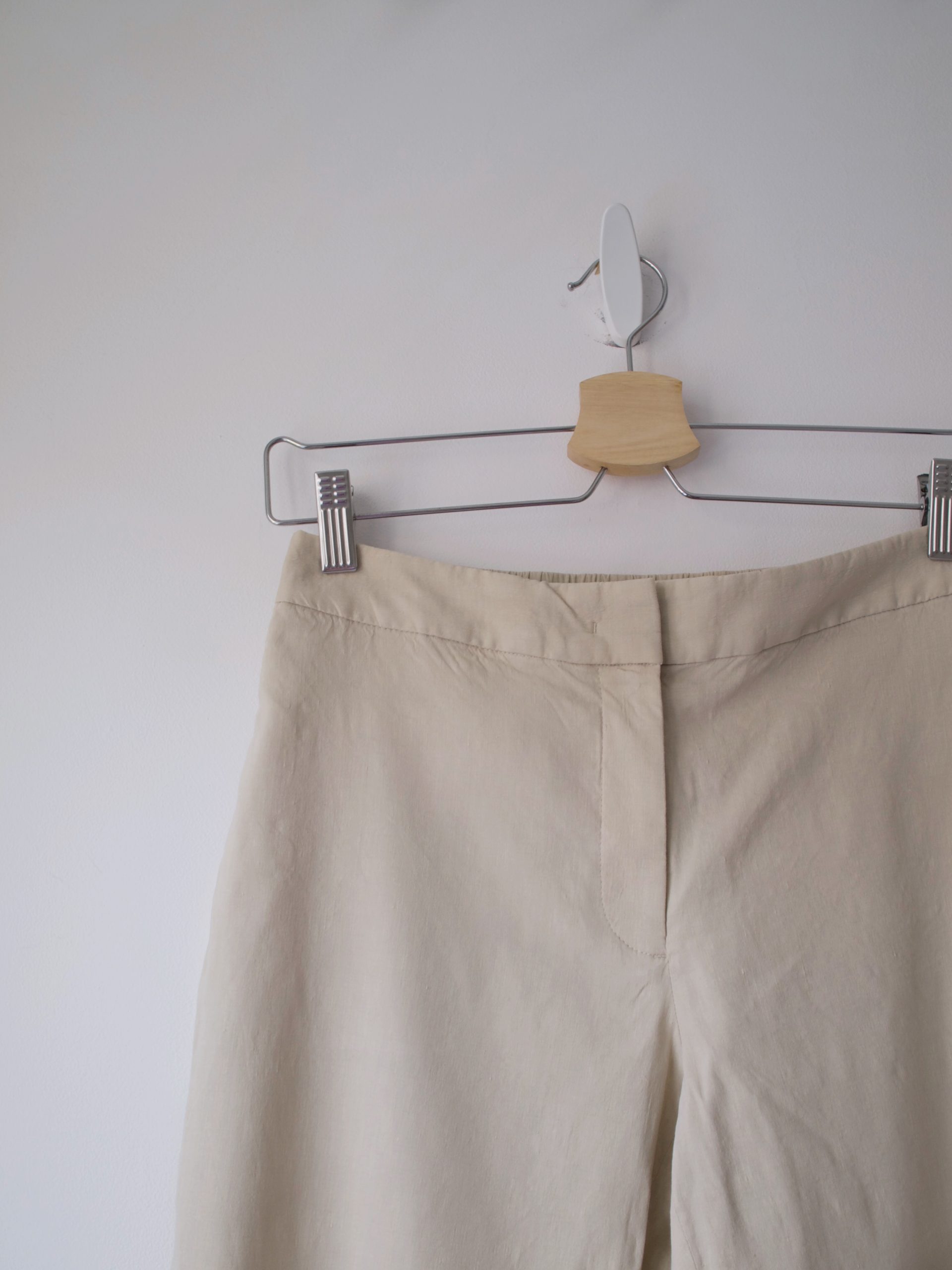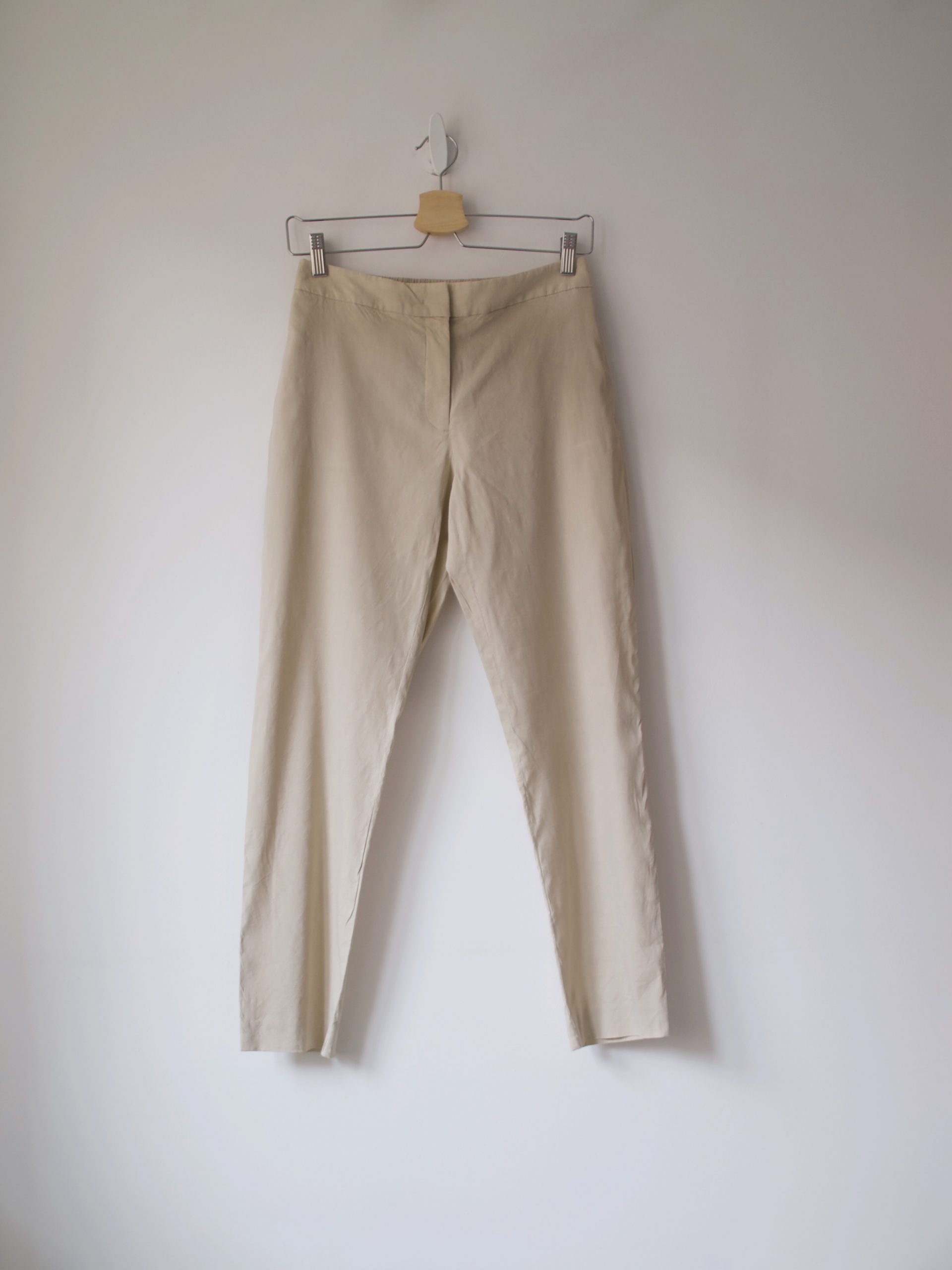 Spodnie cygaretki luksusowej marki Theory, wykonane z materiału z dużym dodatkiem lnu. Zapinane na zamek, z kieszeniami, materiał o delikatnie marszczonej strukturze. Cena katalogowa 245 euro, czyli ponad 1000 zł. Wykonane dla rynku azjatyckiego, więc rozmiar wypada na mniejszy.
