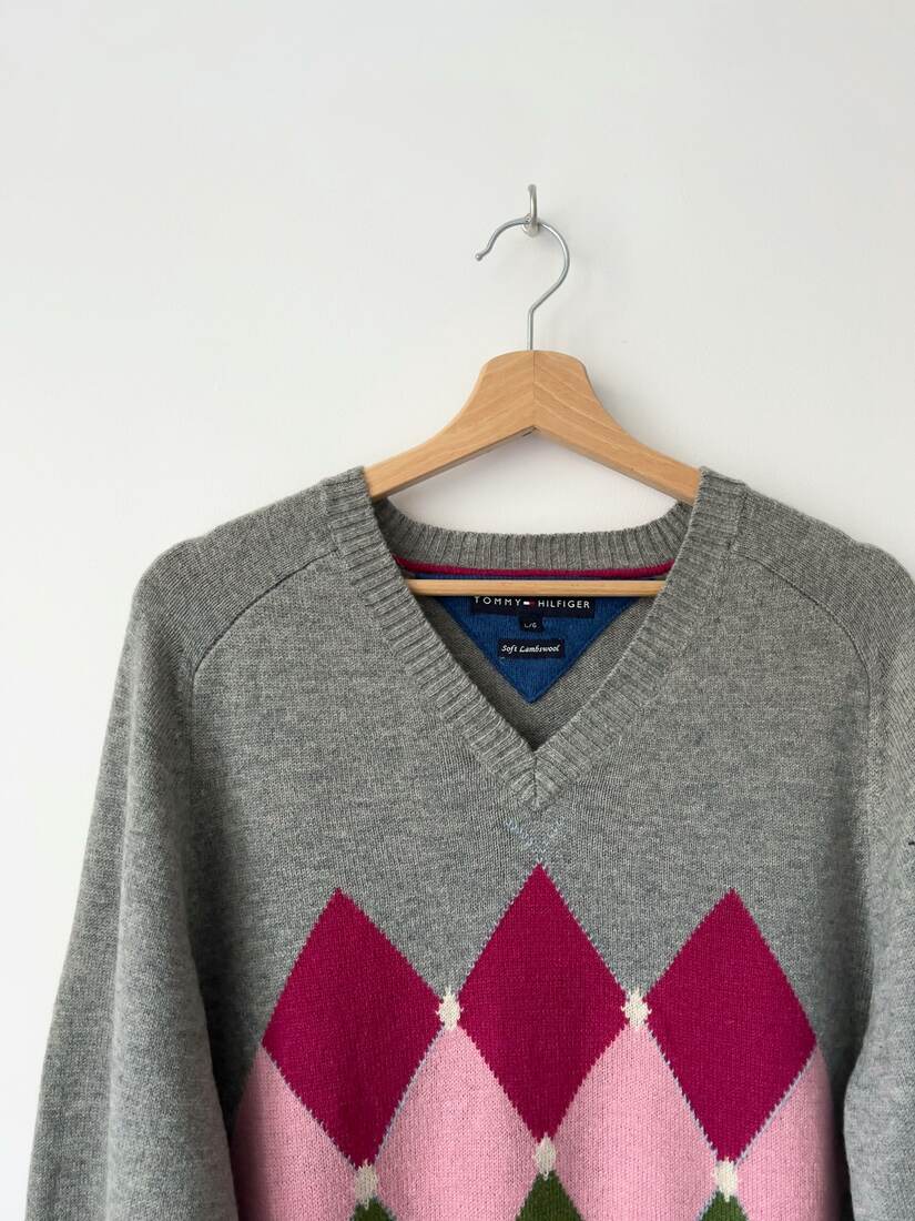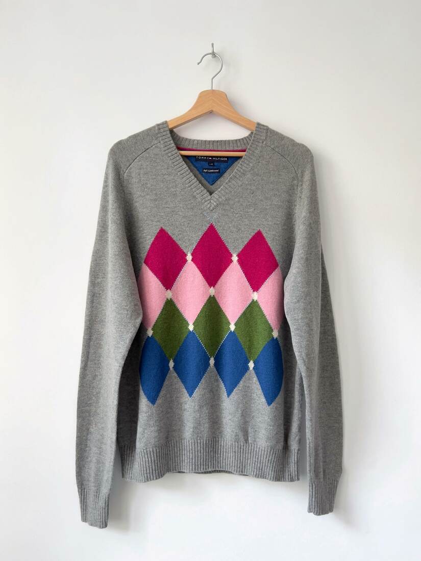 Obszerny wełniany sweter marki Tommy Hilfiger. W 100% wykonany z miękkiej i niegryzącej wełny jagnięcej. Rozmiar z metki L, będzie dobry również na XL. Bardzo dobry stan.