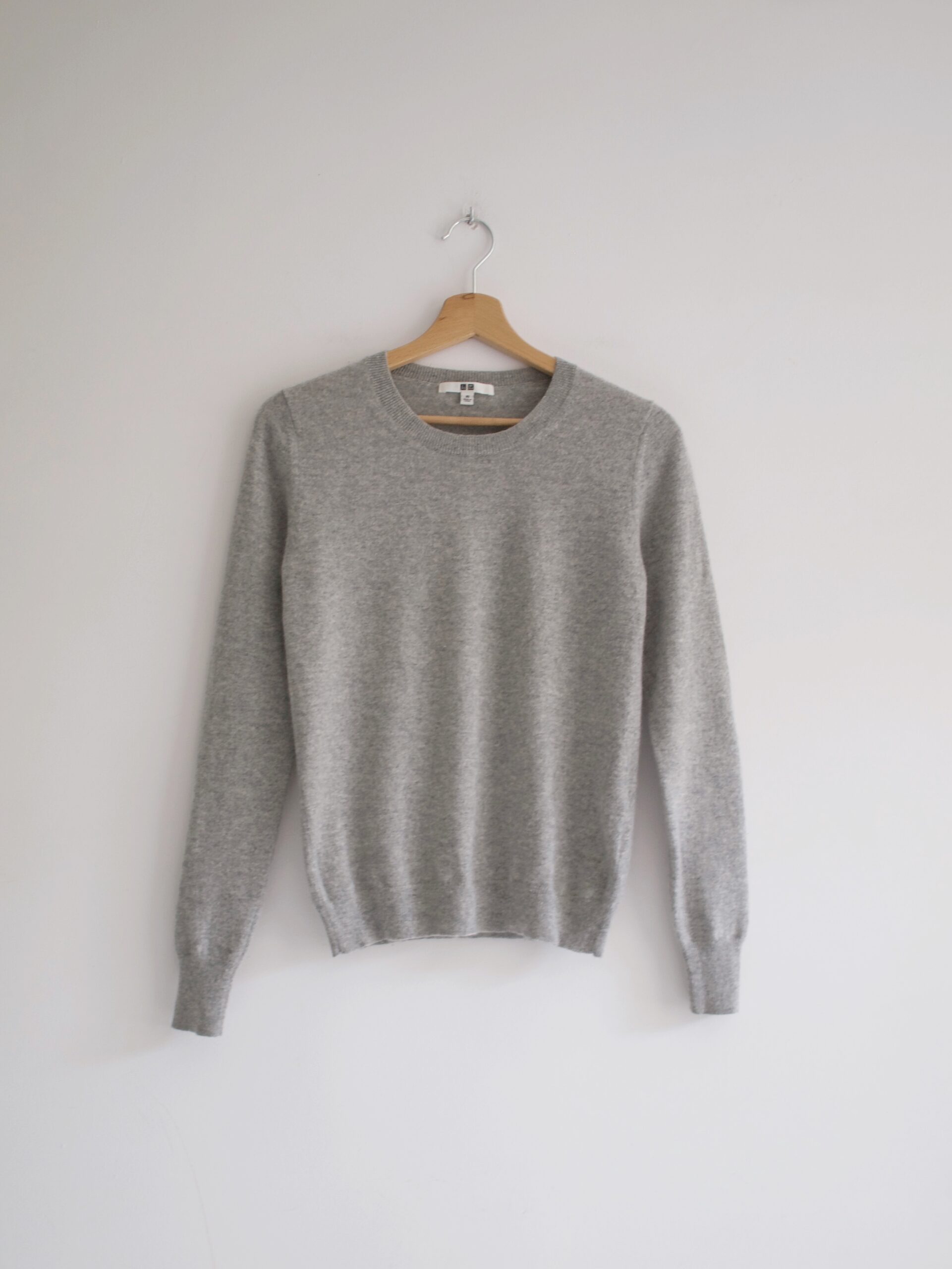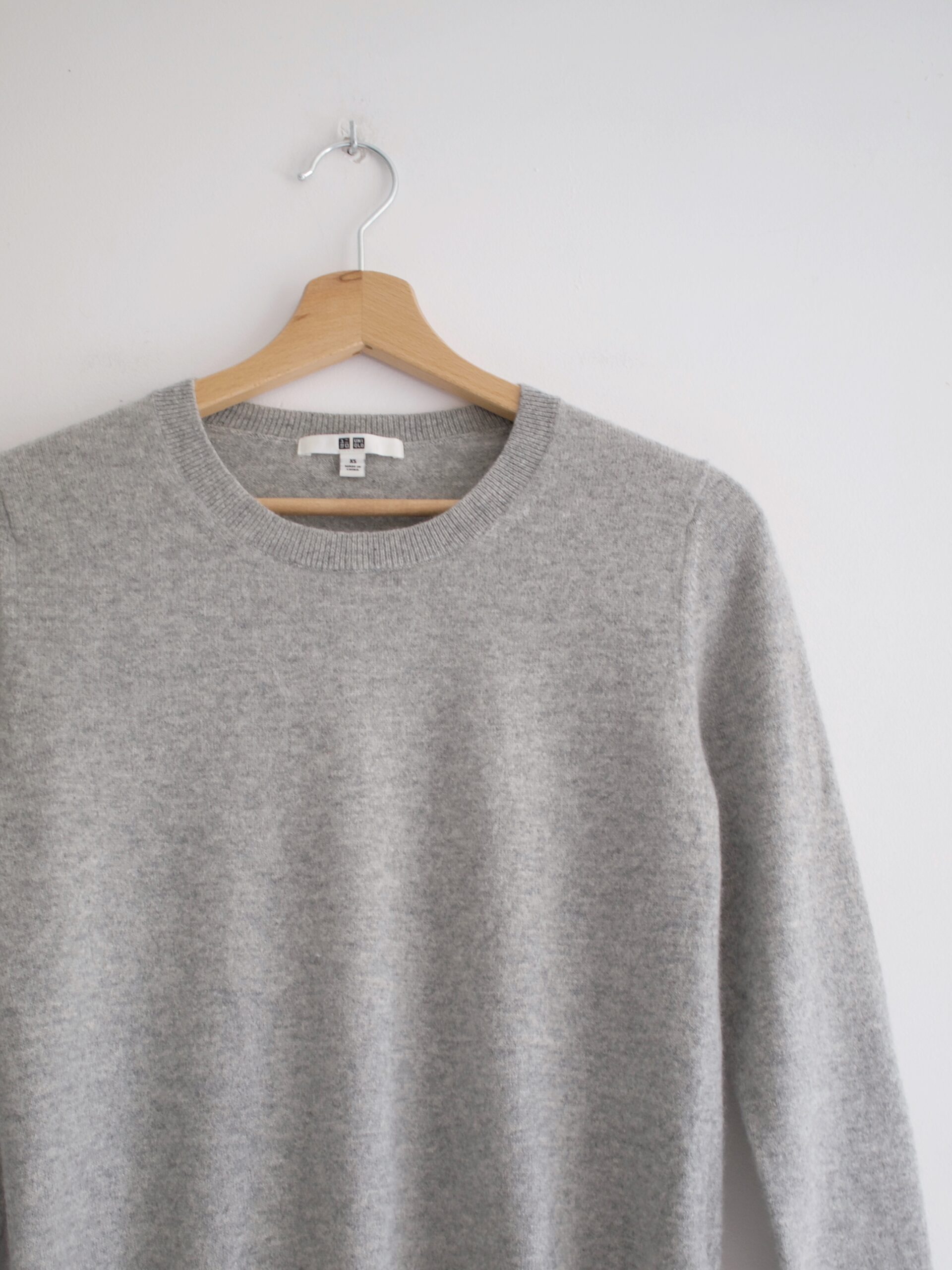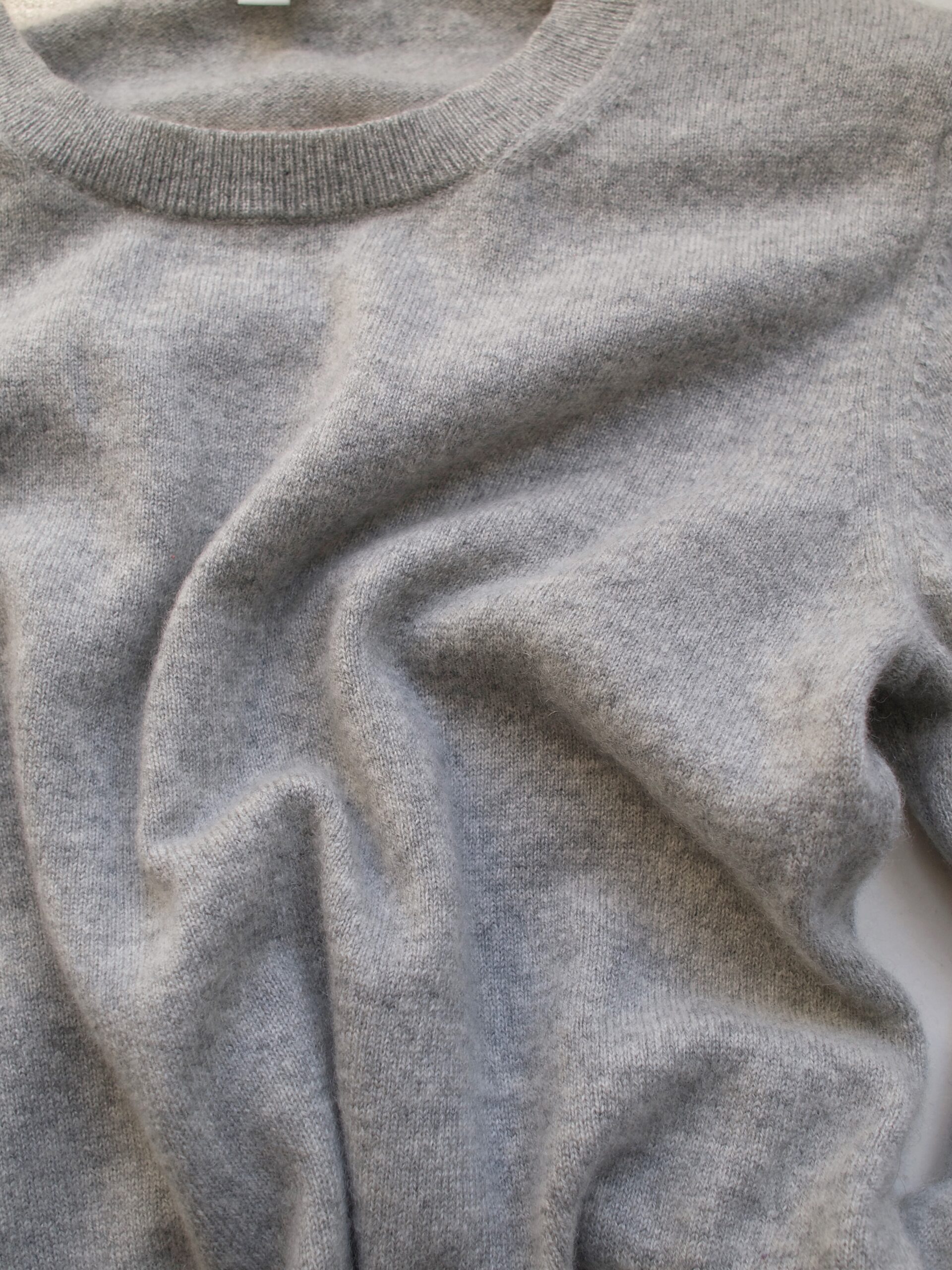Minimalistyczny kaszmirowy sweter o pudełkowym kroju. Sweter bardzo miękki i przyjemny, ma dwie małe zacerowane dziurki, nie widoczne w noszeniu, poza tym brak mankamentów. Wymiary poniżej.