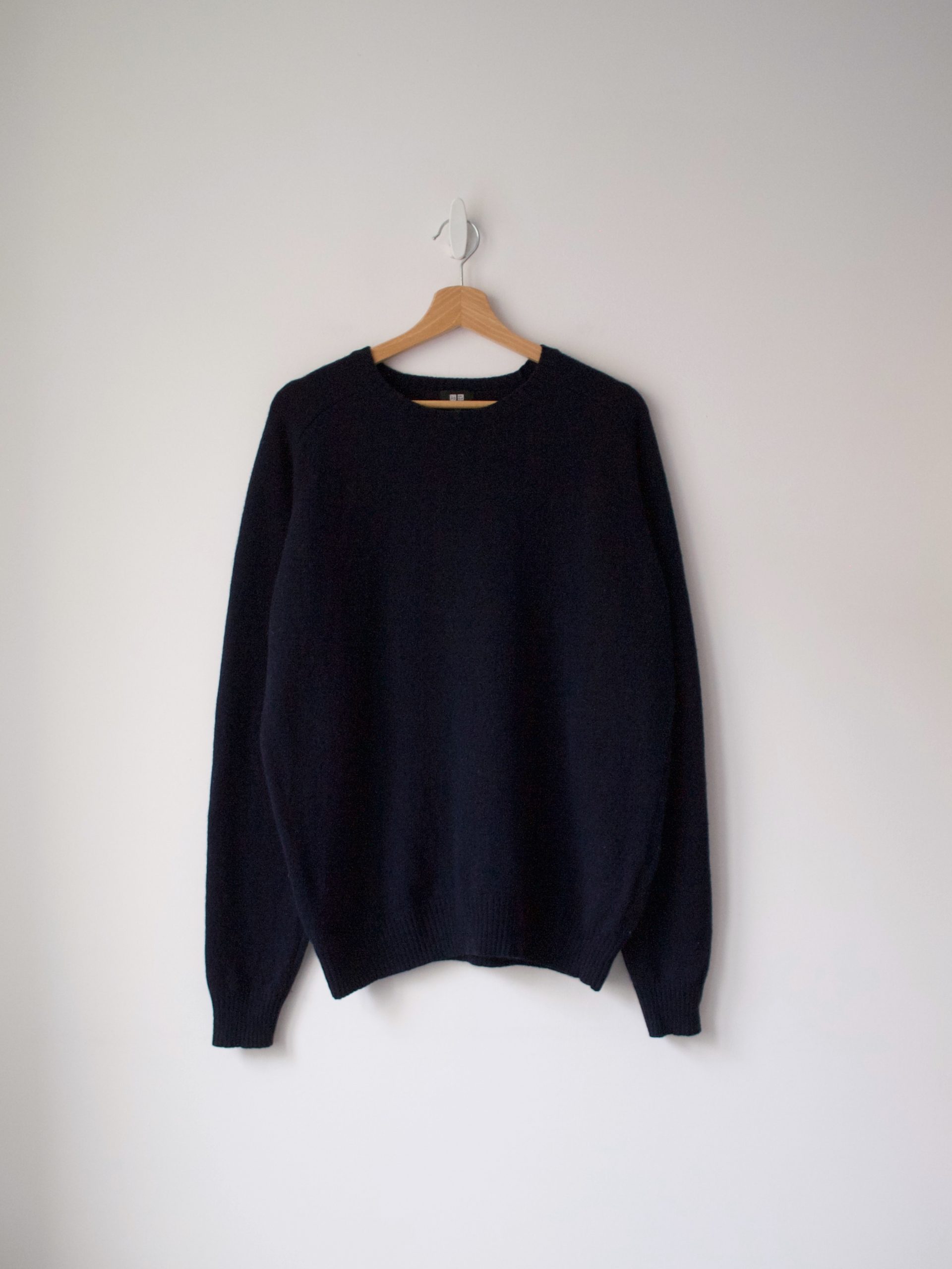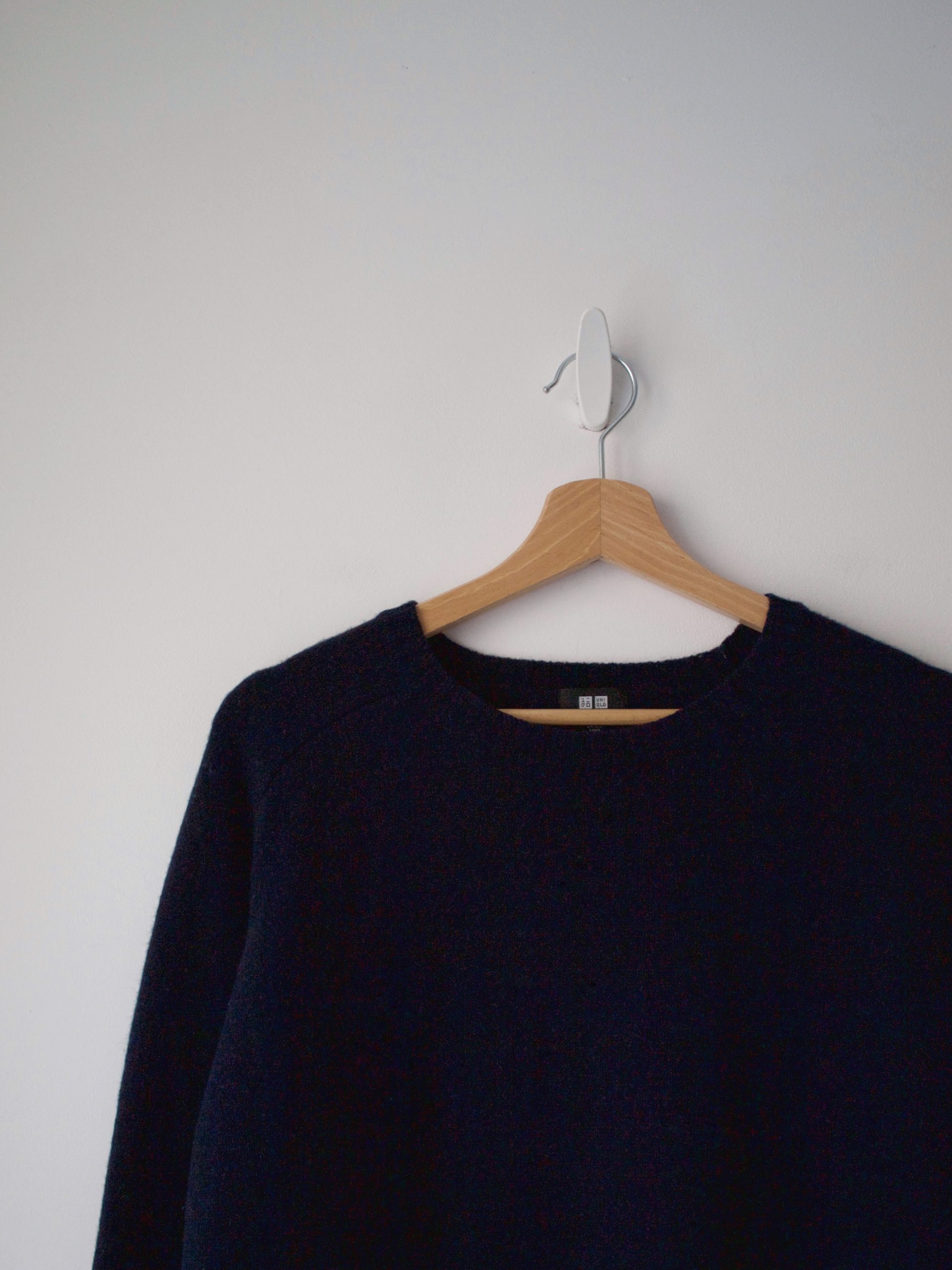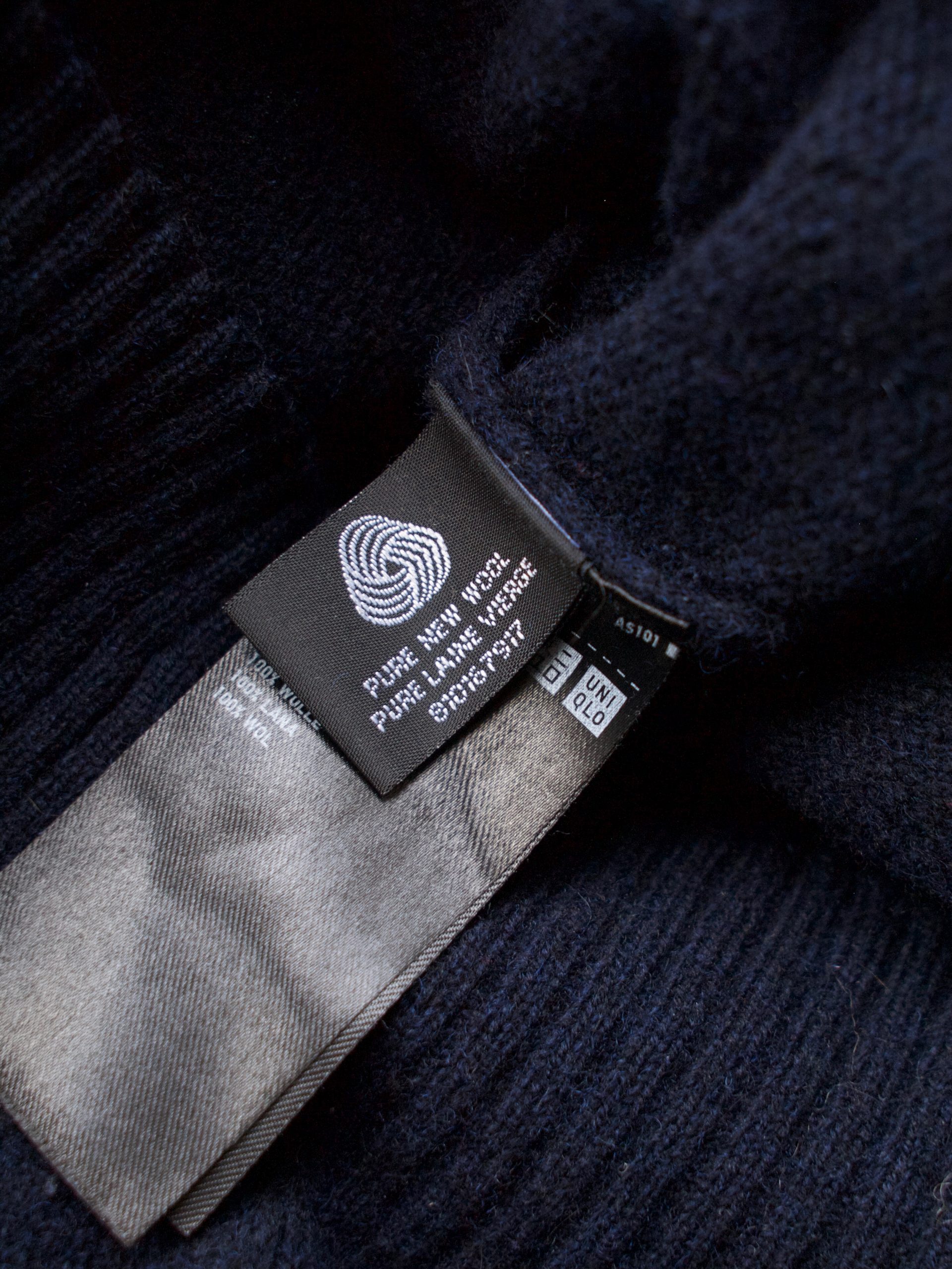 Granatowy sweter marki Uniqlo, w 100% wykonany z wełny. Rozmiar z metki: XL Skład: 100% wełna Stan: bez wad Szerokość w klatce 59 cm Długośćcałkowita 68 cm