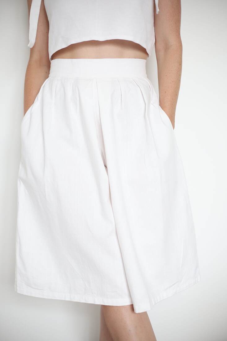 Szerokie szorty upcycled, szyte z bawełnianej zasłony. Z tyłu zapinane na suwak i dwa guziki z naturalnej muszli, z kieszeniami. Materiał gruby i nie prześwituje. Polecam na rozmiar XS-S.