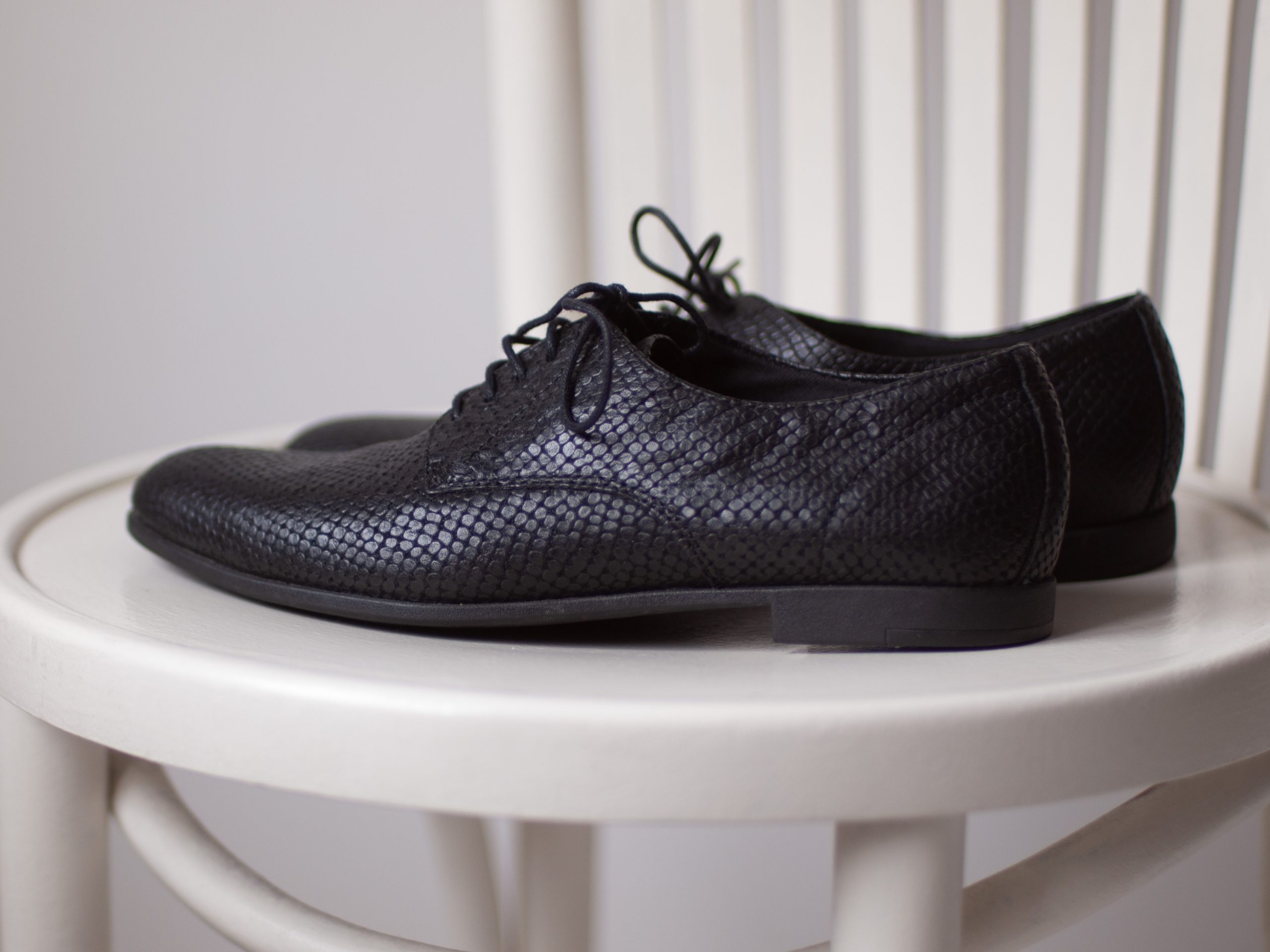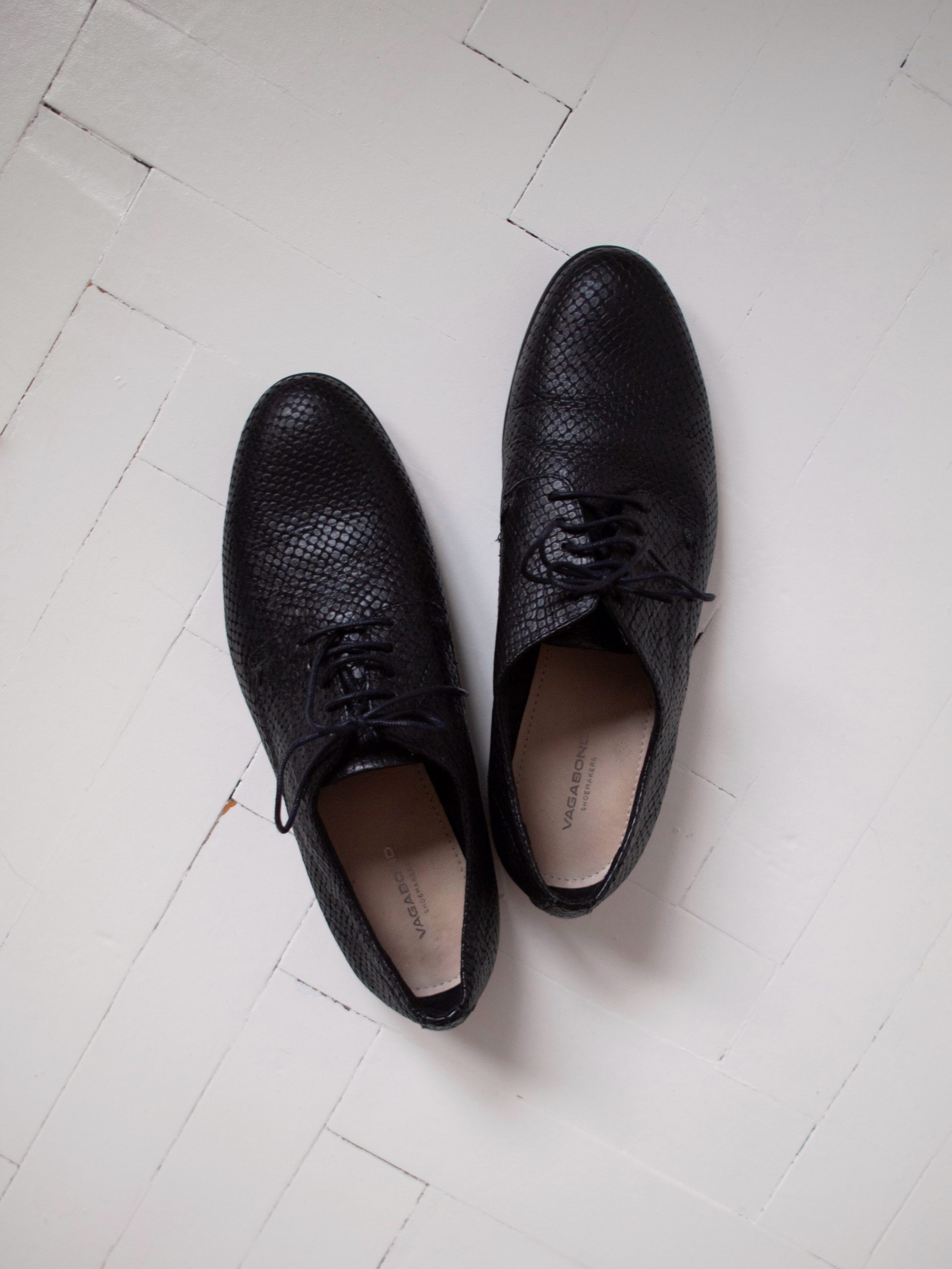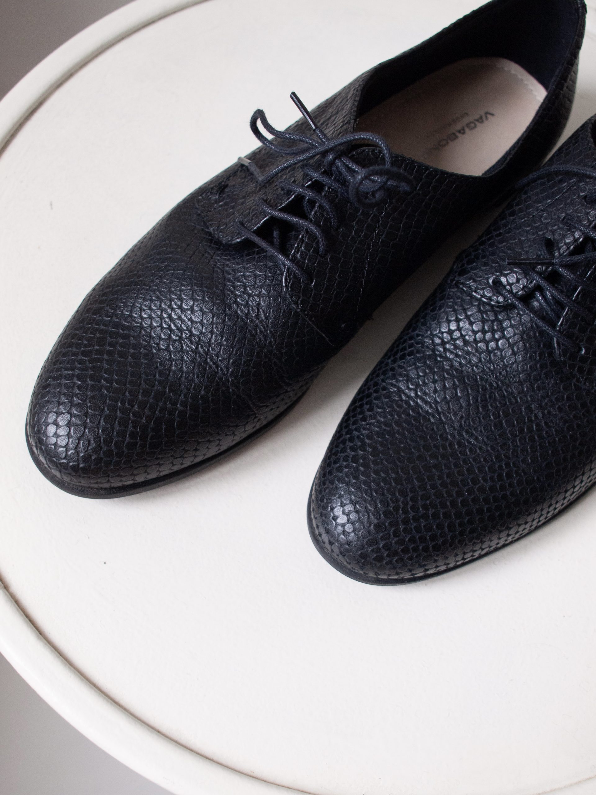 Klasyczne skórzane oxfordy Vagabond w kolorze czarnym. Wykonane z naturalnej skóry o tłoczonej fakturze. Nowe bez metki. Rozmiar z metki: 40 Skład: skóra Stan: nowe bez metki