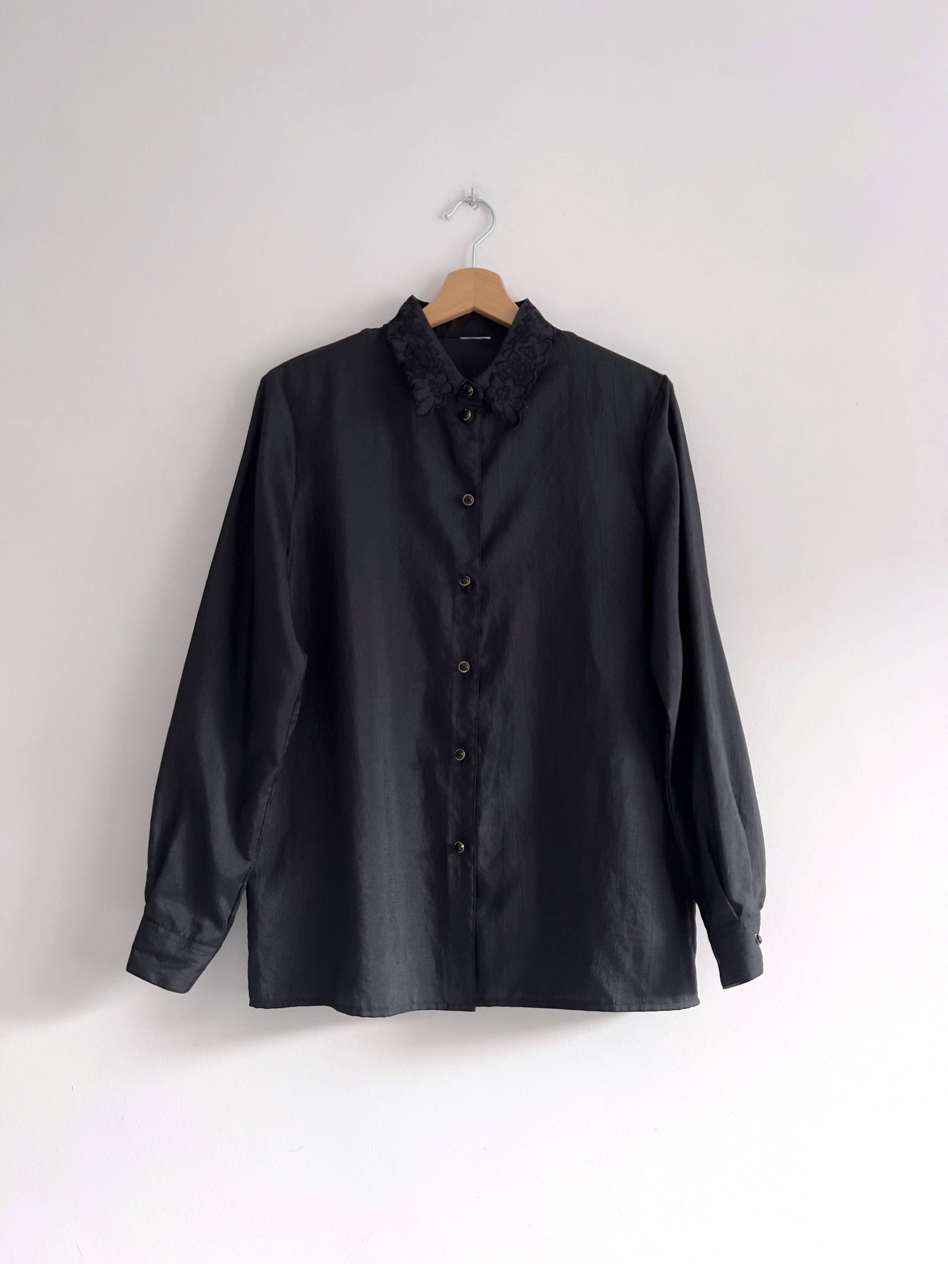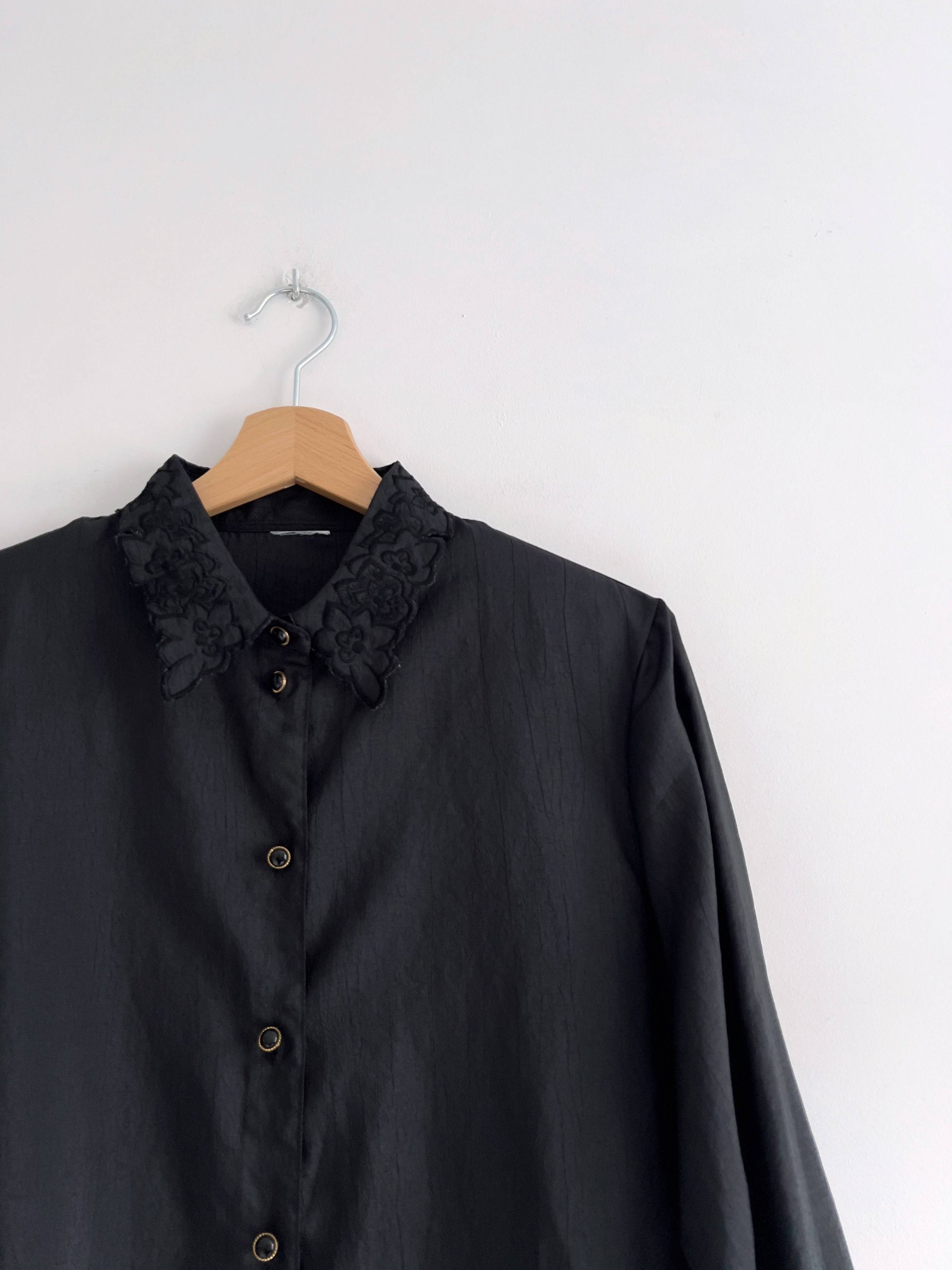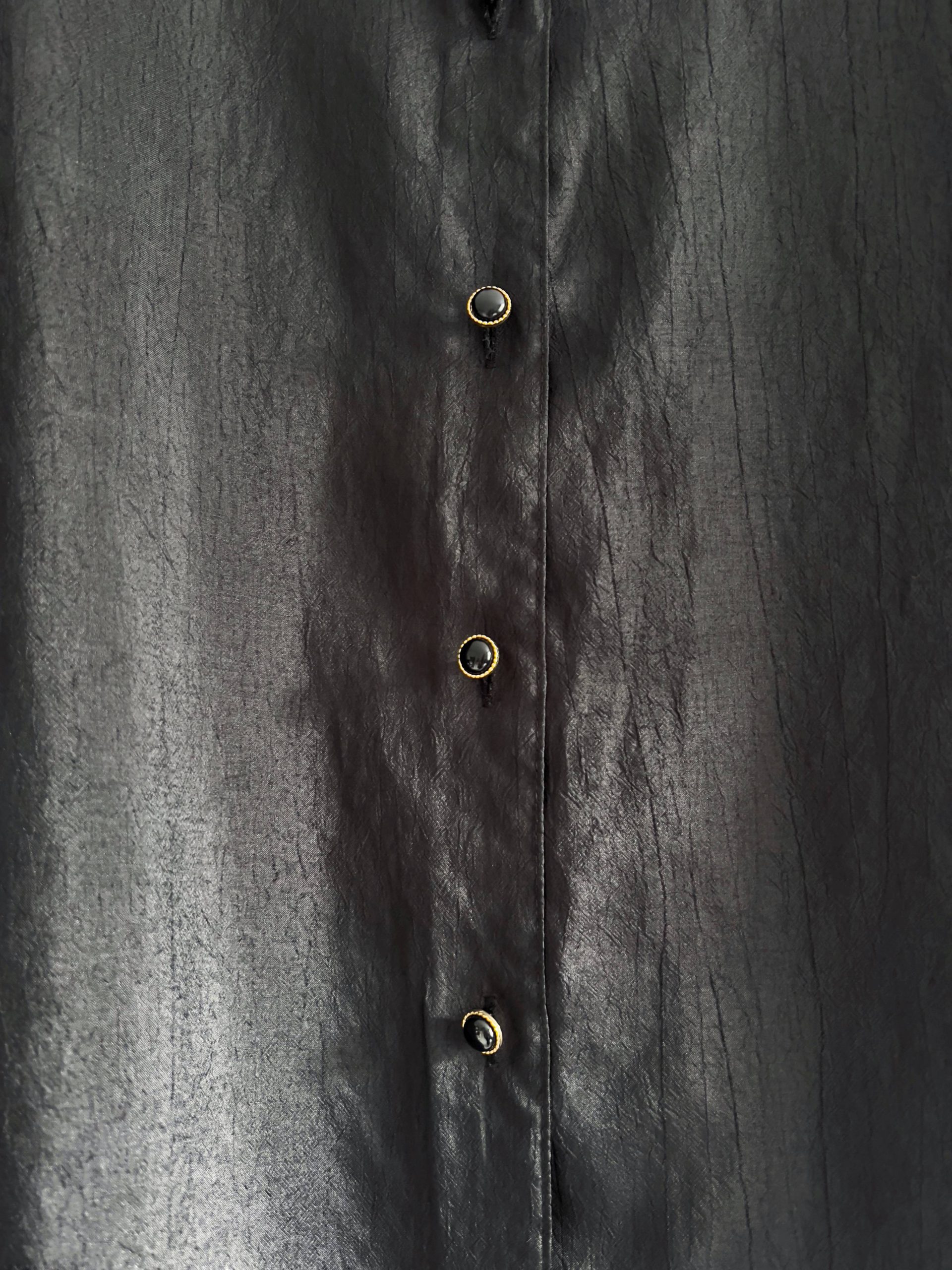 Bluzka vintage, zapinana na piękne guziki. Brak metki ze składem, syntetyk. Polecam na L, bez wad.