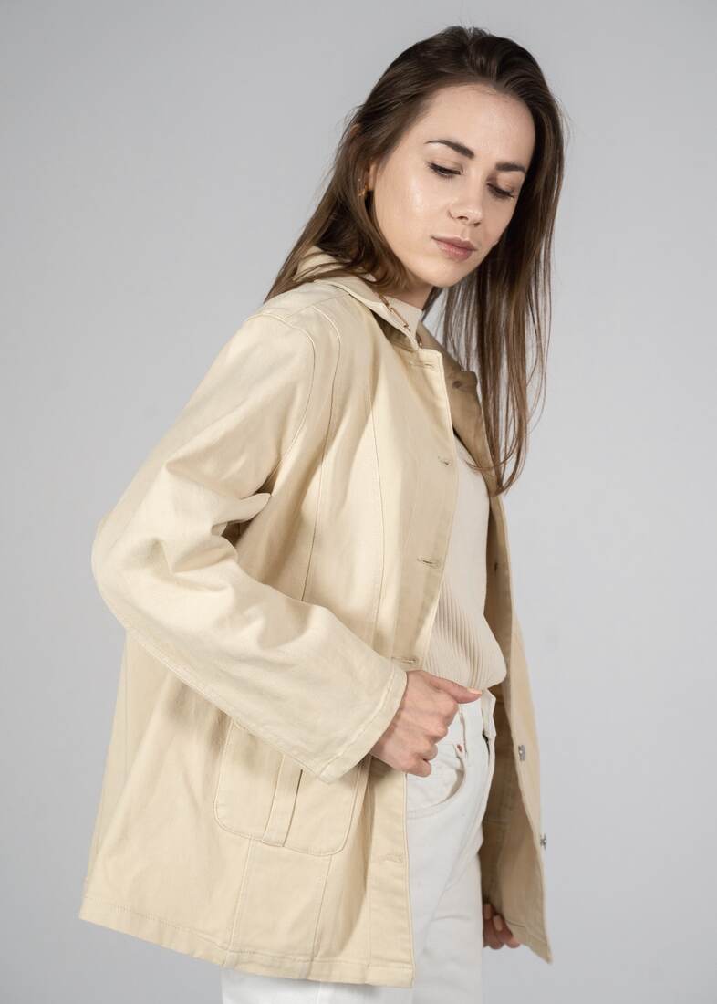 Minimalistyczna kurtka vintage, wykonana z jeansowej tkaniny w kremowym kolorze. Będzie pasować na L-XL, lub na mniejsze jako oversize. Bez wad.
