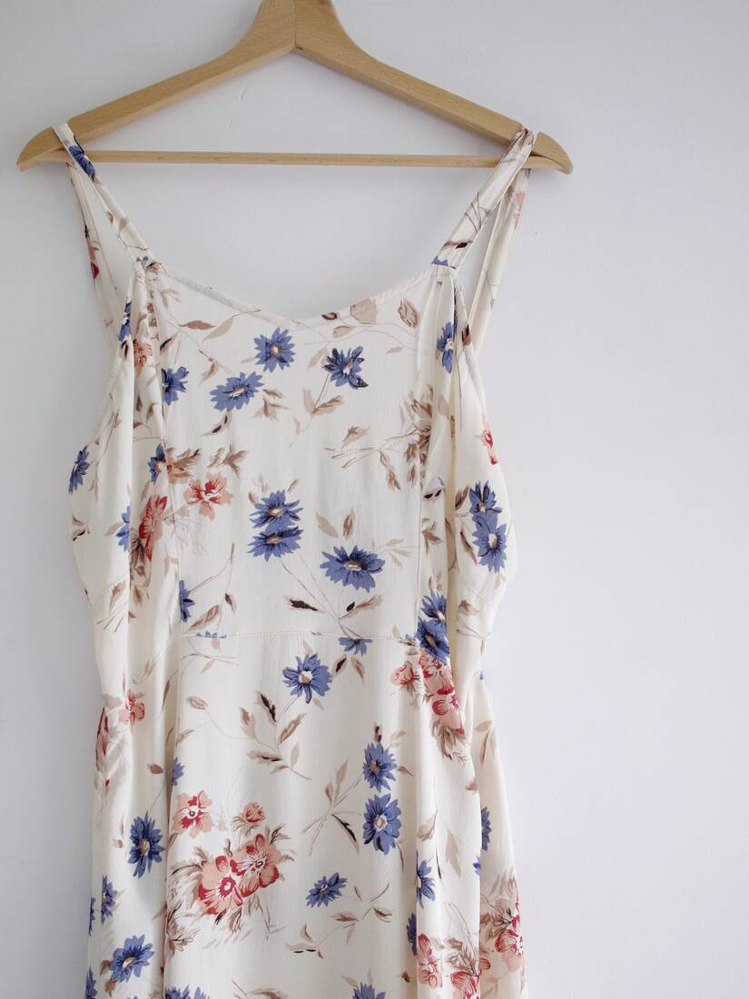 Sukienka vintage w kremowym kolorze, z pięknym wzorem polnych kwiatów. Z tyłu zapięcie na suwak. Rozmiar z metki 38, polecam dla osoby wysokiej. Bez wad.