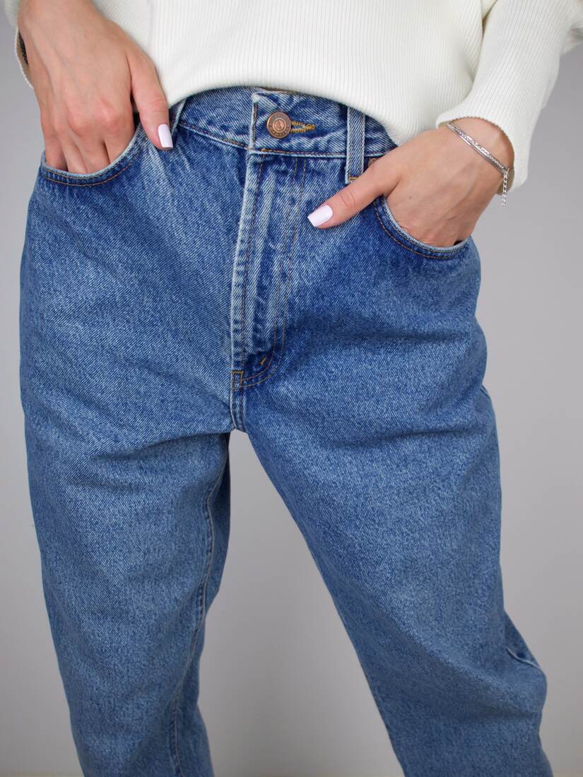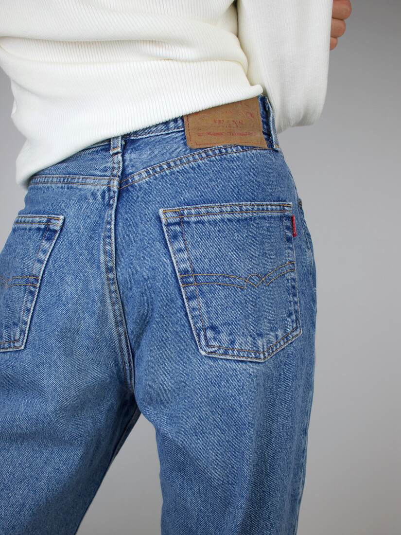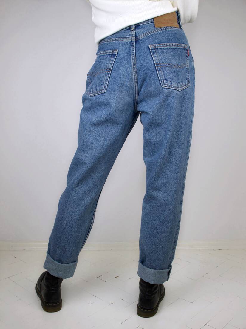 Jeansy vintage z wysokim stanem. 100% bawełna, wyprodukowane we Włoszech. Rozmiar z metki 32/30, bardzo dobry stan.