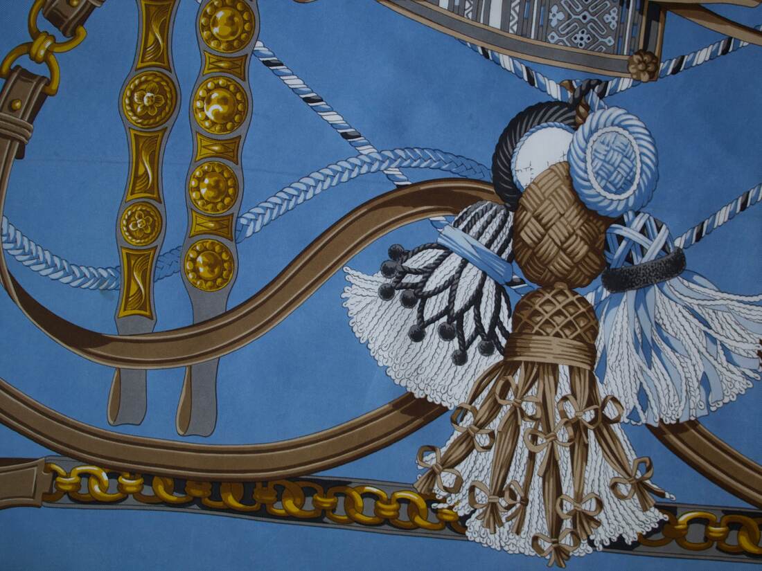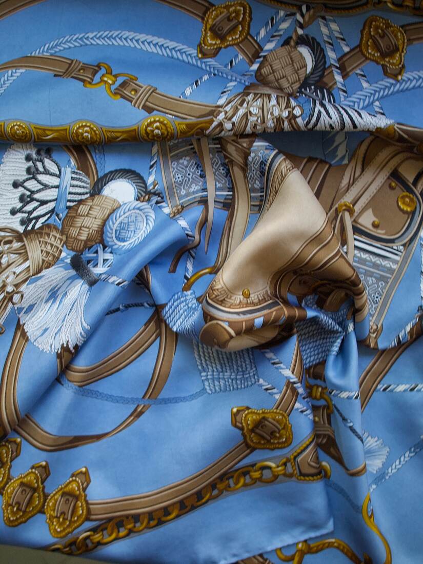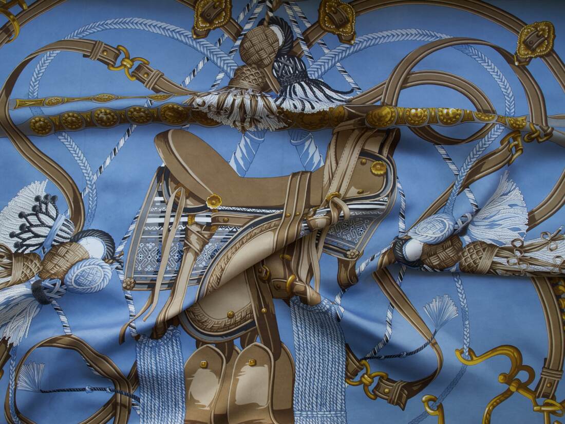 Duża chusta vintage w motyw jeździecki. Brak metki ze składem, jest to na 100% jedwab twill, bardzo dobrej jakości. Bardzo dobry stan, wymiary: 89*86 cm