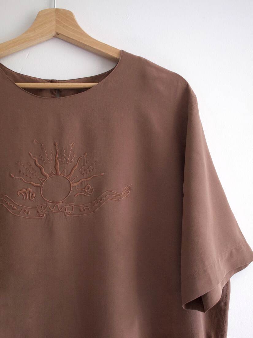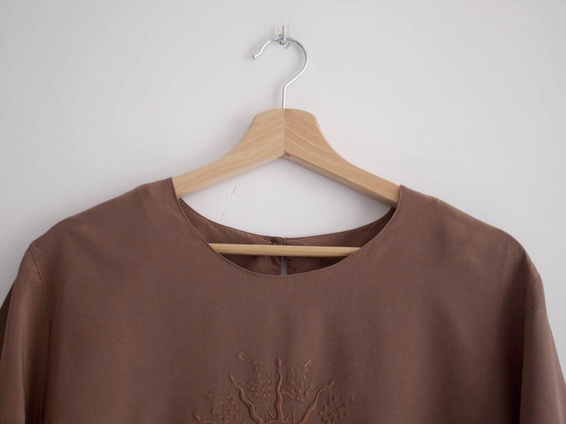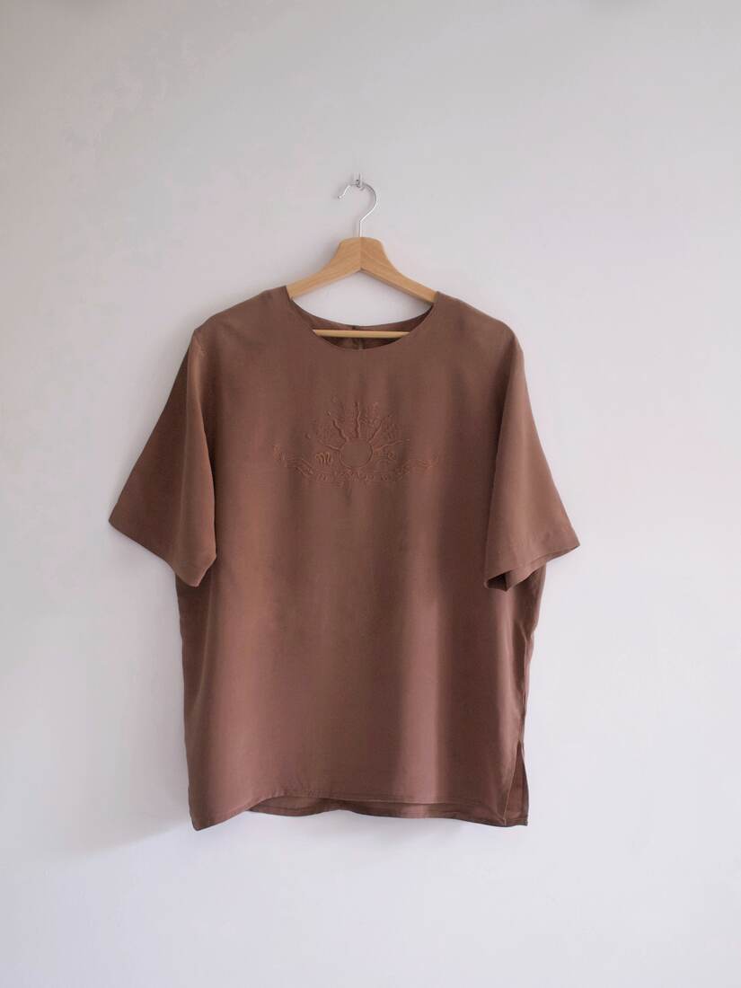 Bluzka vintage z haftem. W 100% wykonana z jedwabiu. Rozmiar z metki 44, ze względu na pudełkowy fason jest dość uniwersalny. Bardzo dobry stan.
