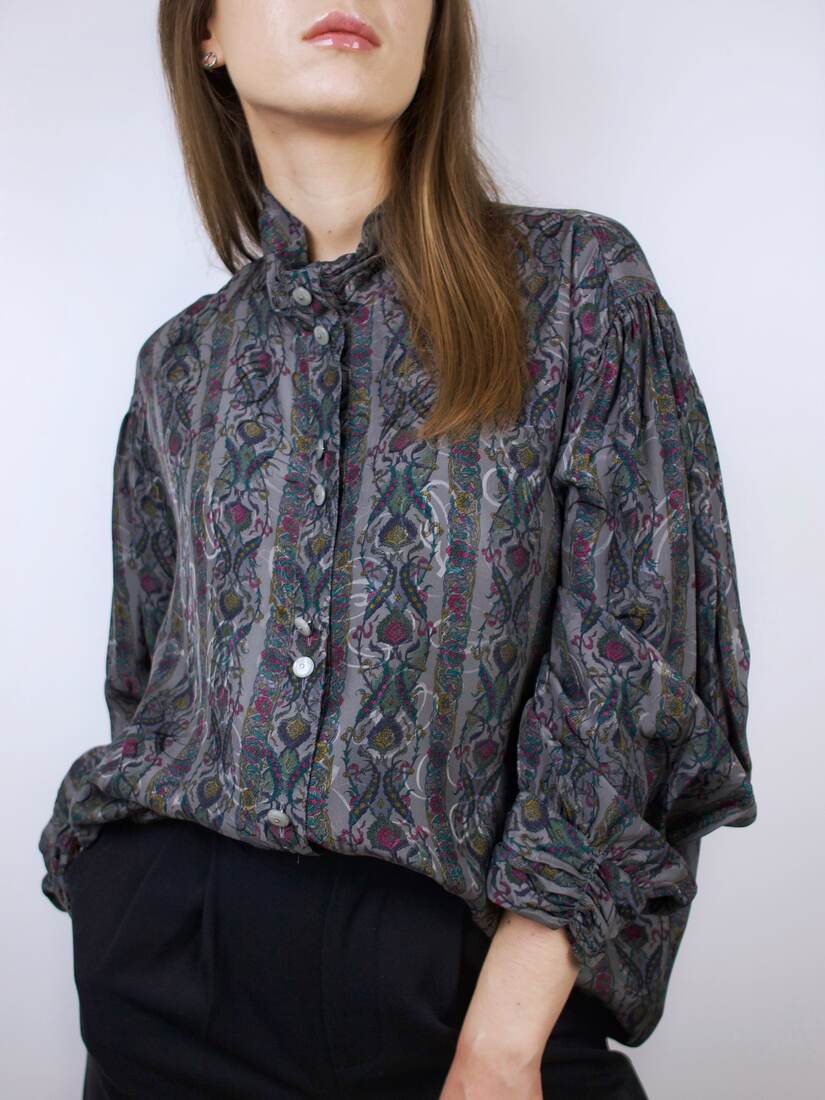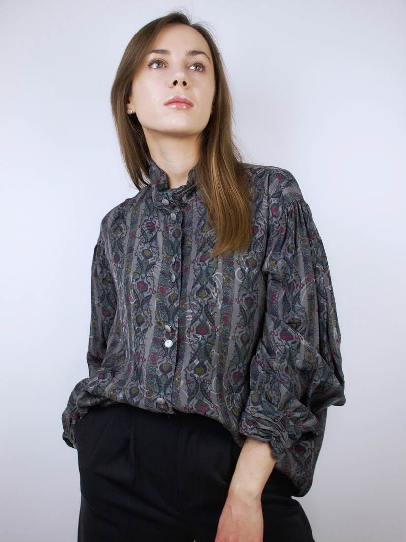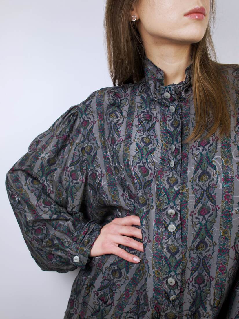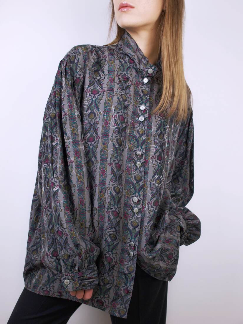 Unikatowa jedwabna koszula we wzory. Zapinana na piękne guziki. Rozmiar z metki 48, polecam na L-XL, lub jako oversize. Bez wad.