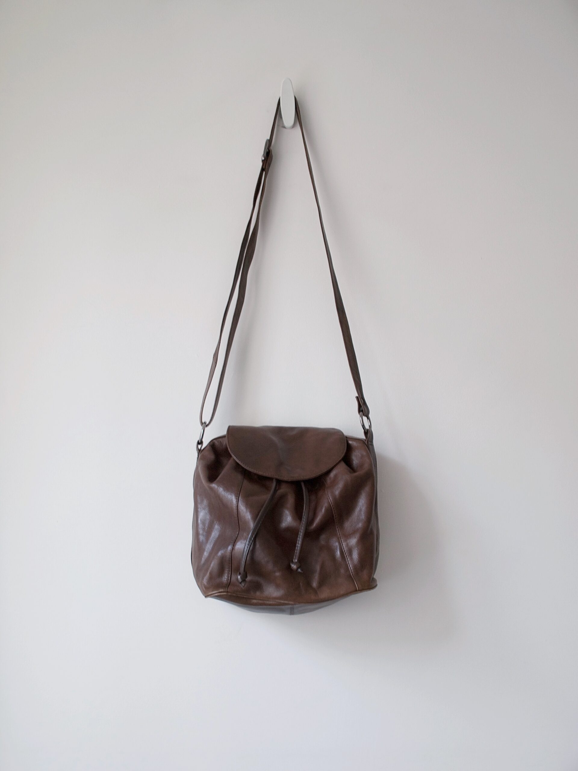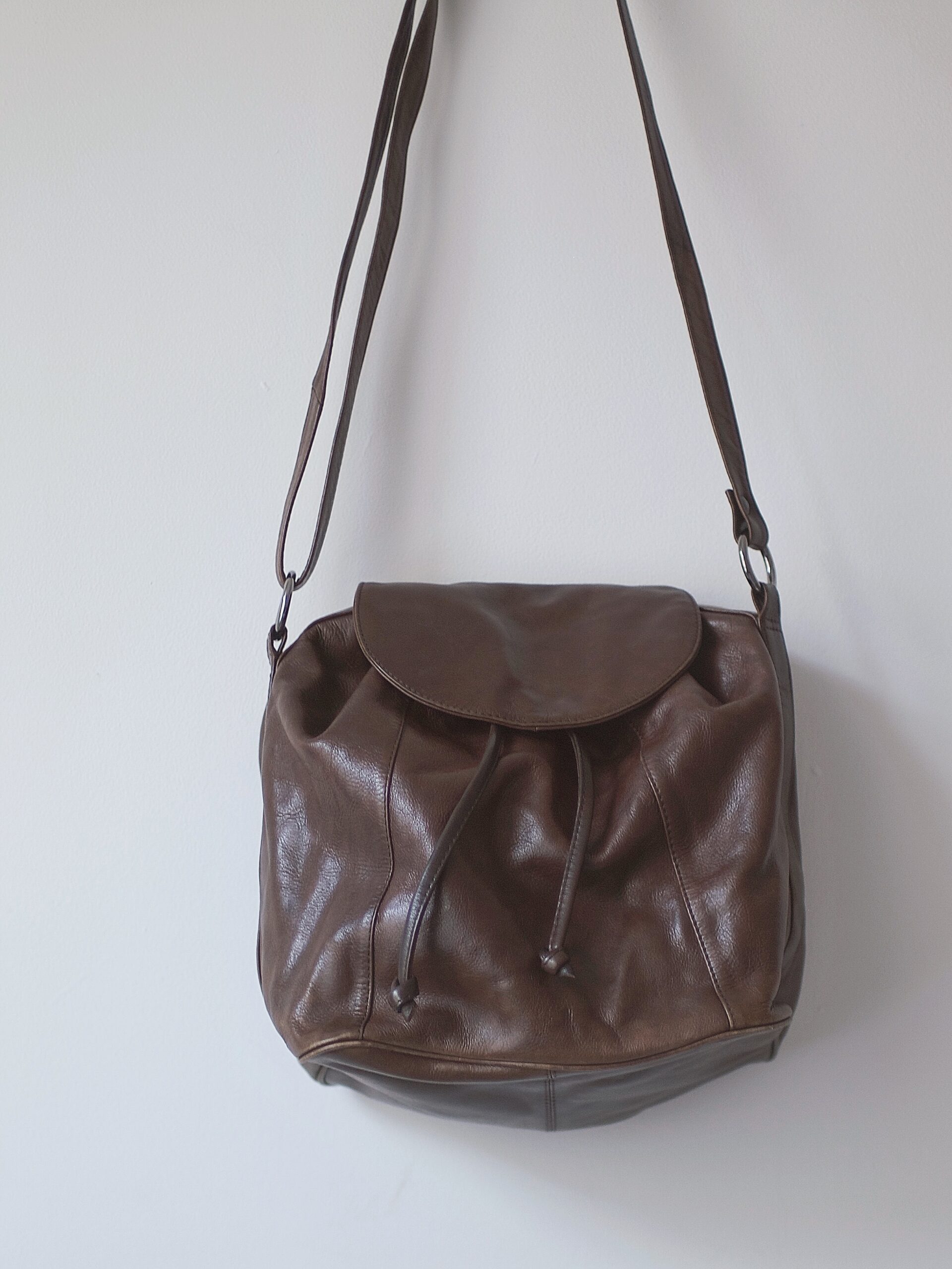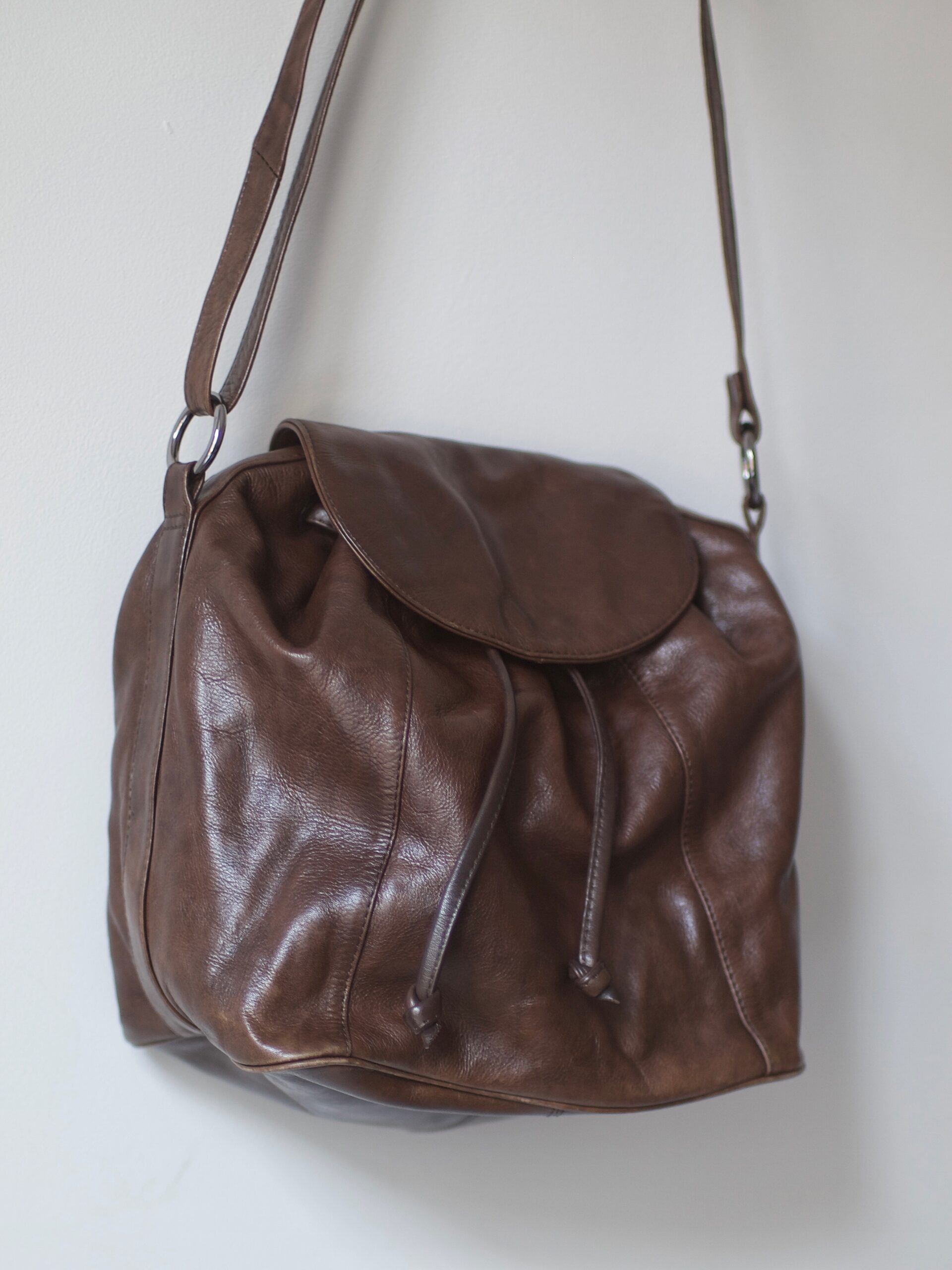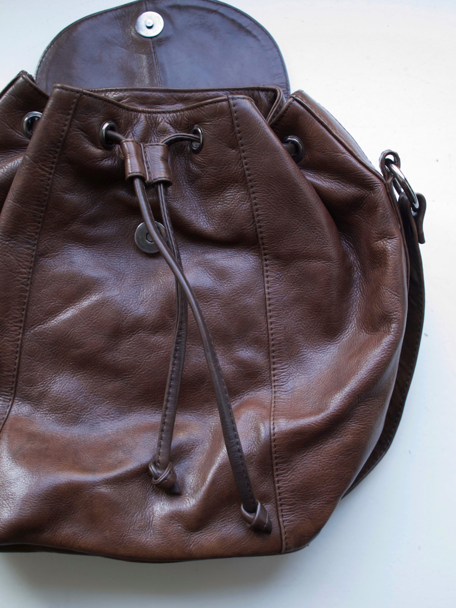 Torebka o kroju worka, wykonana z naturalnej skóry w kolorze brązowym. W środku jedna komora oraz zapinana na zamek kieszeń. Bez wad.