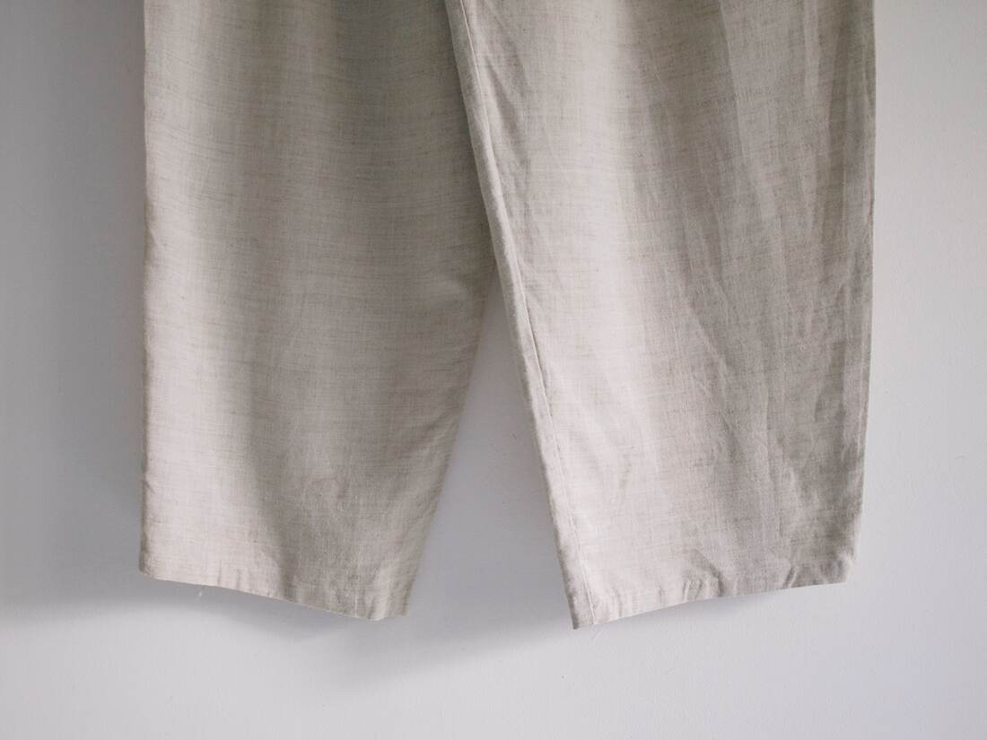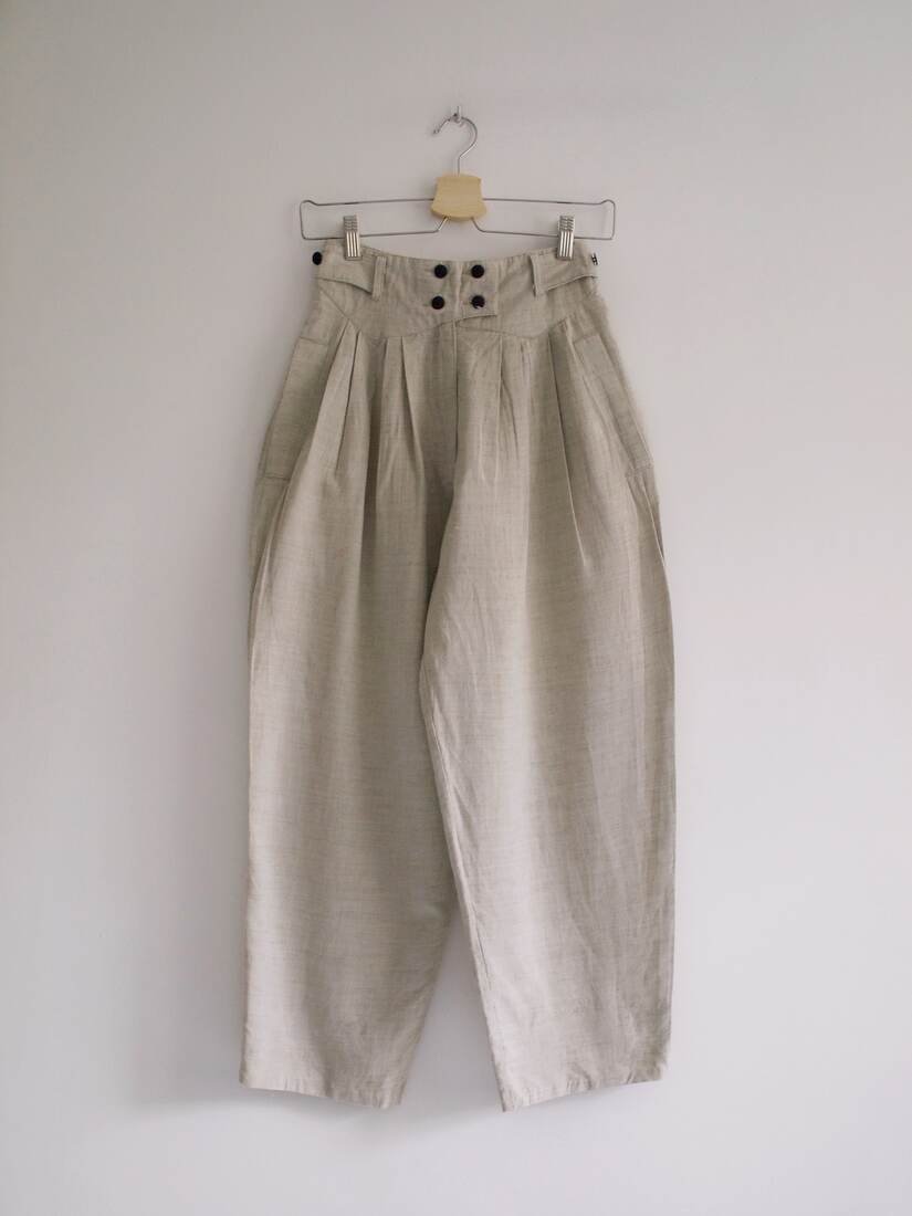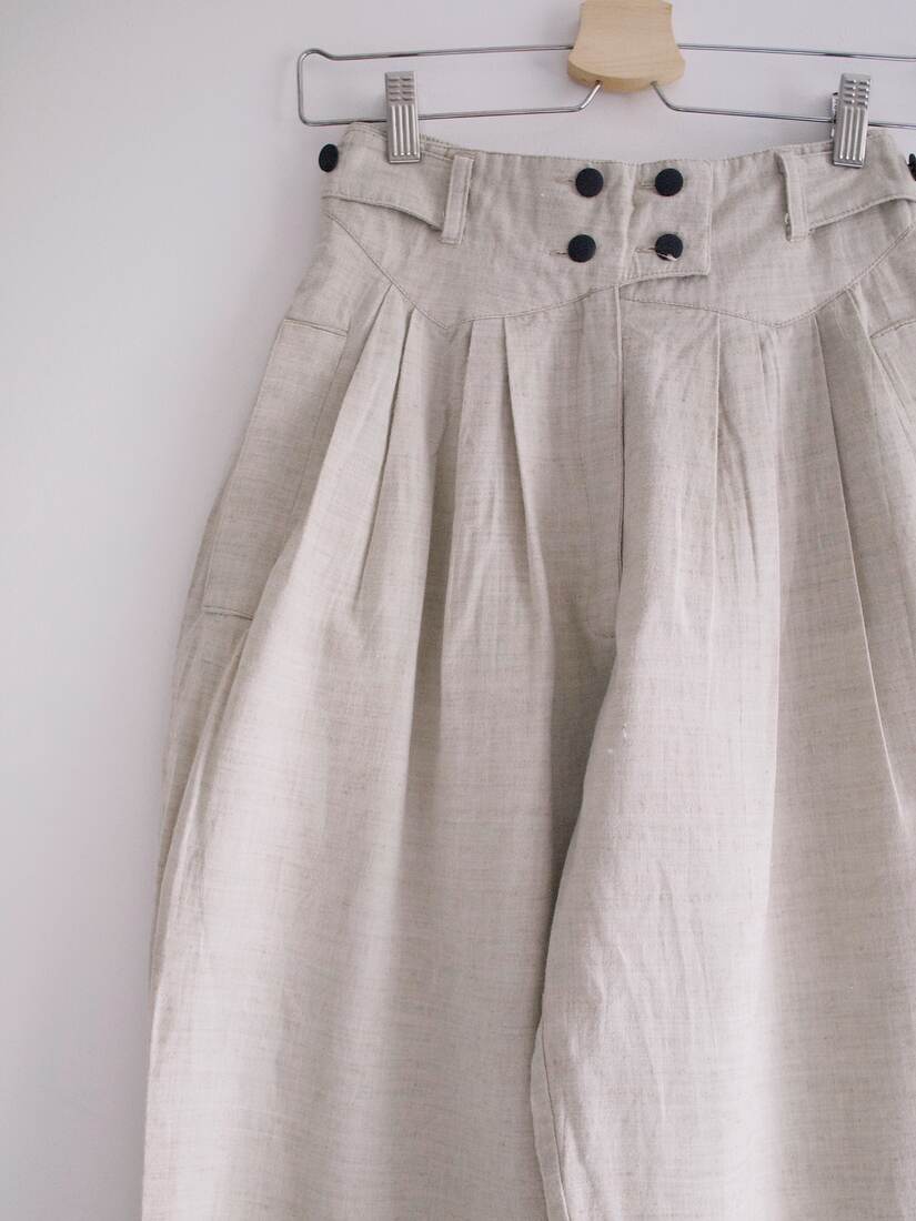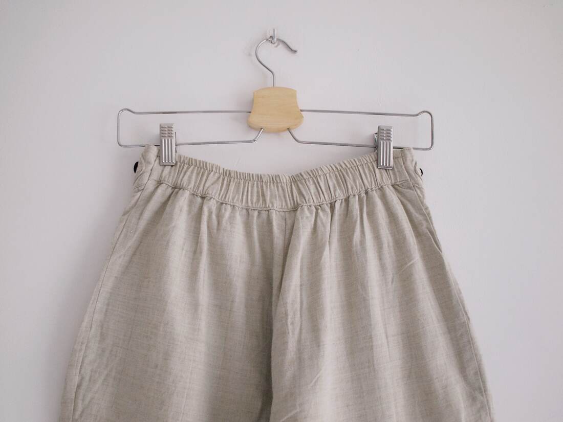 Spodnie vintage ze zwężaną talią i szerokimi nogawkami. Wycięta metka ze składem, jest to len z dodatkami. Rozmiar z metki 38, spodnie mają dość wąską talię, więc polecam na XS-S.