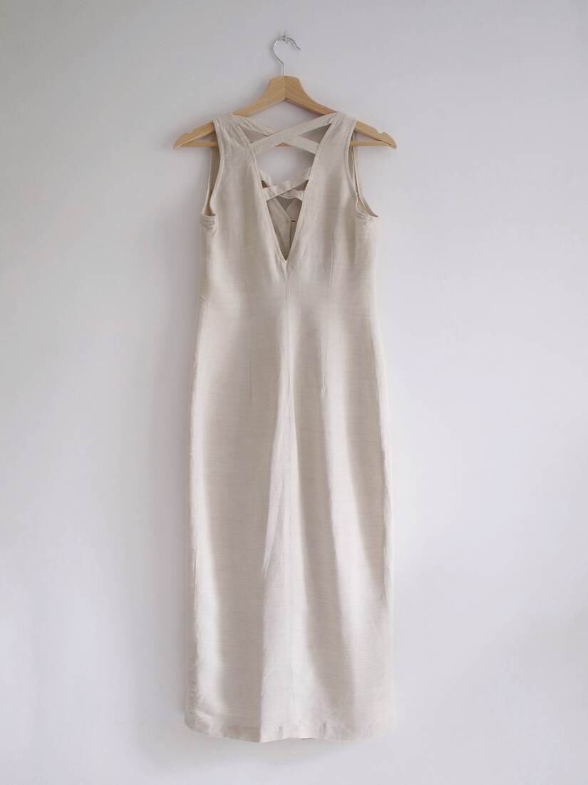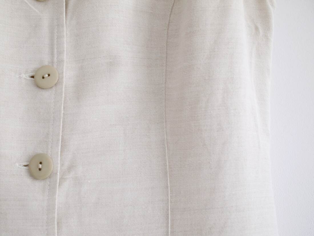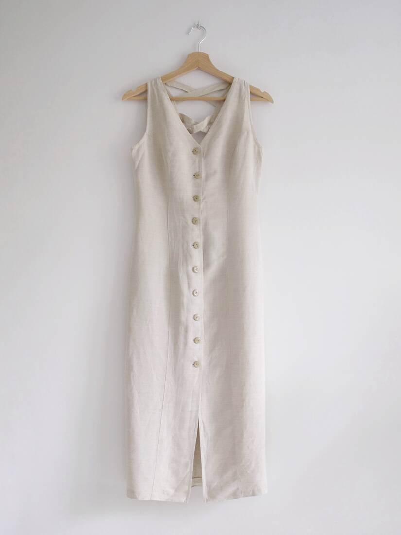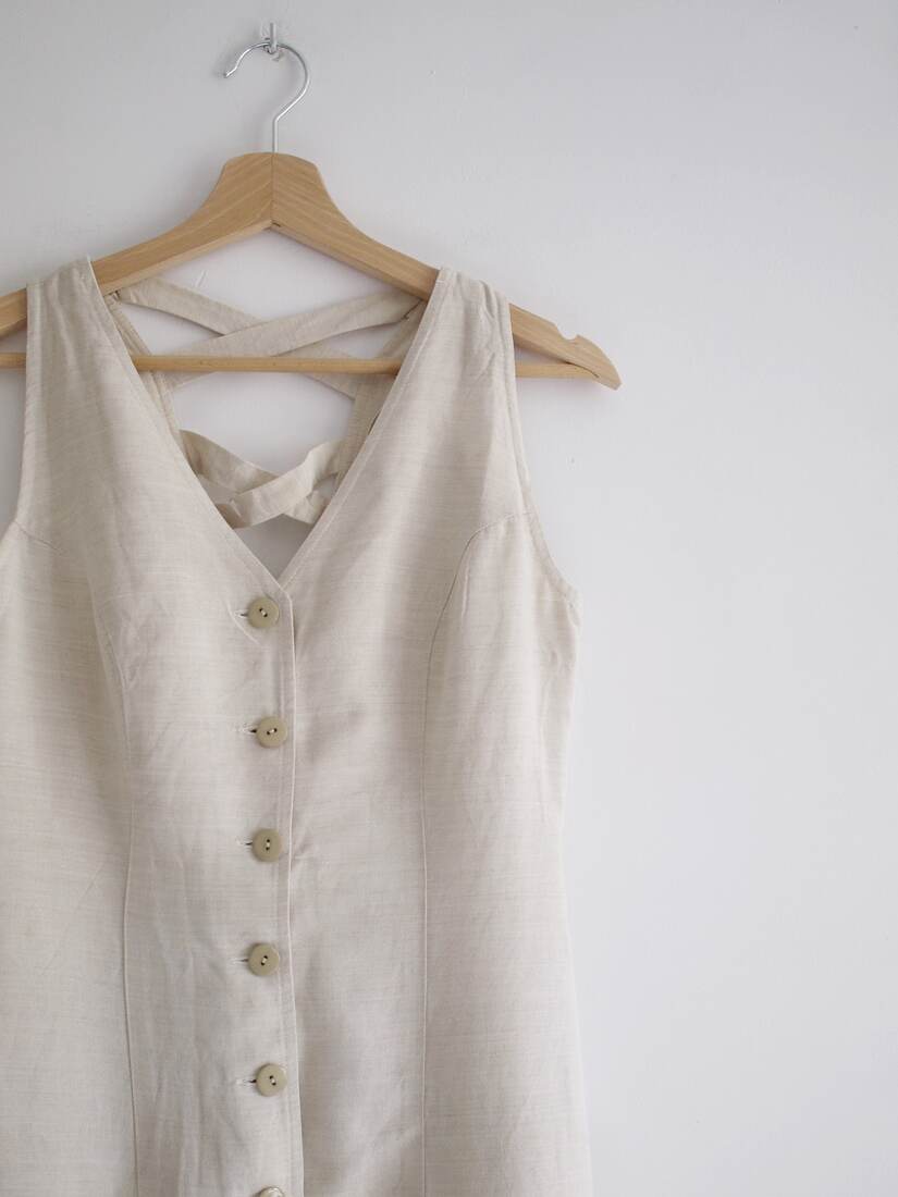 Letnia sukienka vintage wykonana z tkaniny bawełniano-lnianej. Zapinana po całości na guziki. Rozmiar z metki S, polecam na XS-S. Bardzo dobry stan.