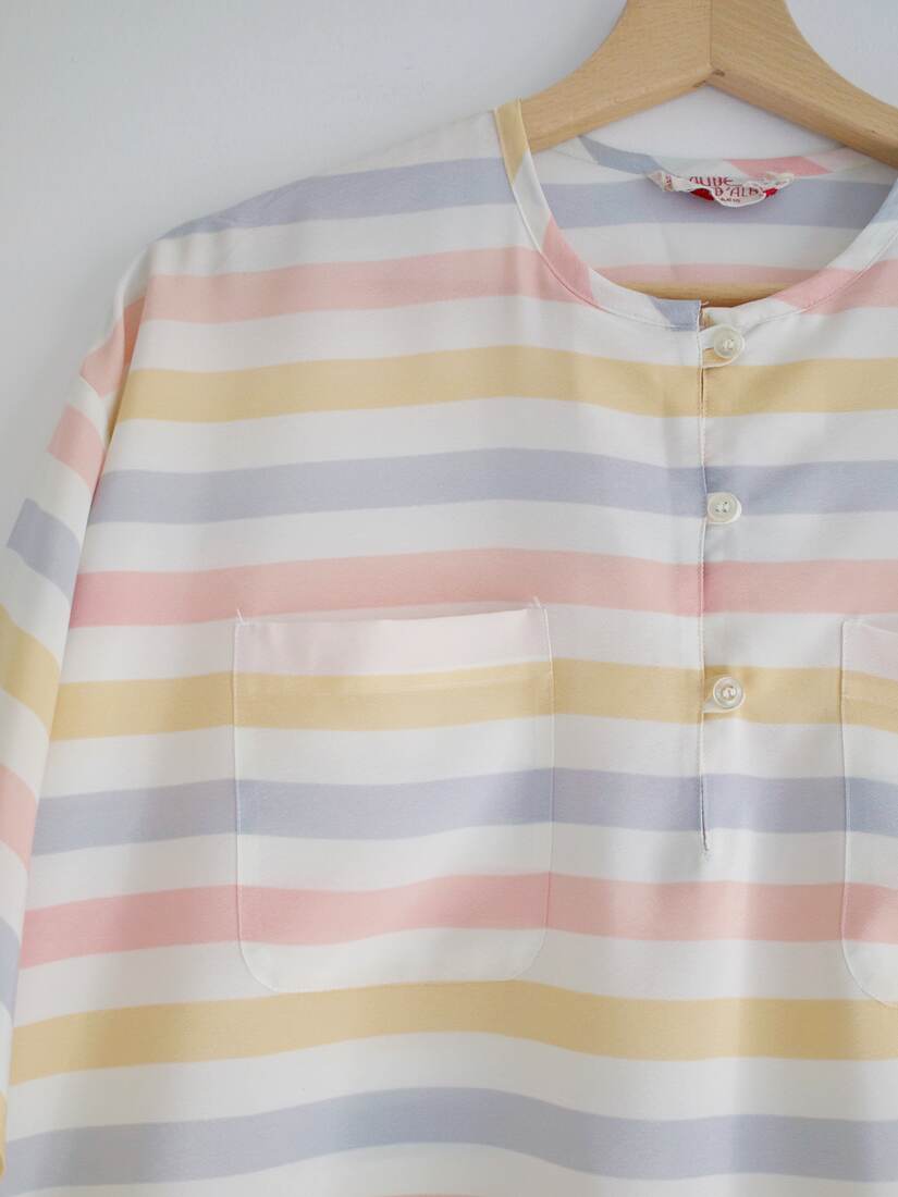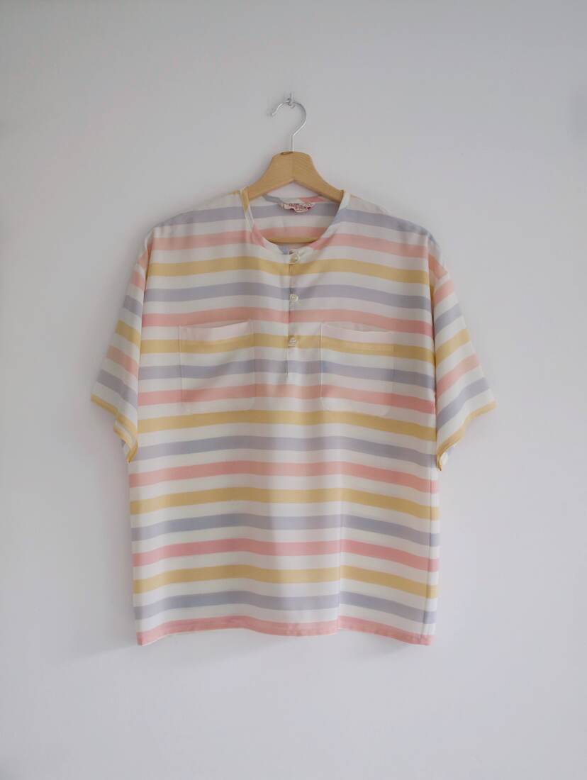 Bluzka vintage, wyprodukowana we Francji. Pudełkowy krój, obniżone ramiona. Zależnie od preferowanego dopasowania będzie pasować na S-M-L. Bez wad.