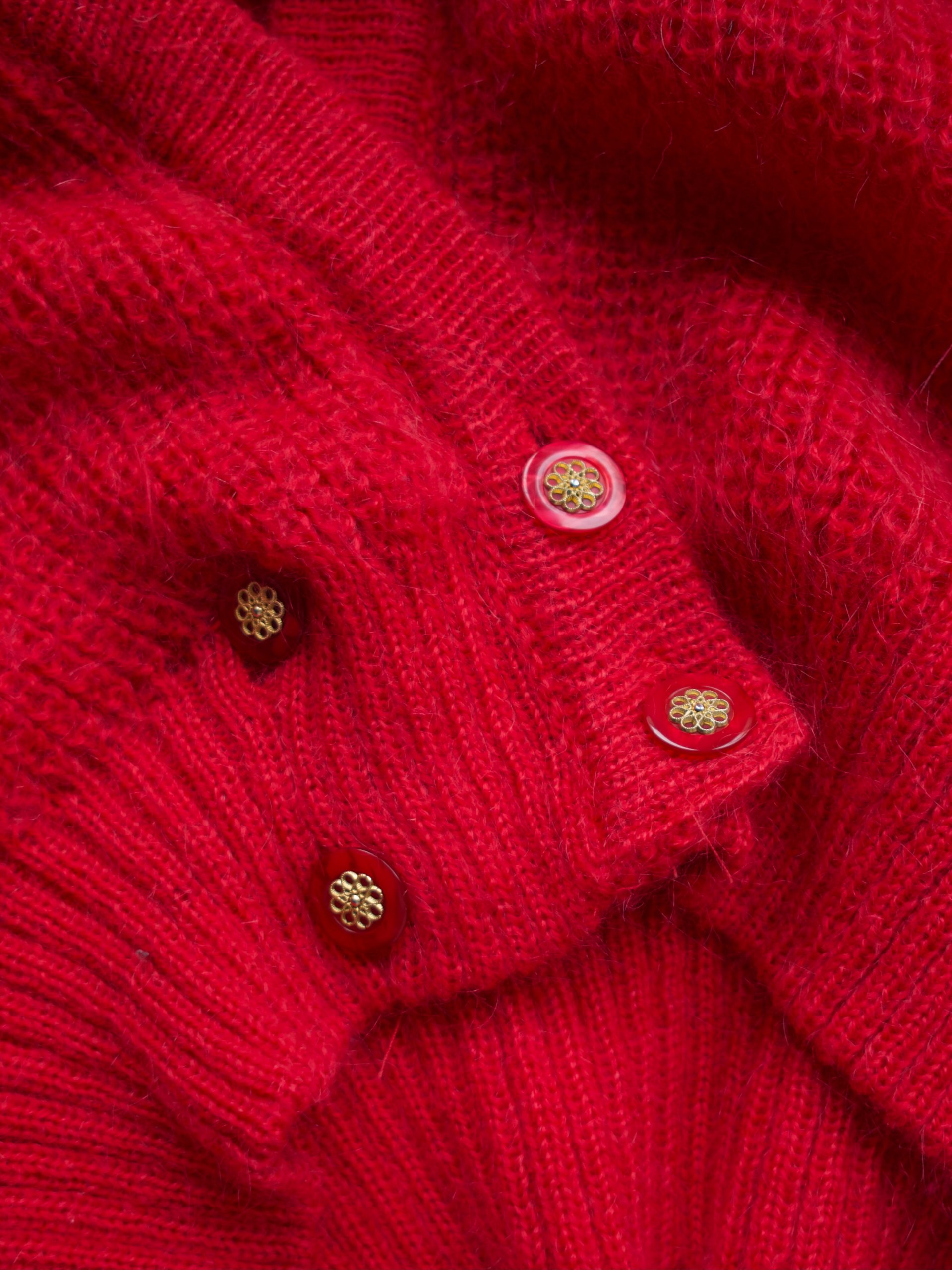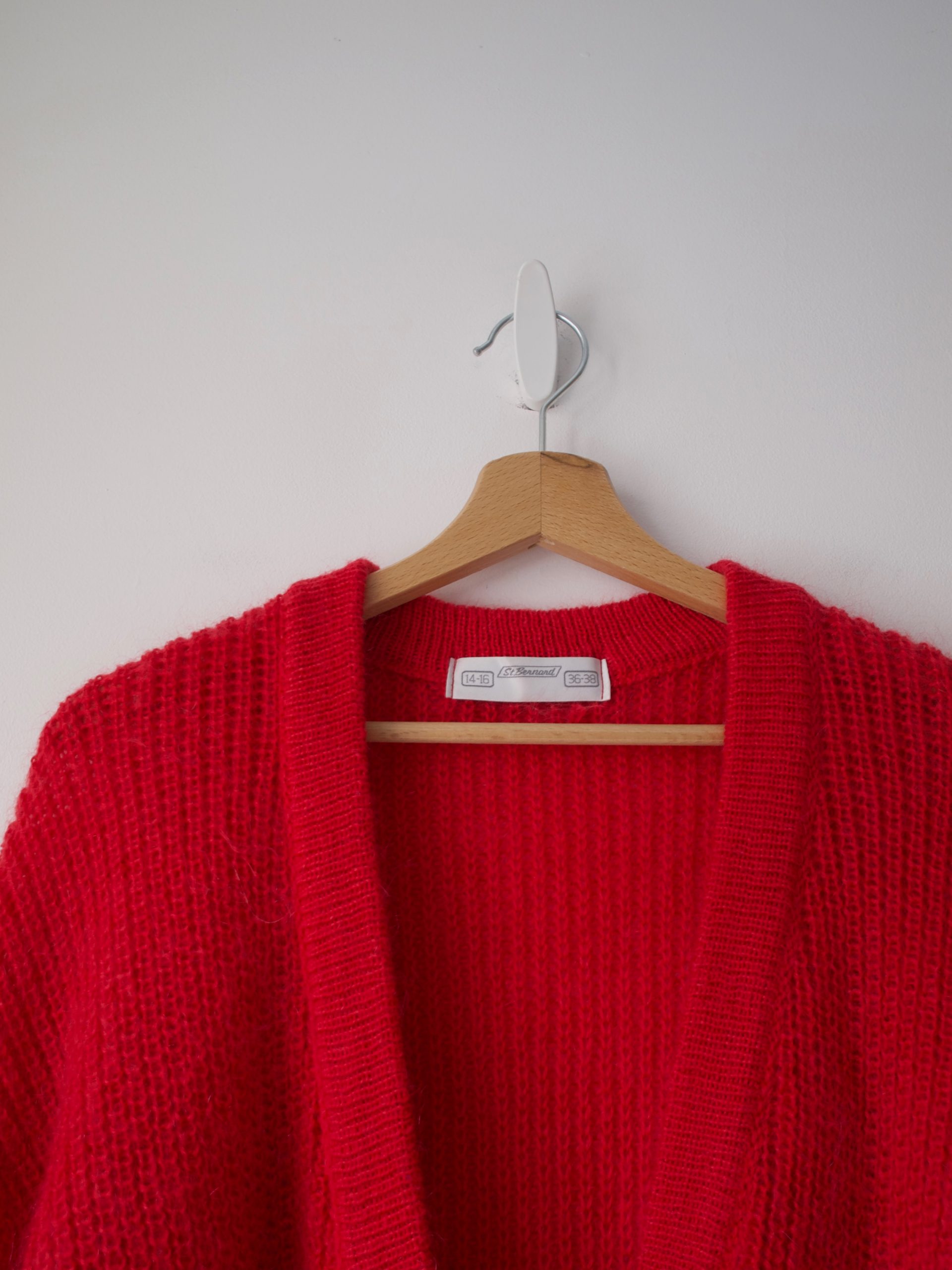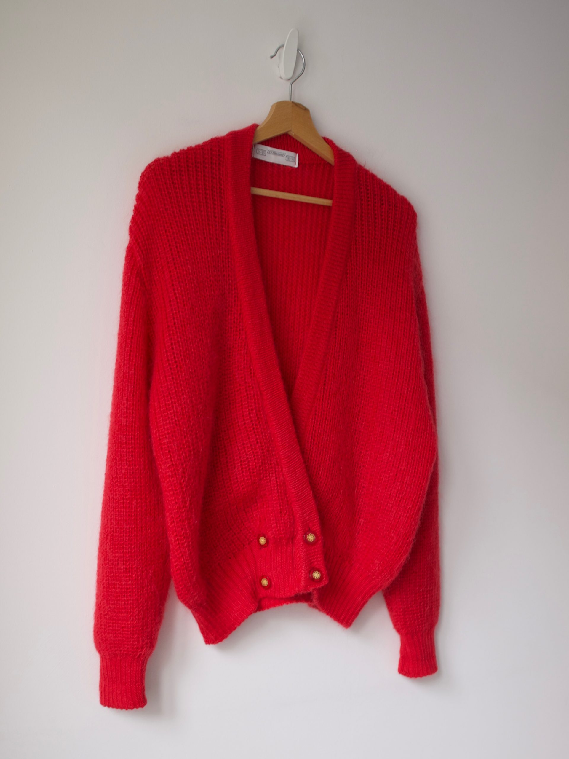 Puszysty sweter vintage, wykonany z materiału z dużym dodatkiem moheru. Kolor wpada w malinowy.
