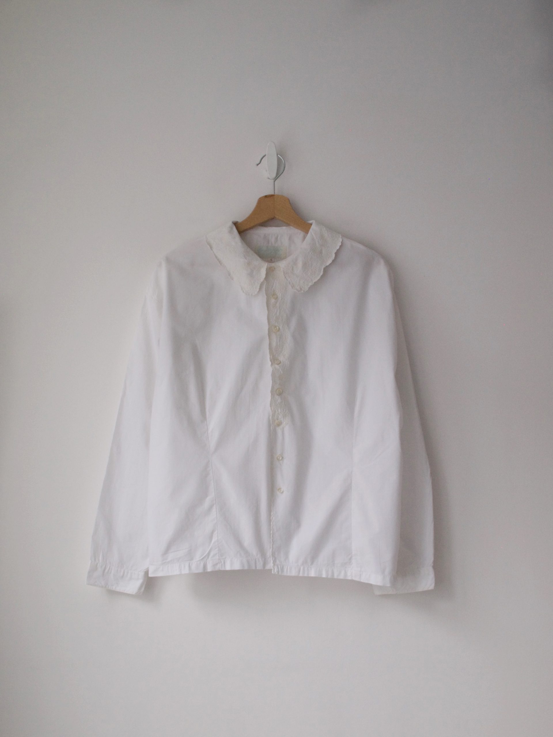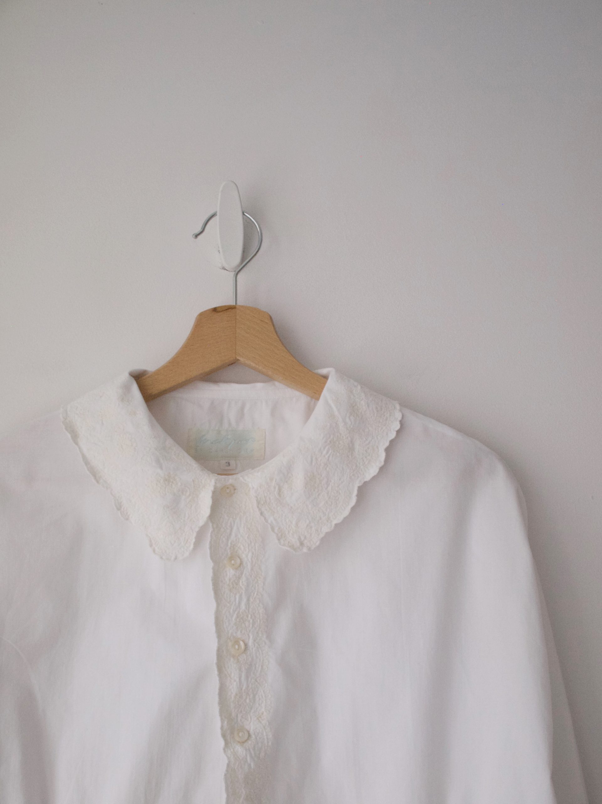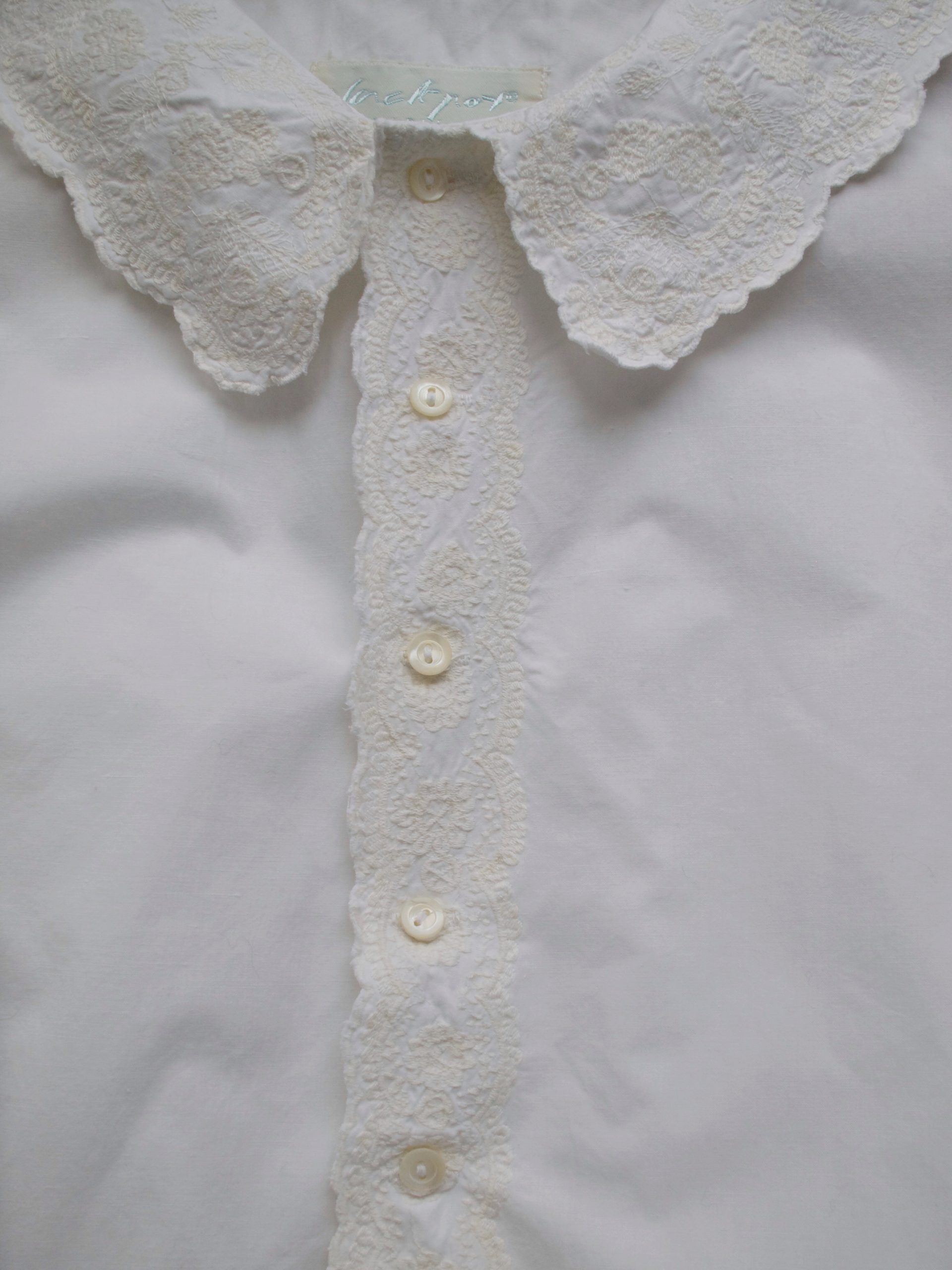 Unikatowa koszula vintage. Zdobiona haftem, guziki z naturalnej muszli. Rozmiar z metki: 3 Skład: 100% bawełna Stan: bez wad Szerokość w klatce 53 cm Długośćcałkowita 60 cm