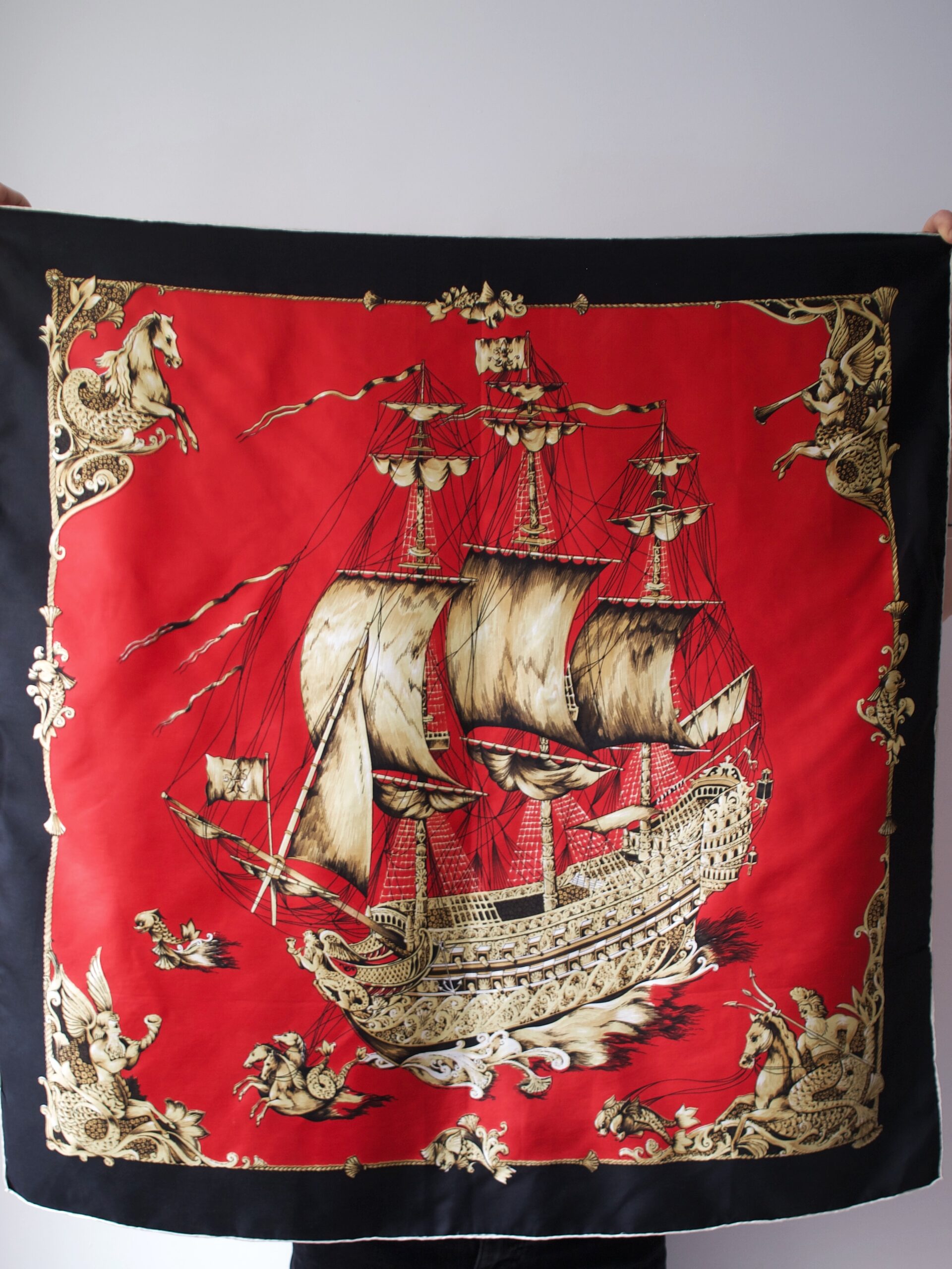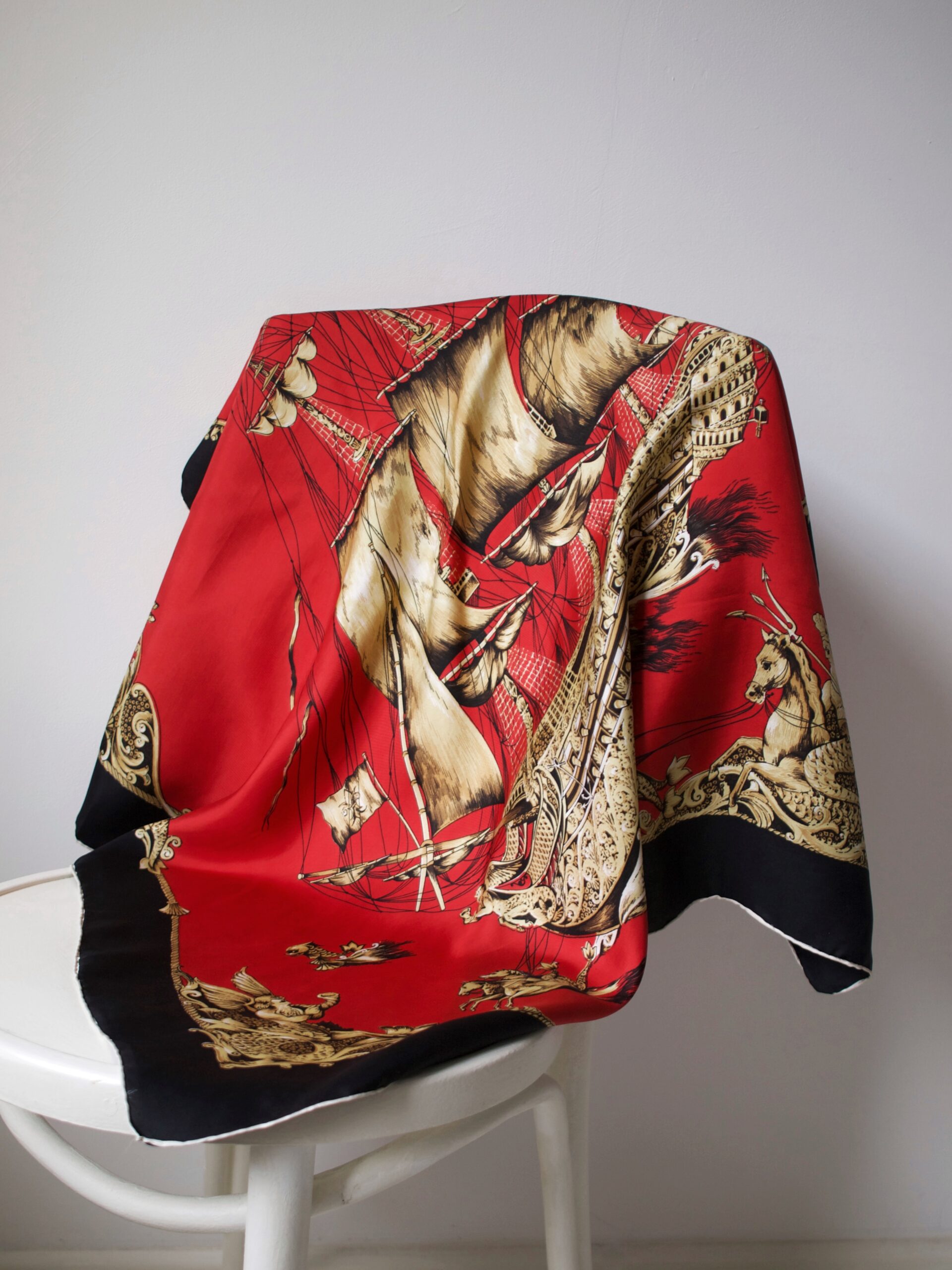 Duża chusta vintage, wykonana z gęstego jedwabiu. Ręcznie rolowana. Bez wad. Wymiary: 86*84 cm