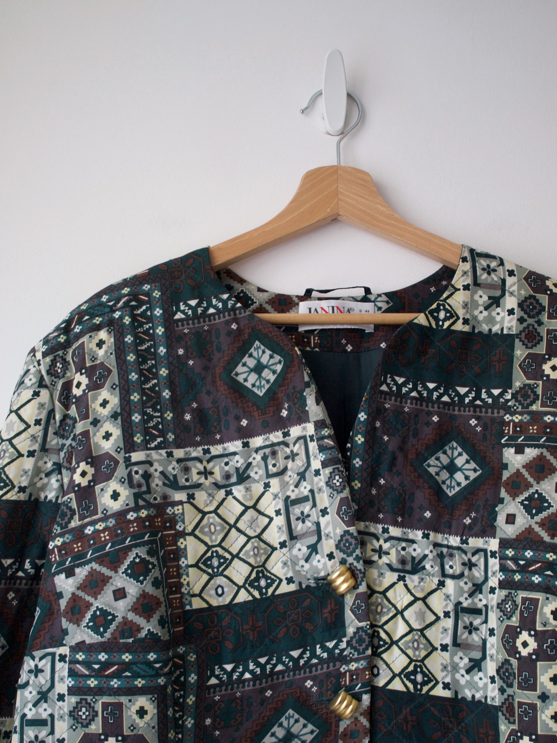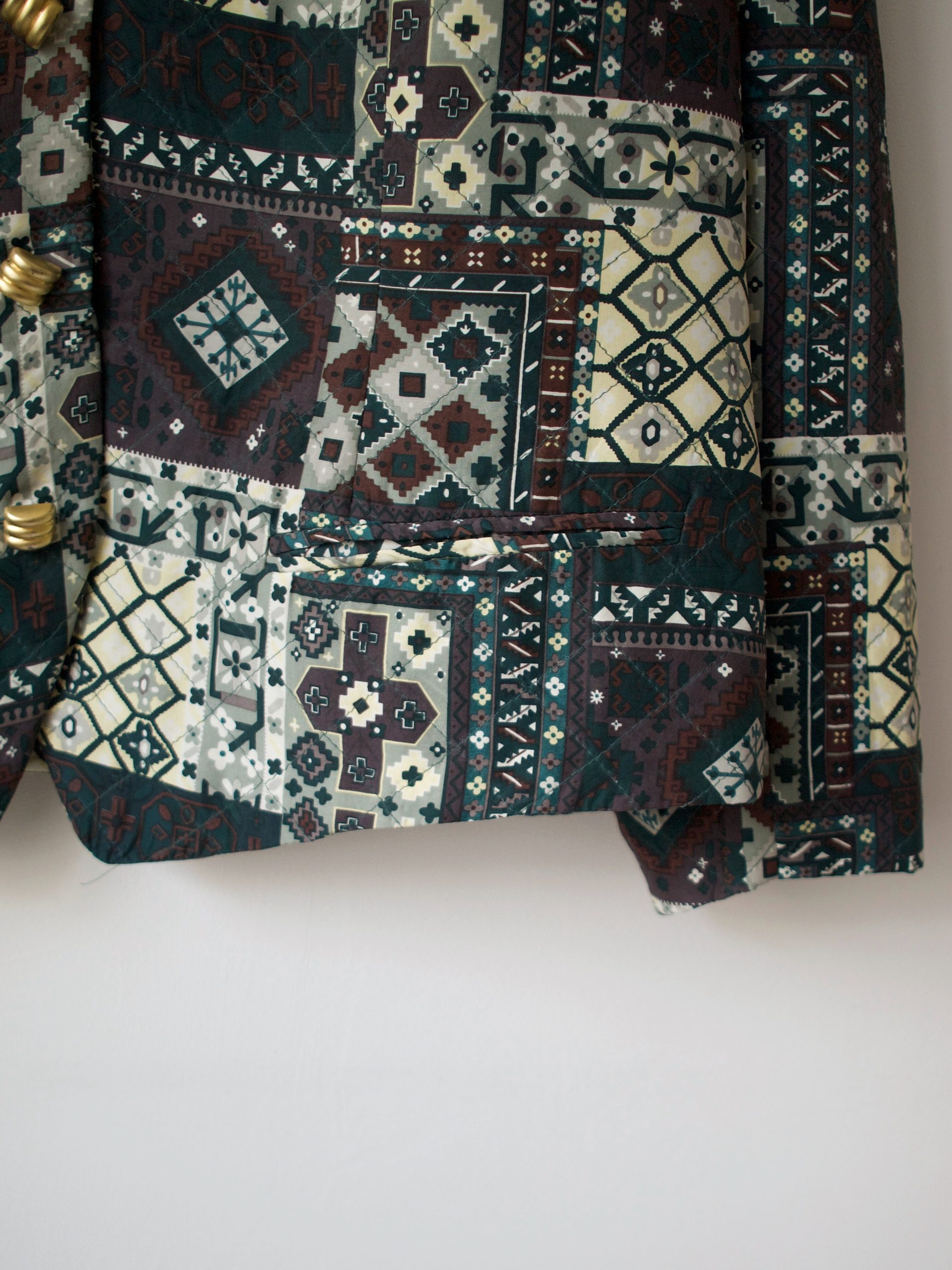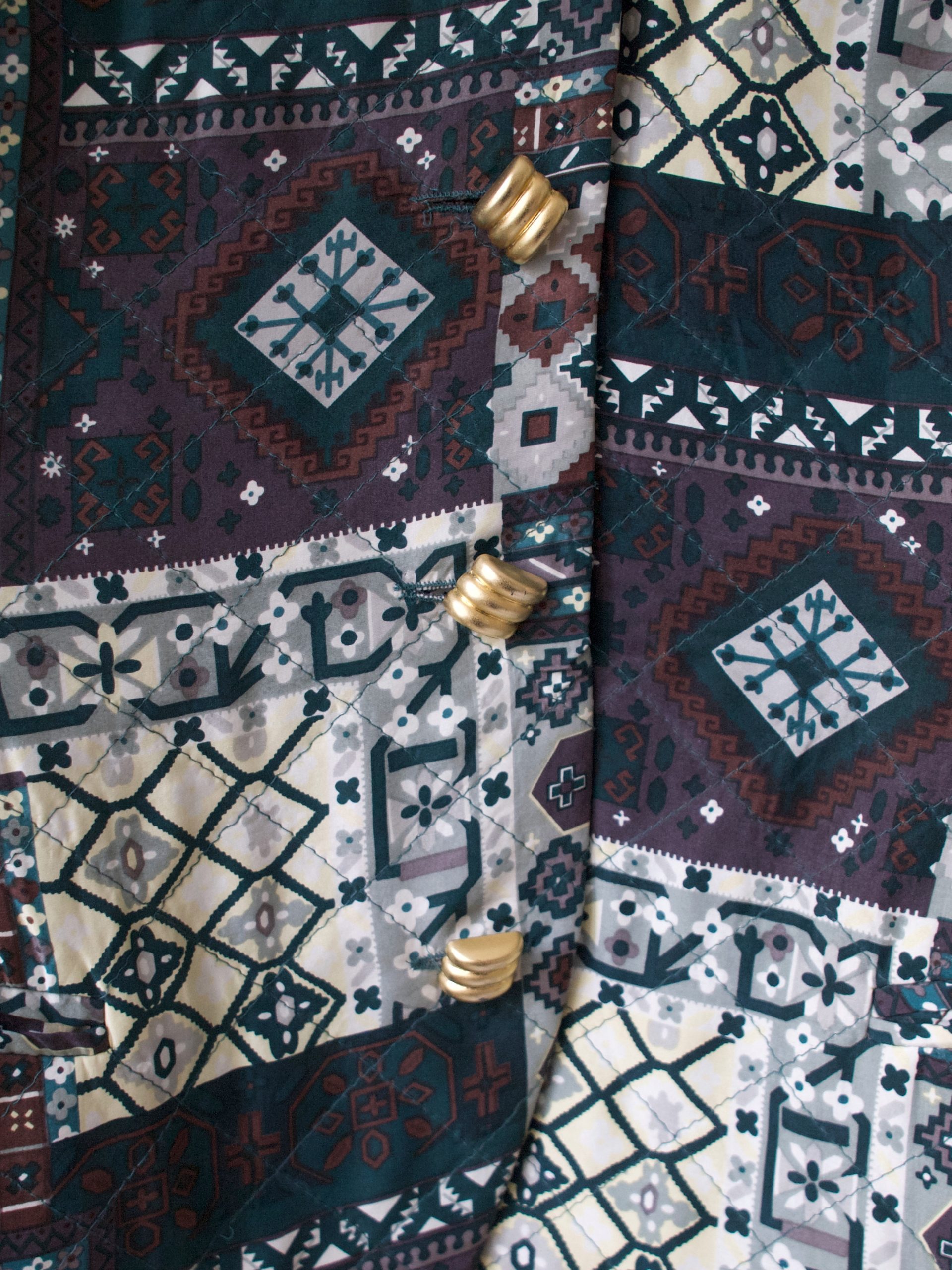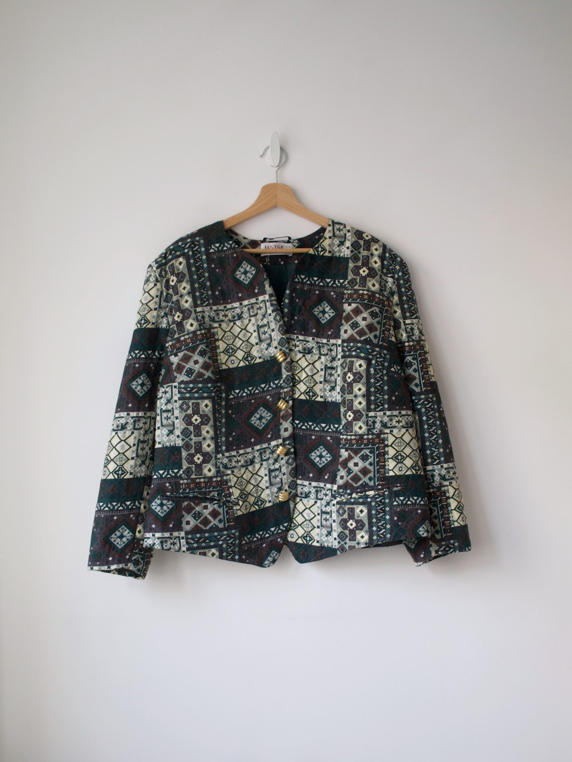 Unikatowa kurtka vintage w stylu patchwork. W 100% wykonana z jedwabiu, zapinana na piękne złociste guziki. Pudełkowy fason, idealna dla miłośniczki oversize’u.