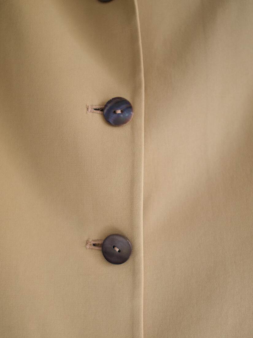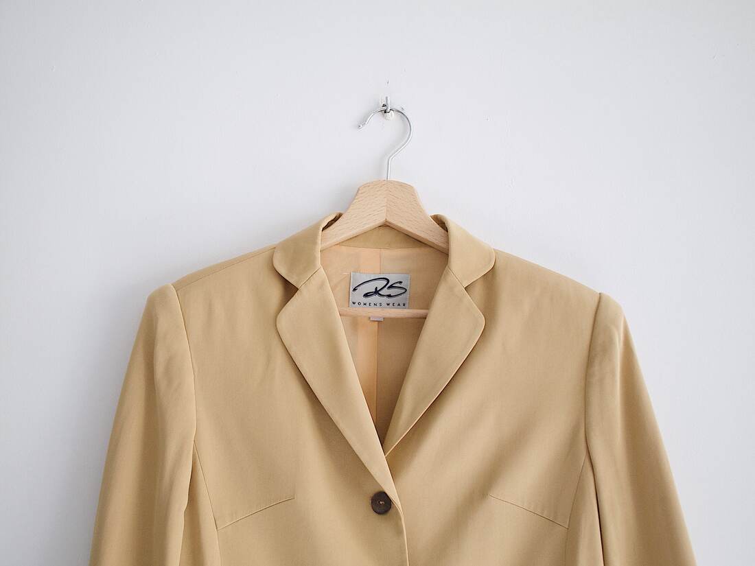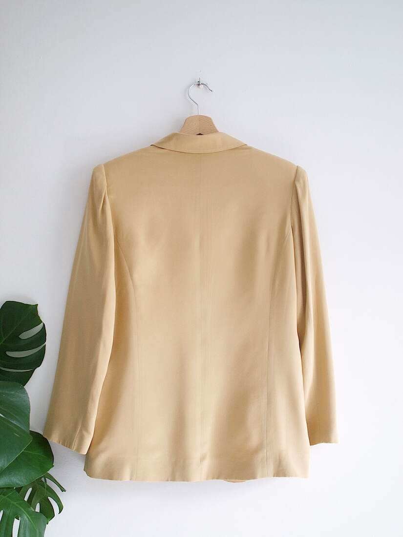 Jedwabna marynarka vintage w złocistym beżowym kolorze. Materiał wierzchni 100% jedwab, podszewka 100% acetat, zapinana na guziki z naturalnej muszli. Rozmiar z metki 36. Bez wad, po czyszczeniu chemicznym.