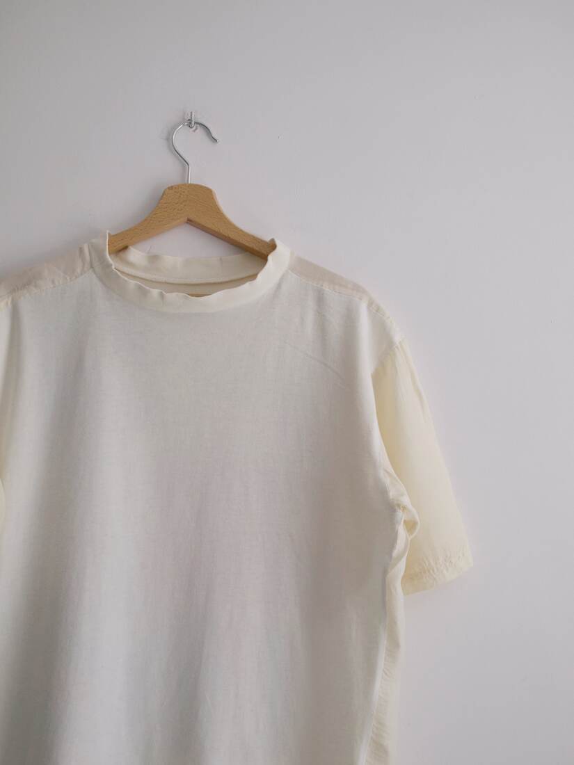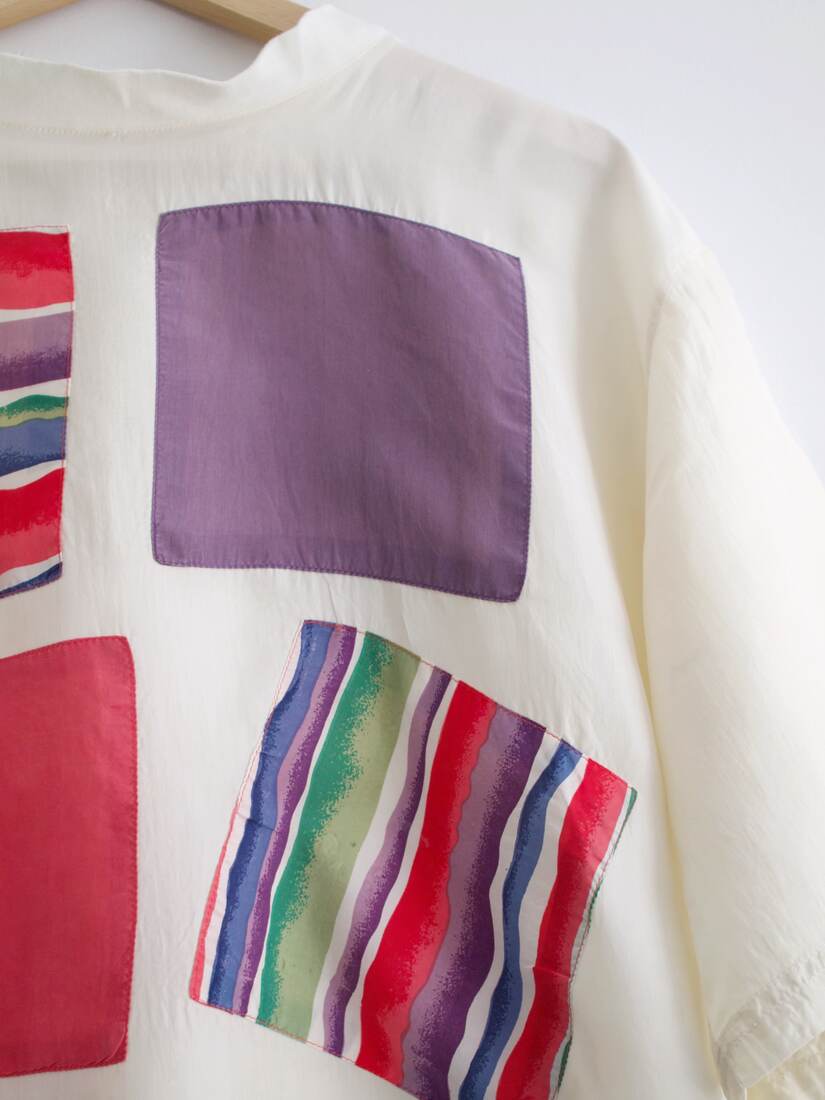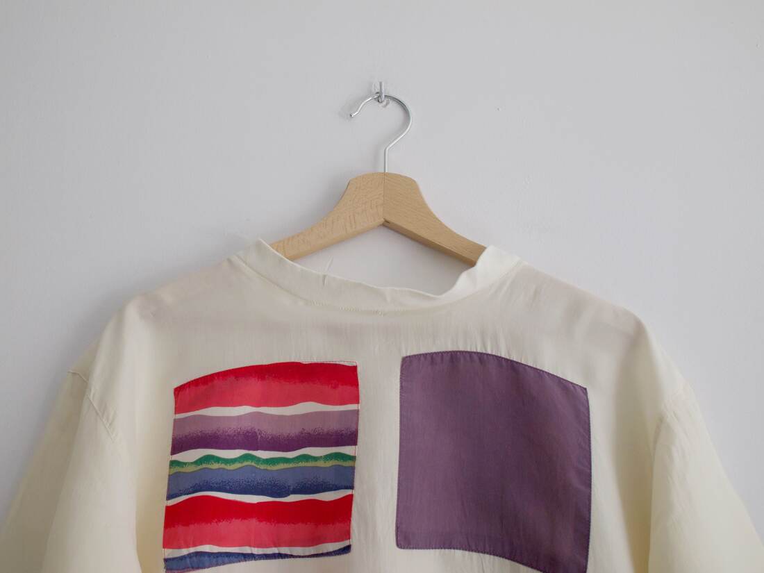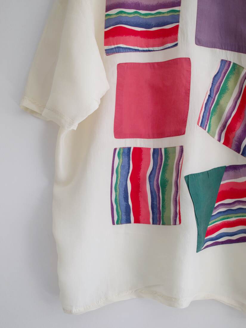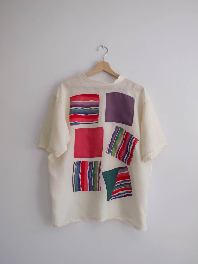 Unikatowy t-shirt vintage, wykonany z łączonych materiałów. Przód jest wykonany z jedwabiu, bawełniany tył. Rozmiar z metki 40, bardzo dobry stan.