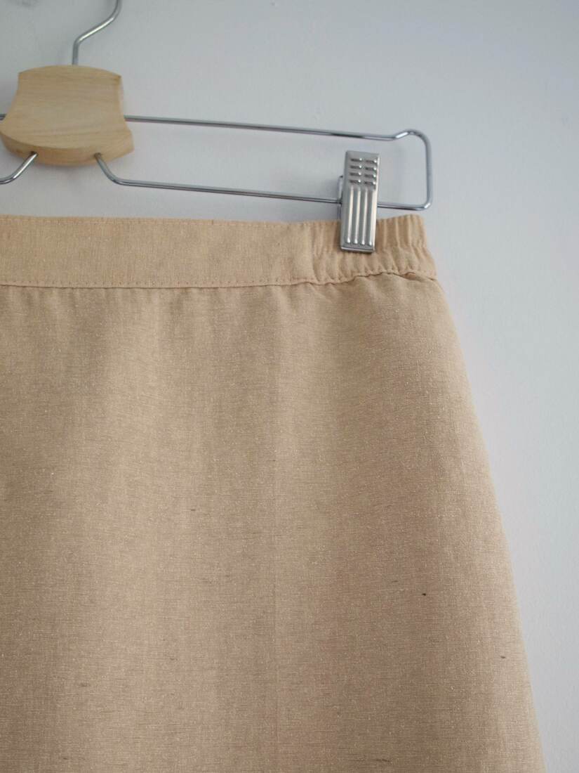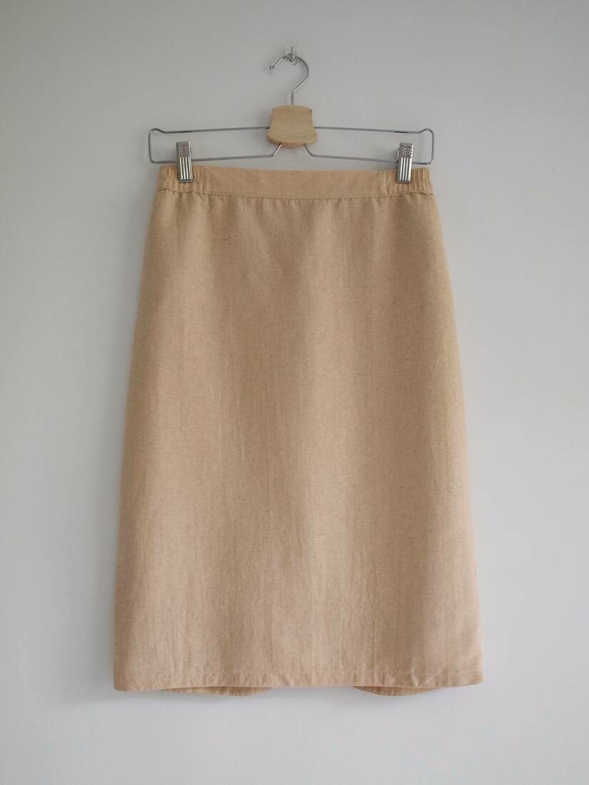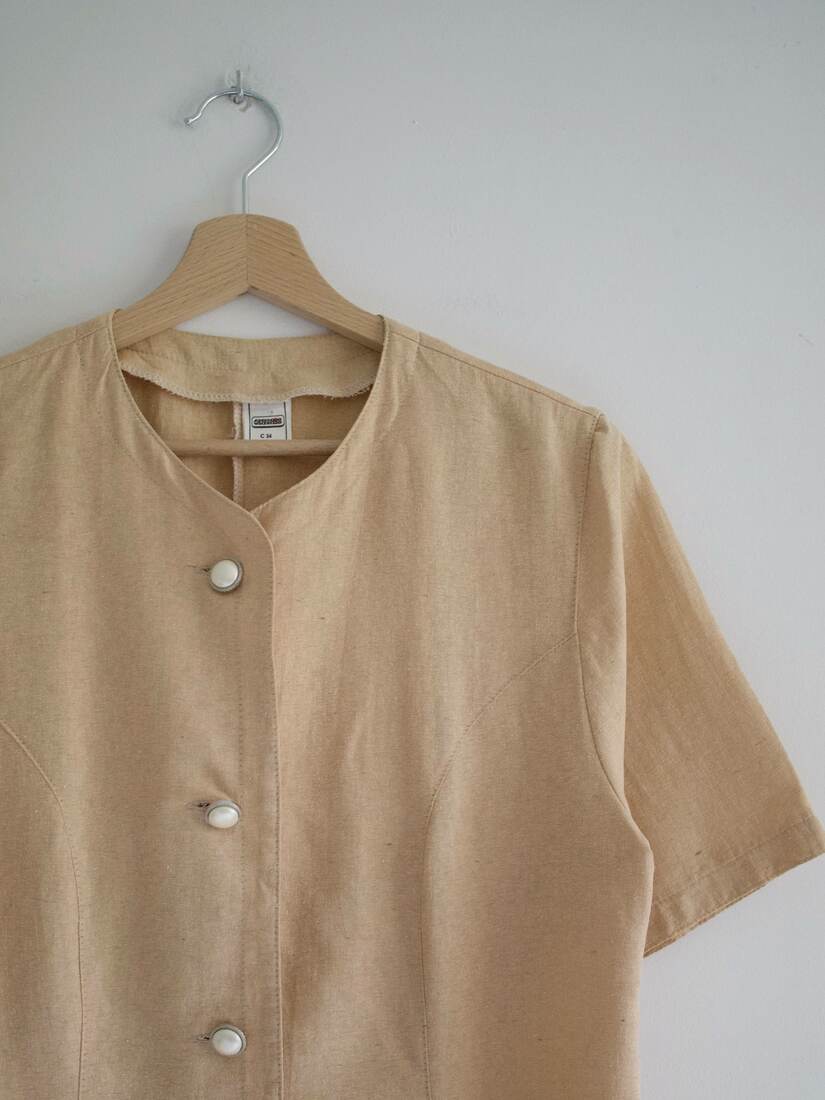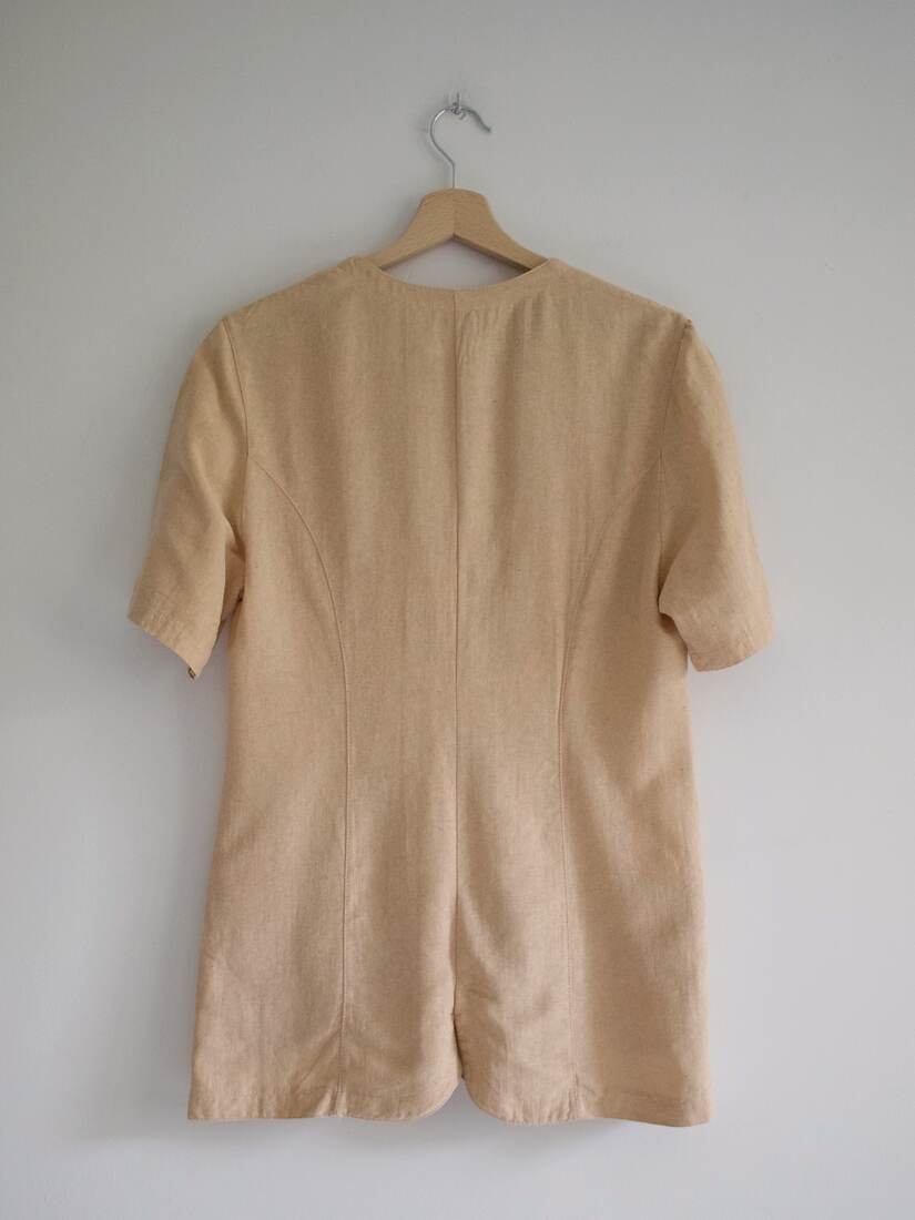 Vintage zestaw szyty z materiału z dużym dodatkiem surowego jedwabiu. Marynarka bez podszewki, zapinana na guziki a’la perły, spódnica z podszewką, z zapięciam z tyłu.