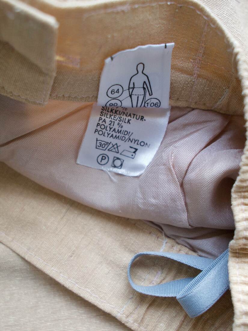 Skład 79% jedwab, 21% poliamid, podszewka spódnicy wiskoza