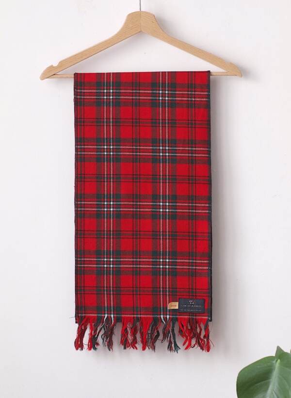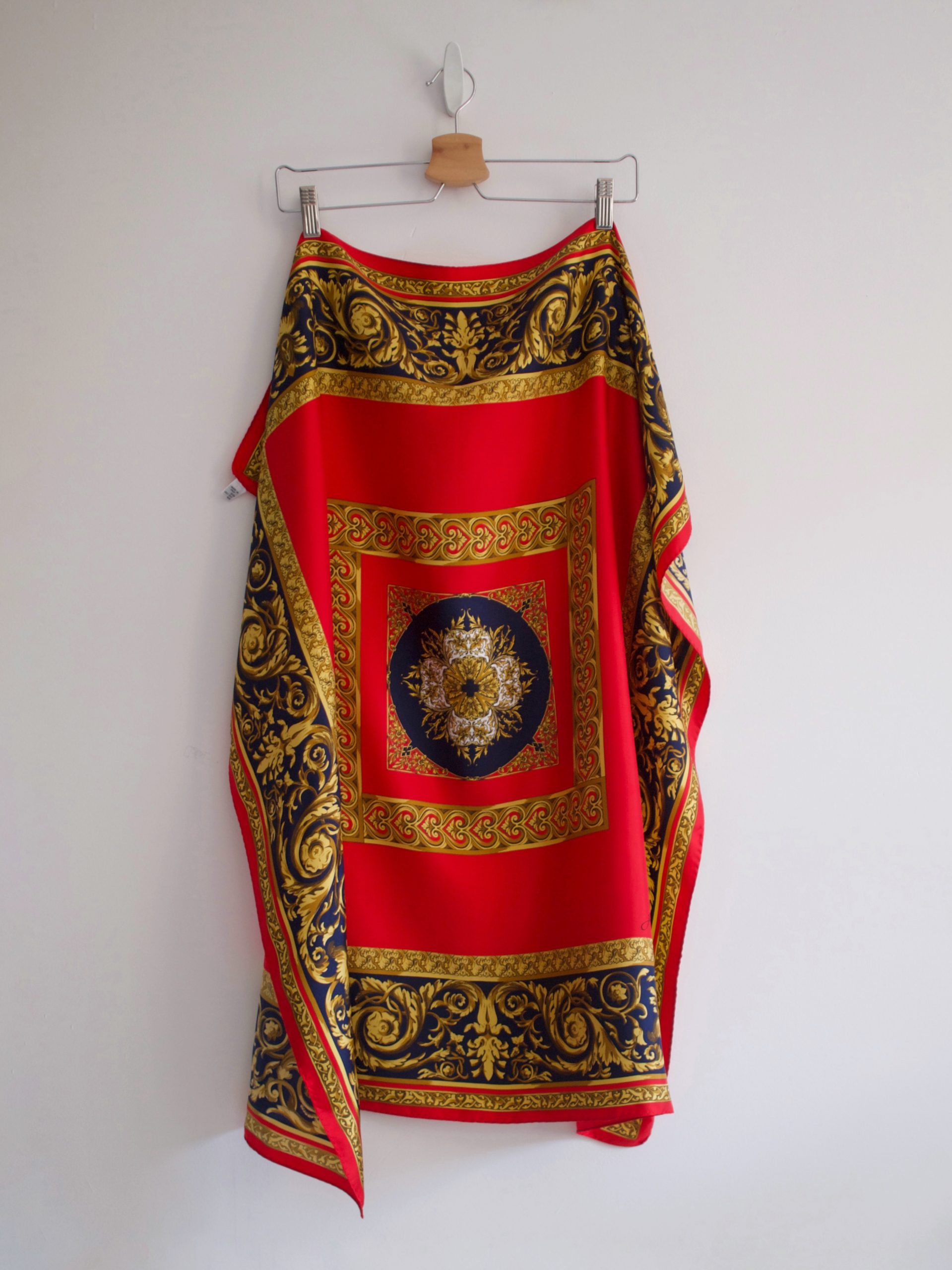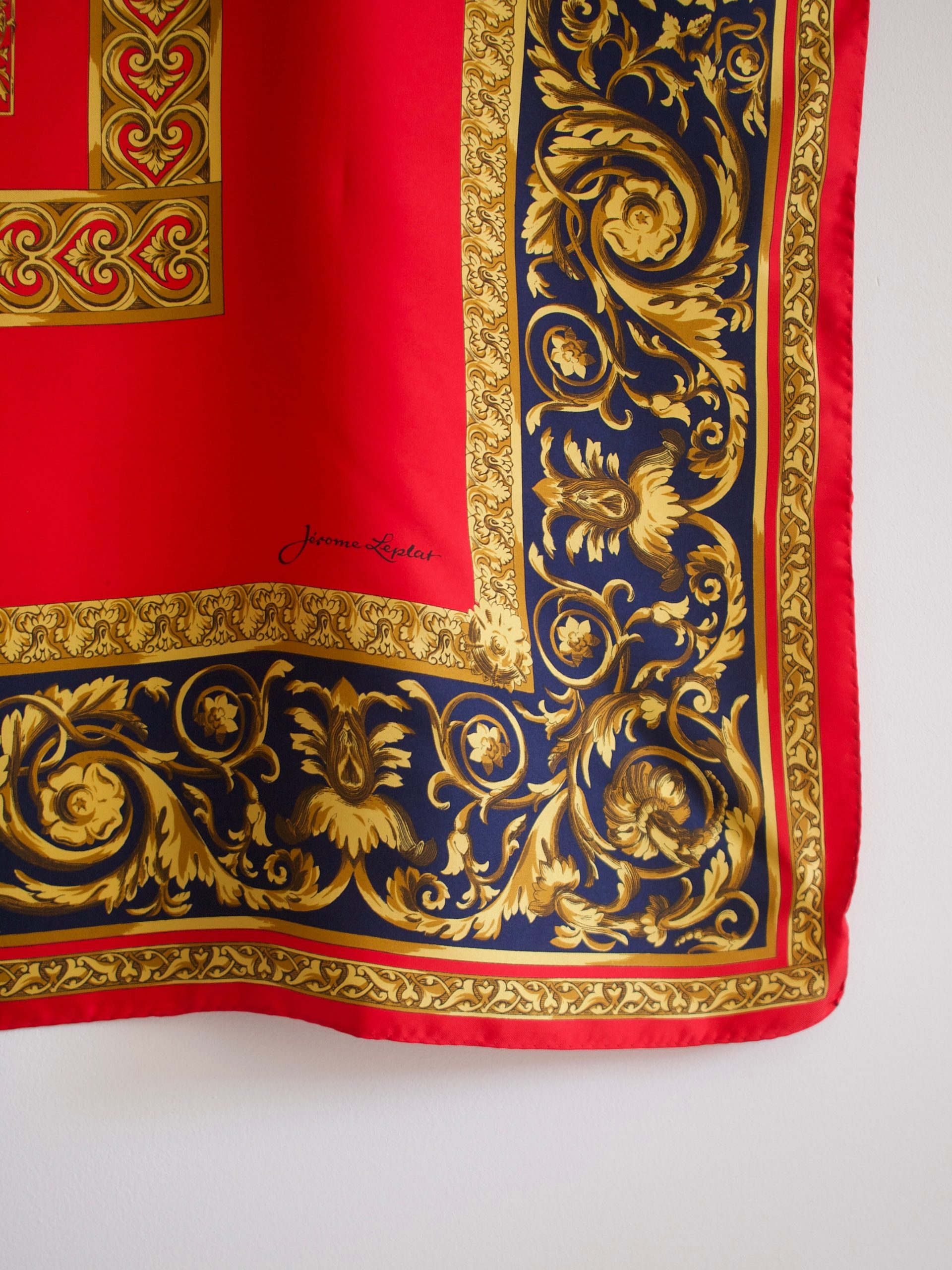 Duża jedwabna chusta vintage. Wykonana gęstego jedwabiu typu twill w intensywnej czerwieni z bogatym ornamentem w odcieniach złota i granatu. Ręcznie rolowane brzegi. Bez wad.