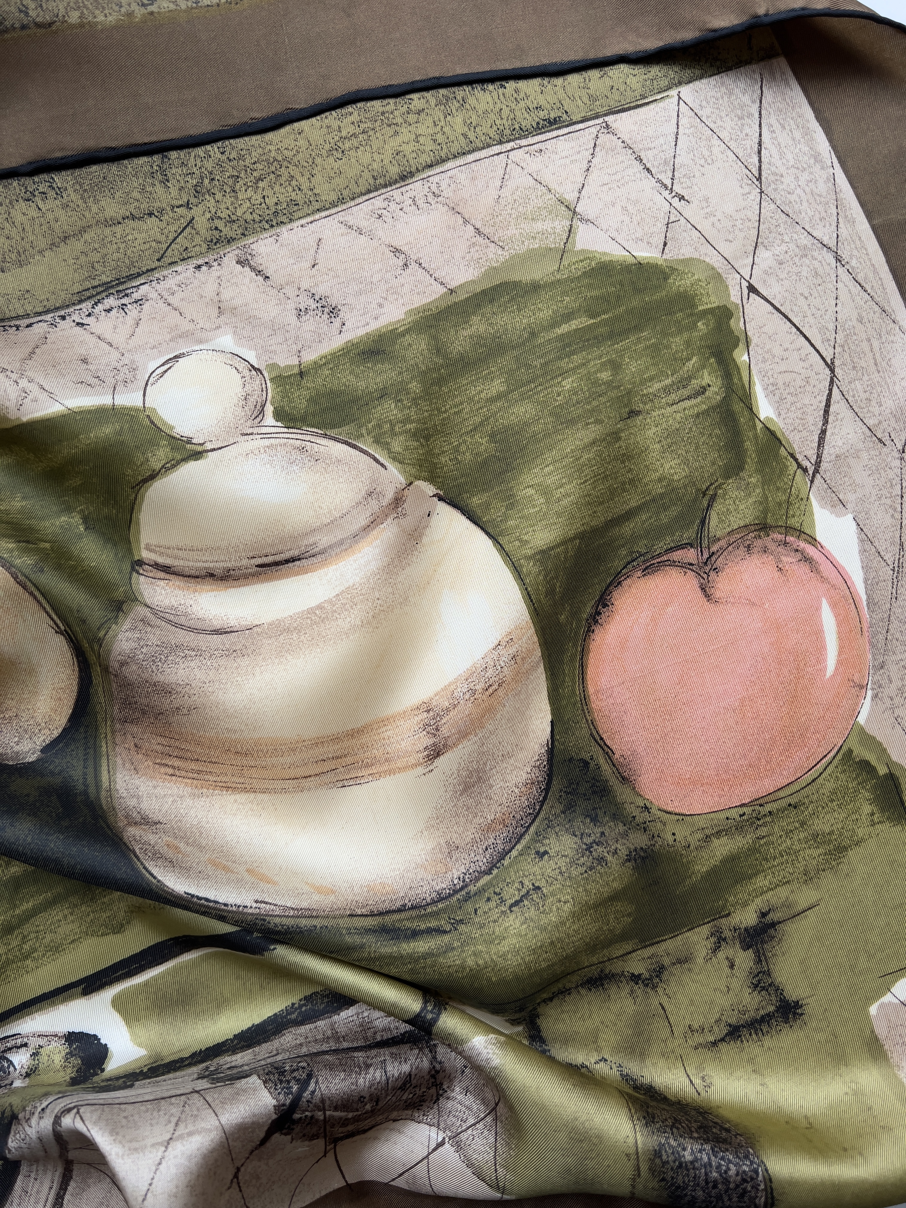 Apaszka vintage z obrazem, ręcznie rolowana. Brak metki ze składem, jest to jedwab. Idealny stan. Wymiary: 78*77 cm