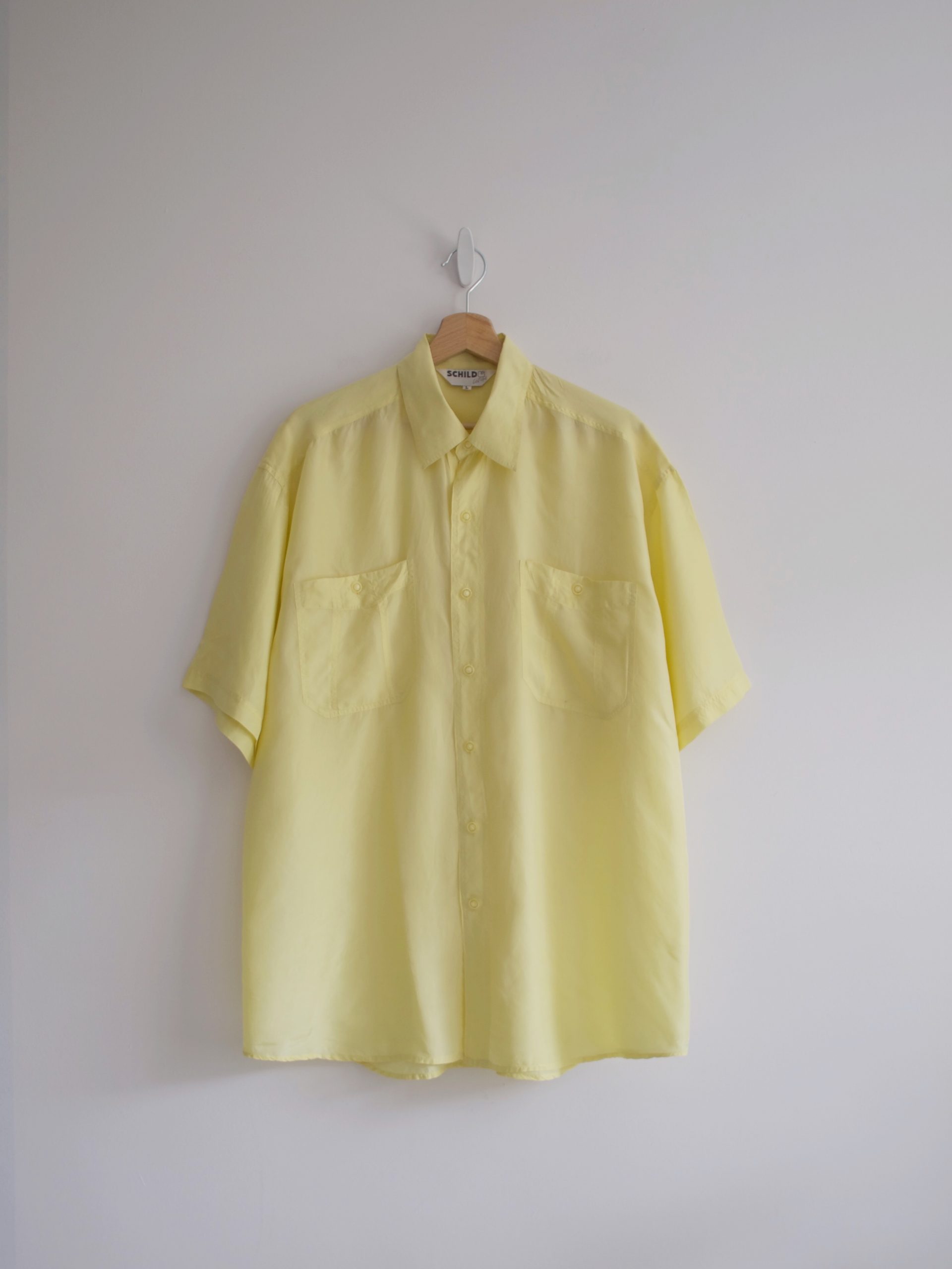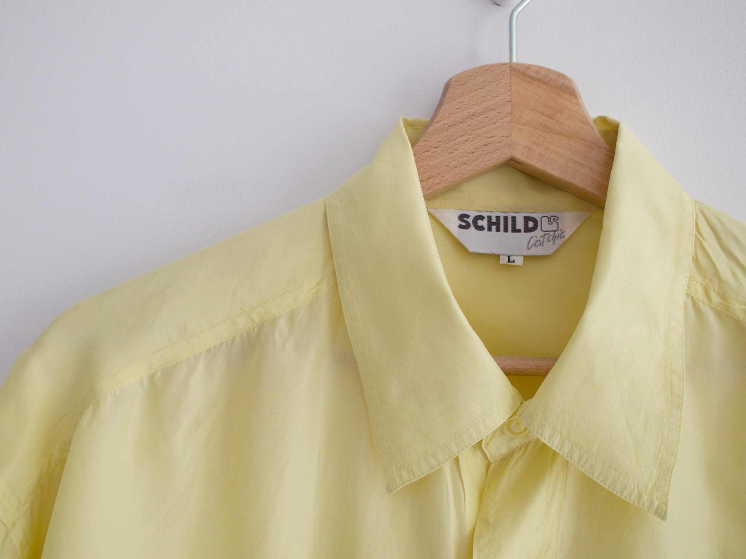 Jedwabna bluzka vintage w pięknym, pastelowym odcieniu żółci. Rozmiar z metki: L, bardzo luźna Skład: 100% jedwab Stan: bardzo dobry Szerokość w klatce 62 cm Długośćcałkowita 81 cm