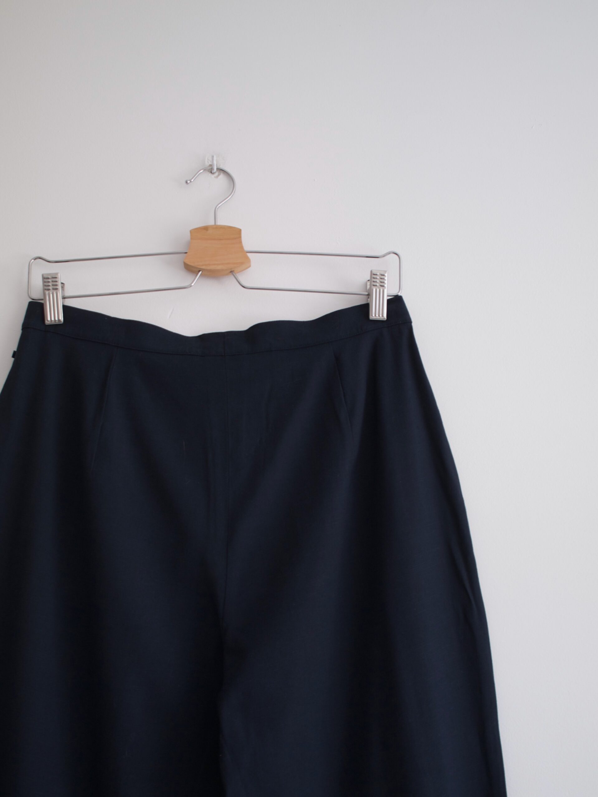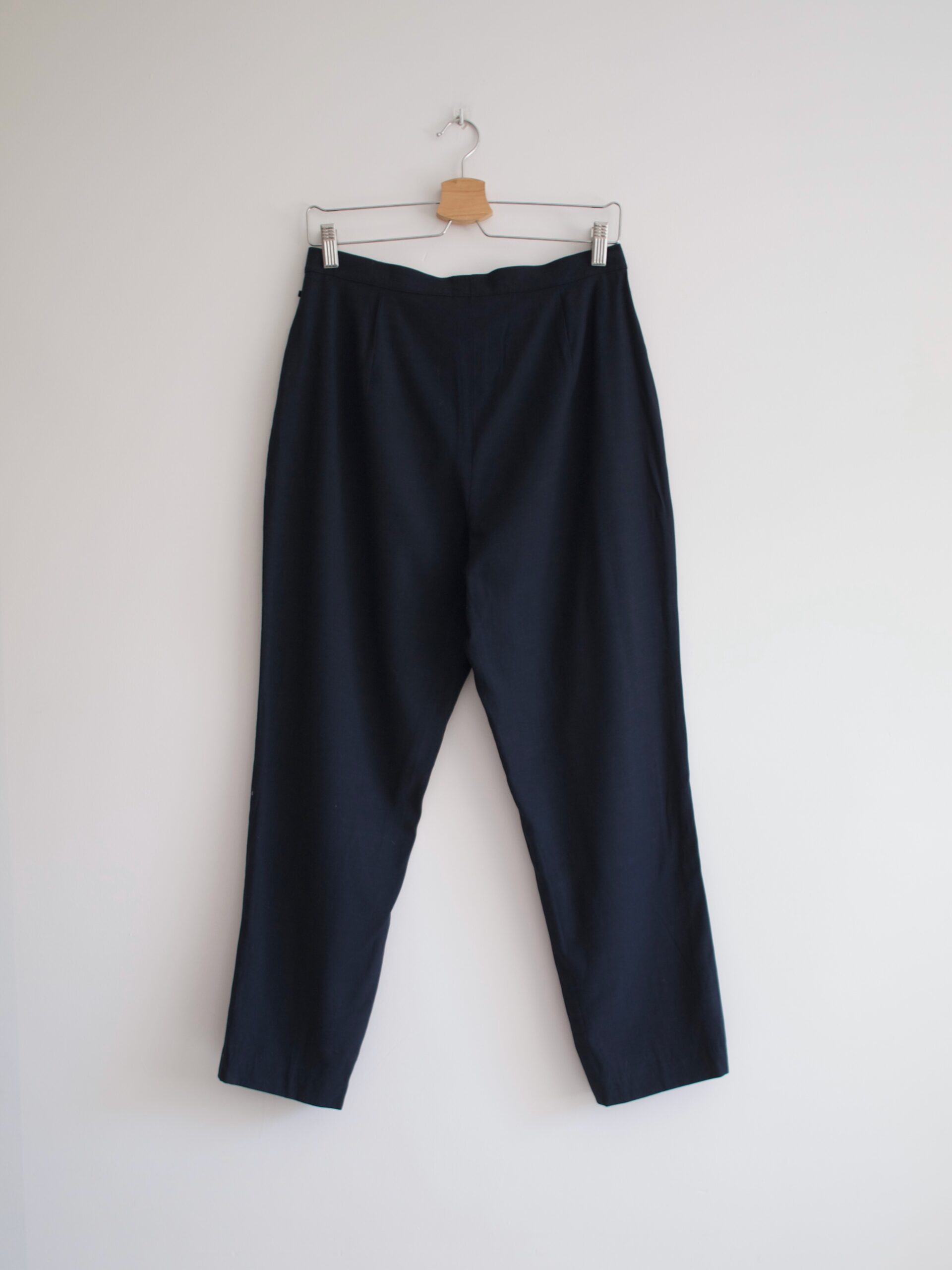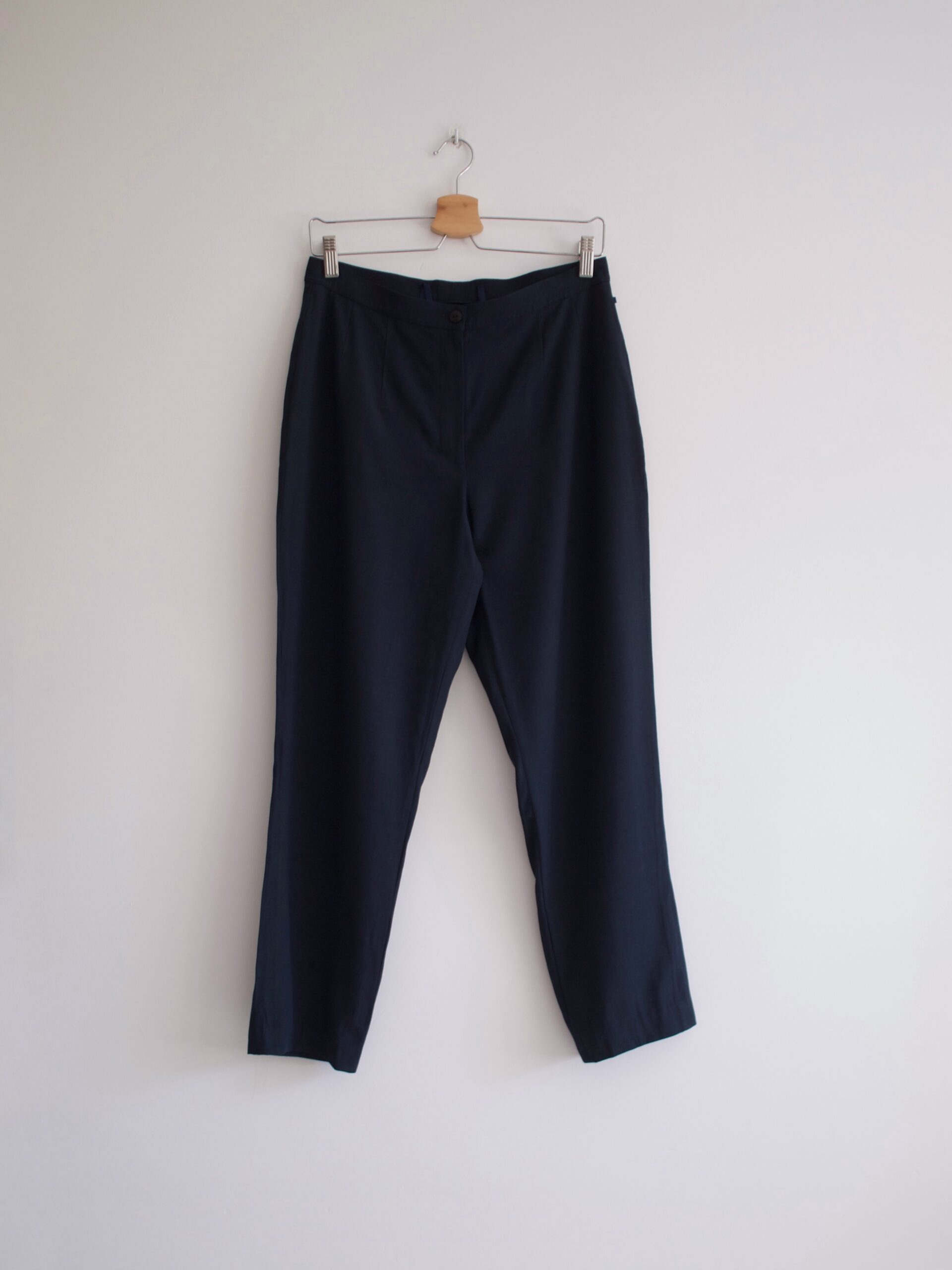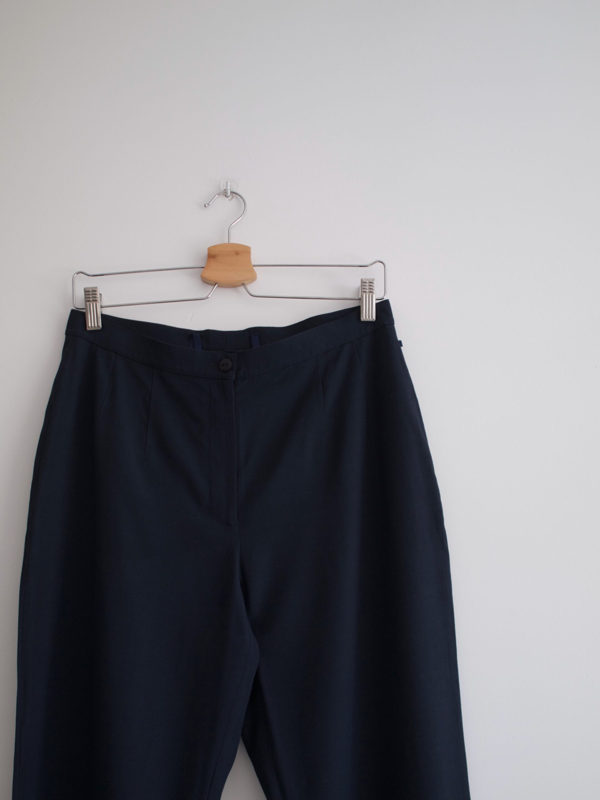 Granatowe cygaretki vintage. Fason z zawężaną talią, bez kieszeni.