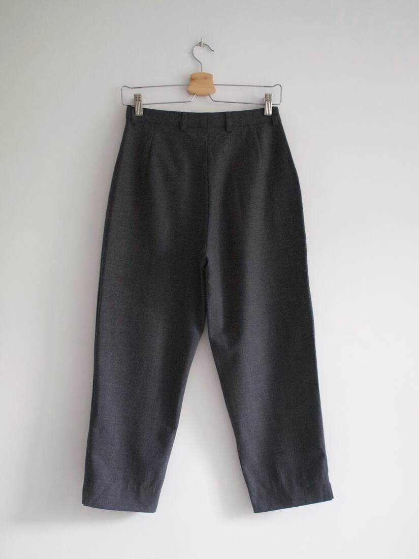 Spodnie vintage wykonane z materiału z dużym udziałem wełny. Nie były noszone, posiadają metkę materiałową (na zdjęciach). Zawężane w talii, w pasie mała gumka, nogawki zawężane ku dołu, kieszenie. Rozmiar wypada n S-M, wymiary poniżej.