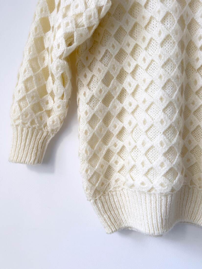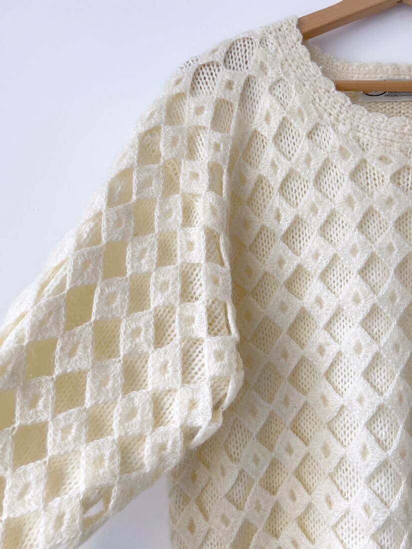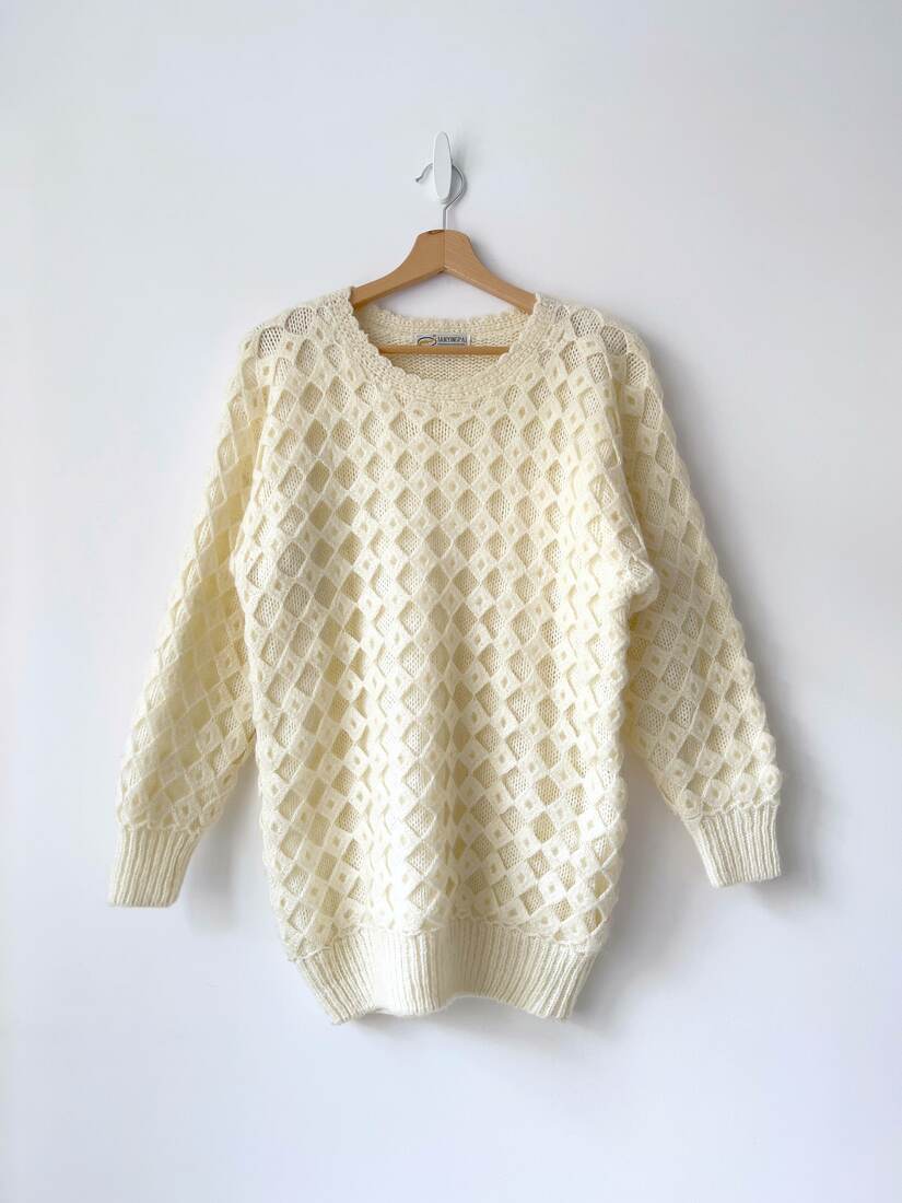 Sweter vintage ze zdobieniem. Brak metki z dokładnym składem, ale jest to angora, może nawet w 100 %. Sweter bardzo miękki i nie gryzie. Ma obszerniejsze ramiona, zdjęcie na xs-ce.