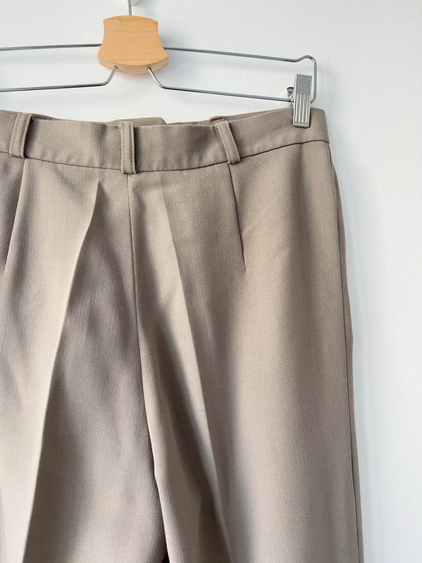 Spodnie o klasycznym fasonie. Metka ze składem jest mało czytelna, jest to mieszanka wełny oraz poliestru, z małym dodatkiem elastanu. Rozmiar z metki 42, idealny stan.