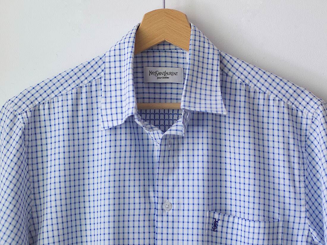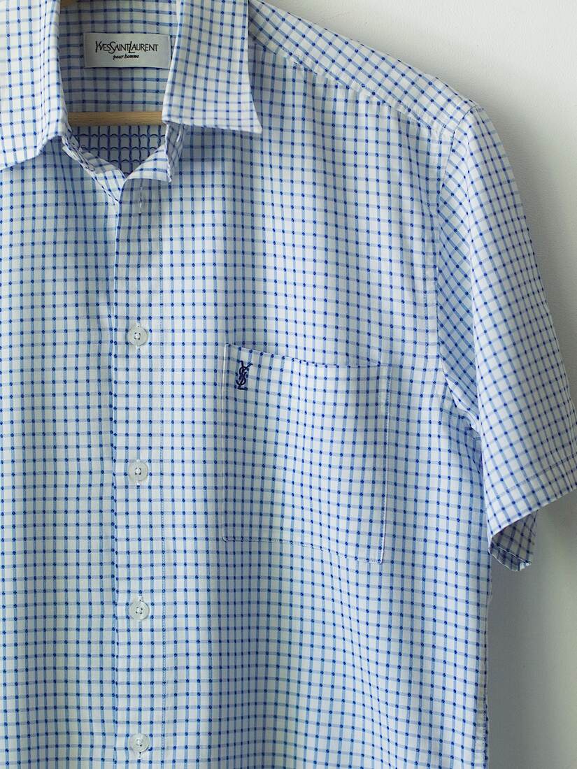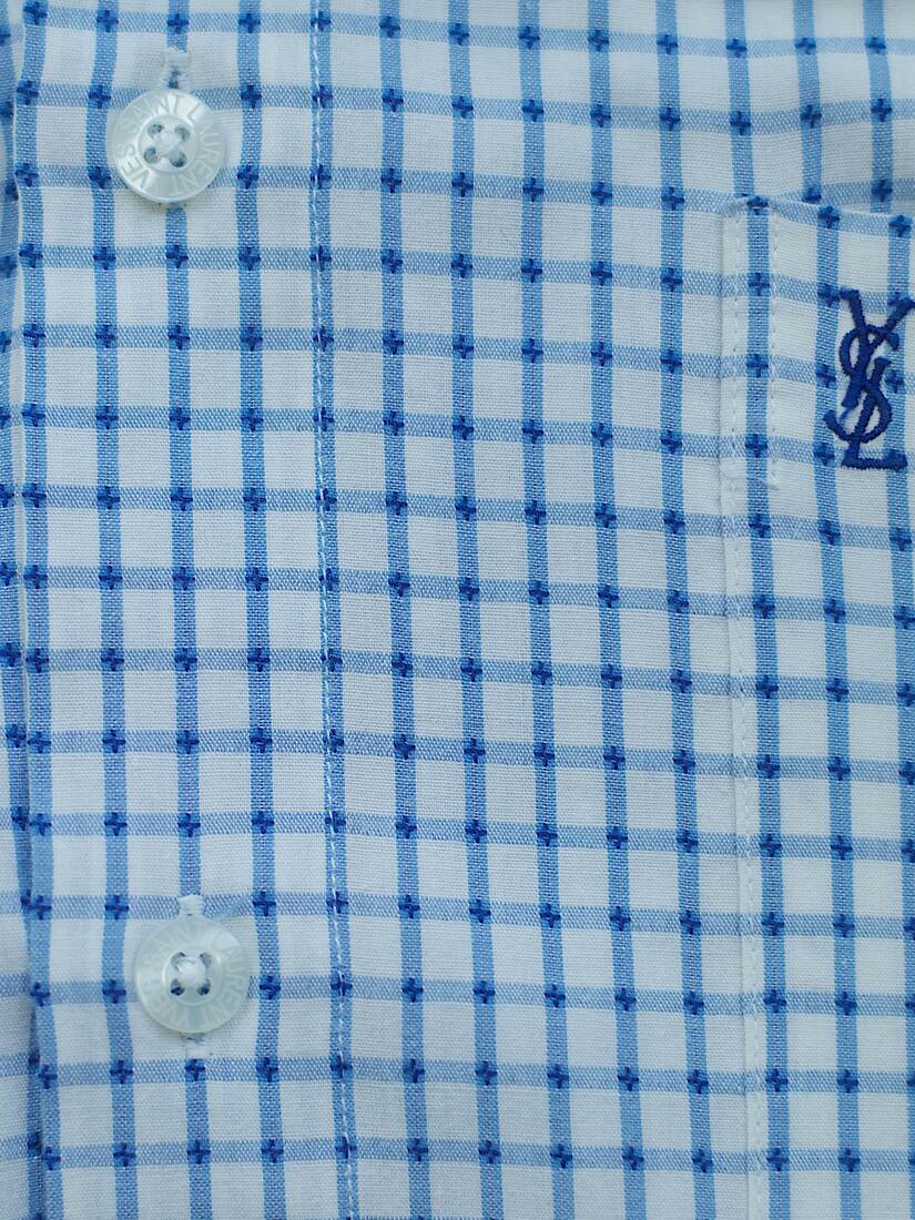 Koszulka francuskiego domu mody Yves Saint Laurent. Logowane guziki, logo na kieszeni. Rozmiar M (model męski), skład 65%poliester, 35% bawełna, bez wad.