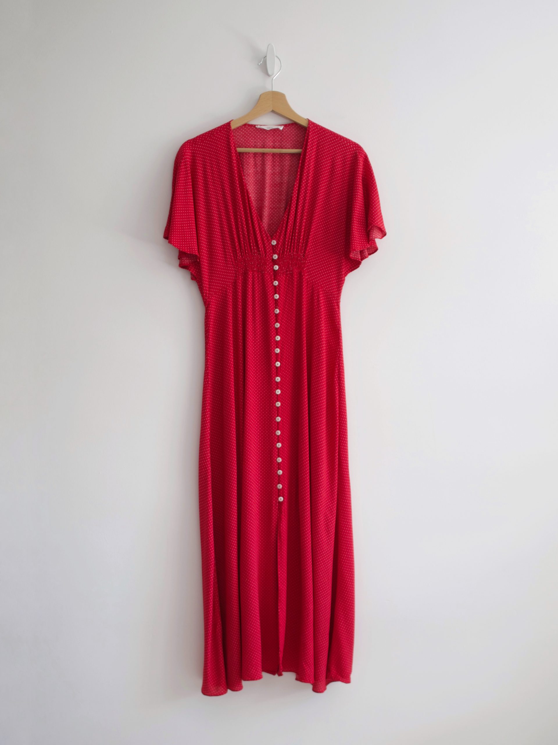 Jedwabna sukienka w orientalnym stylu. Prosty krój, z tyłu zapinana na zamek. Będzie pasować na S-M, polecam dla osoby wysokiej. Wymiary poniżej, bez wad.