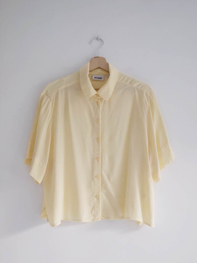Koszula skandynawskiej marki Weekday w pastelowym kolorze. W 100% wykonana z wiskozy. Rozmiar z metki S, koszula ma bardzo luźny fason, więc polecam jako one size. Bez wad.
